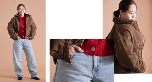 季節感たっぷりの茶色ボア付きアウターが上品なボリューム感を演出。赤のニットセーターが顔まわりを明るく見せ、血色感アップの効果も。スタッズ入りのバレルデニムで個性をプラスしつつ、ゆったりしたシルエットが脚のラインを自然にカバー。甘さと辛さを絶妙に掛け合わせた大人の抜け感スタイルです!