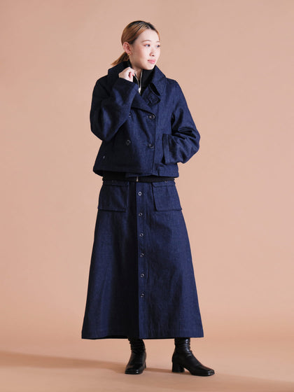 今回のコーデはセットアップで着用していますが、単体でのコーディネートもしやすいのが特徴です。コートは中にベストがついており2WAYで着用ができ、着丈がすっきりしているので低身長の方でもサイズ感に困りません!また、スカートにはフロントにボタンと、大きめのポケットのデザインによりキレイめにもカジュアルにも合わせられる万能なアイテムとなっています。