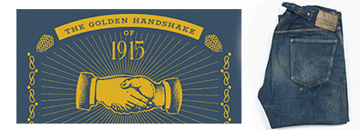 アモスケイグ社に代わりコーンミルズ社の生地が使われるようになった1915年。リーバイス®はコーンミルズ社のデニム生地を独占的に使う「ゴールデンハンドシェイク」と呼ばれる提携を結びました。コーンミルズのレッドセルビッジデニムが用いられ、バックポケットにもリベットが施されました。