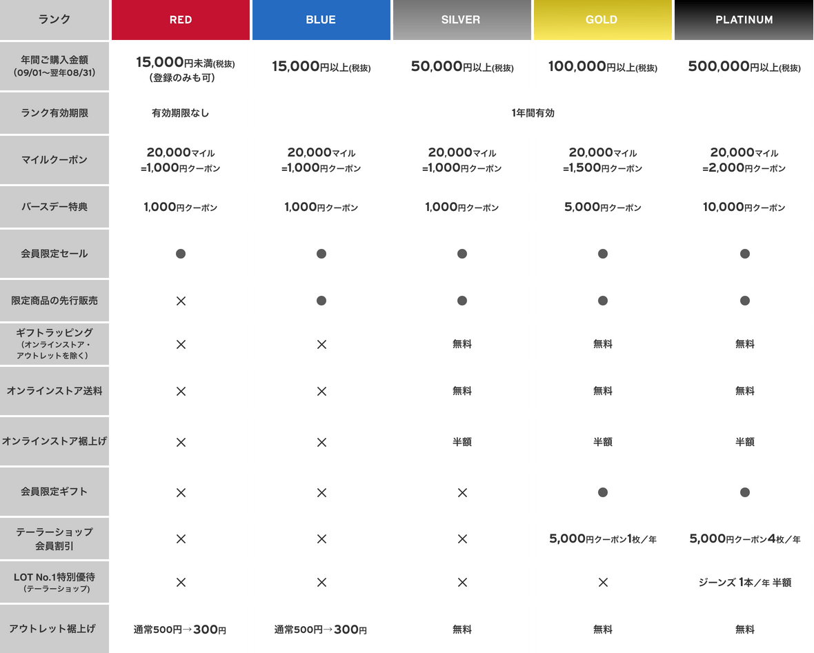 オンラインストア及び店舗でのご購入金額に応じて、レッド、ブルー、シルバー、ゴールド、プラチナの5つのランクがあり、ランクに応じて特典がご利用いただけます。