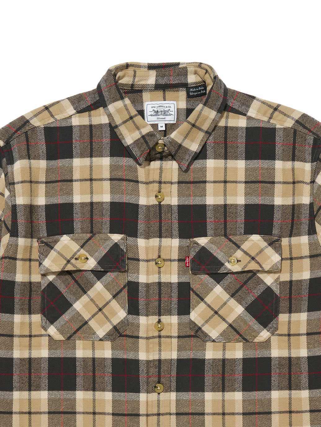 このプレイドシャツは、JJJJoundのシグネチャーであるワークシャツをベースに、コットン100%の起毛素材を使用。さらに、裾にプリントされたJJJJoundのロゴスタンプ、バックネックに刺繍、胸ポケットにはLevi’s®レッドタブが付属します。