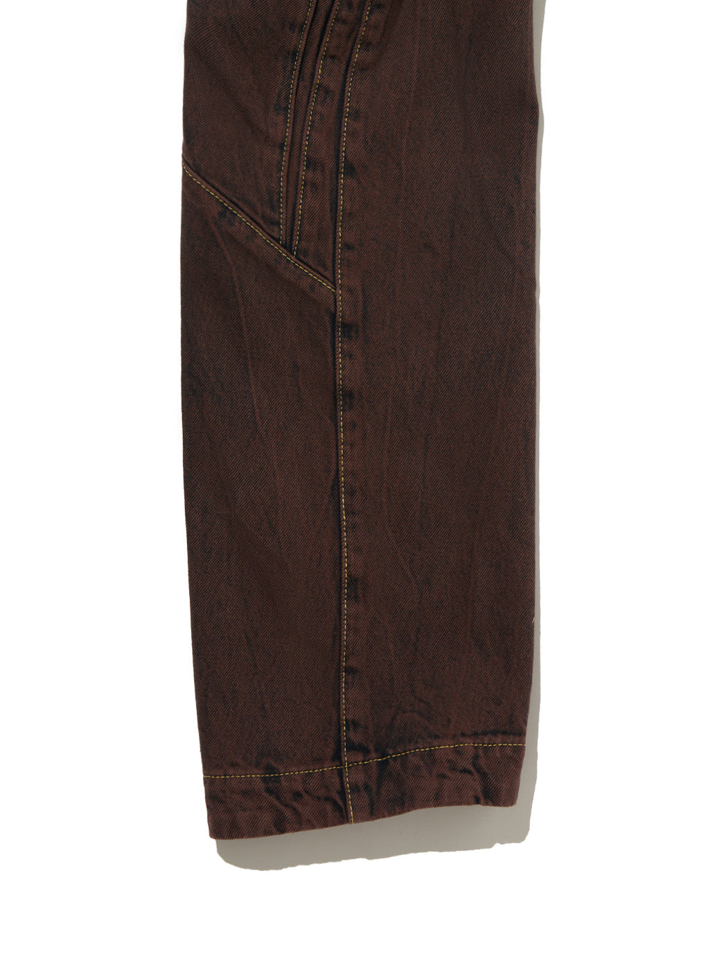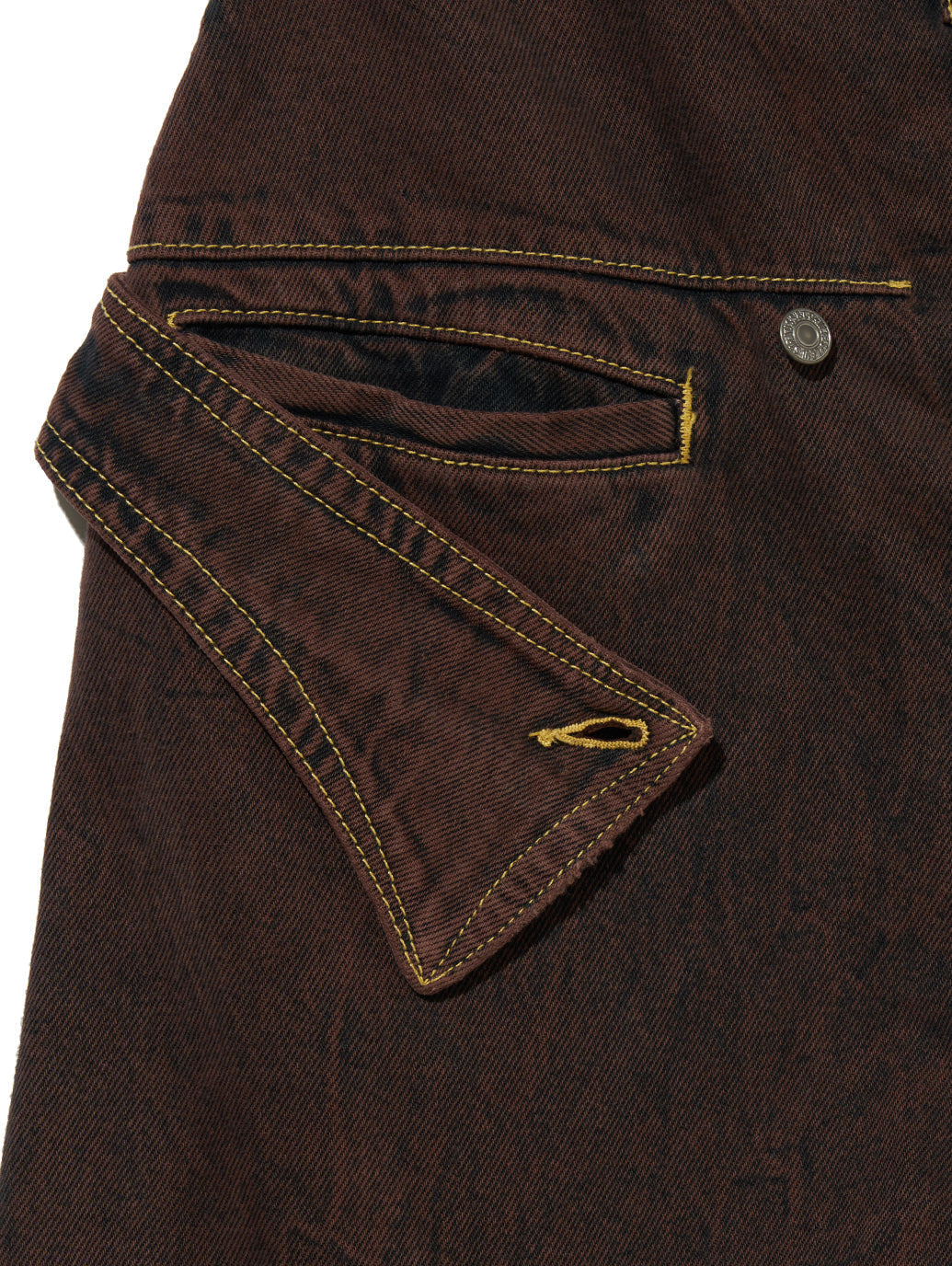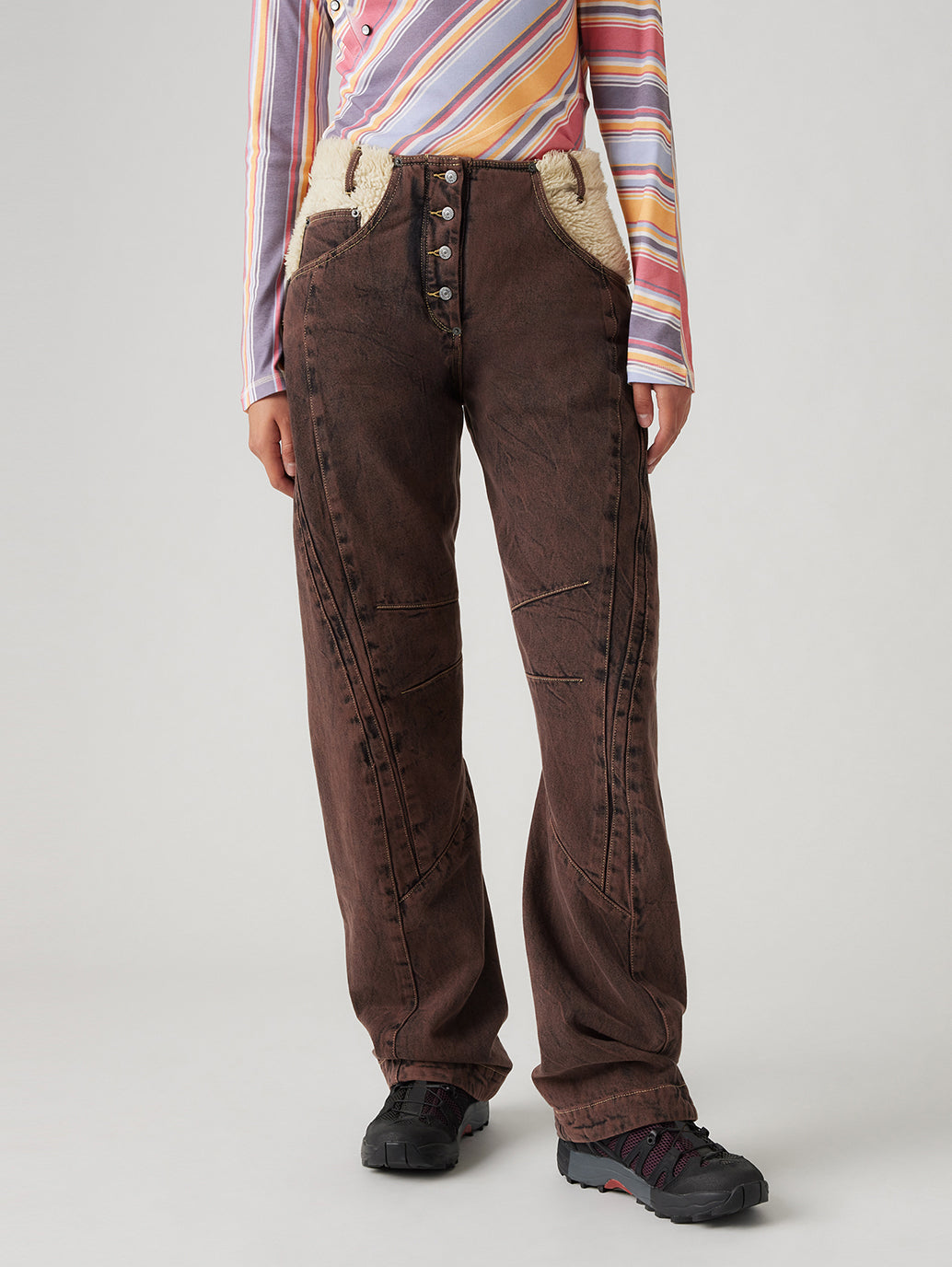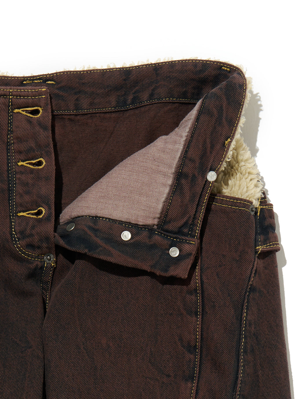 ガーメントダイによってひび割れた質感のあるブラウンに仕上げたインディゴデニムのジーンズは、ねじれた縫い目が裾まで伸び、フロントポケットとウエストバンドの部分はシェルパパネルに切り替わるデザインです。ジャクロン素材で作られたダブルネームのパッチが付属します。