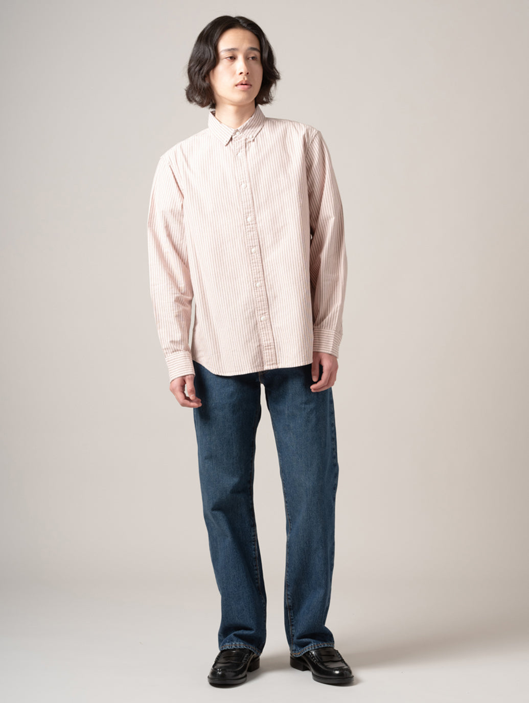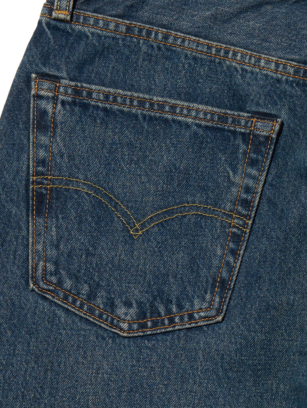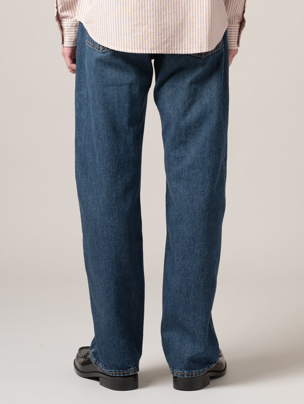 クラシックなストレートジーンズのオマージュとして、ヒップ部分がゆったりとした「アンチフィット」スタイルで、リラックス感のあるゆったりとしたストレートシルエットのパンツ。耐久性に優れた綿100%の生地、ムラが無く色落ち加工を最小限のした品も感じるミッドカラーです。色落ちの経年変化も楽しみながら穿いて頂きたい一本です。 model:181cm B89 W68 H83 着用サイズ:33inch