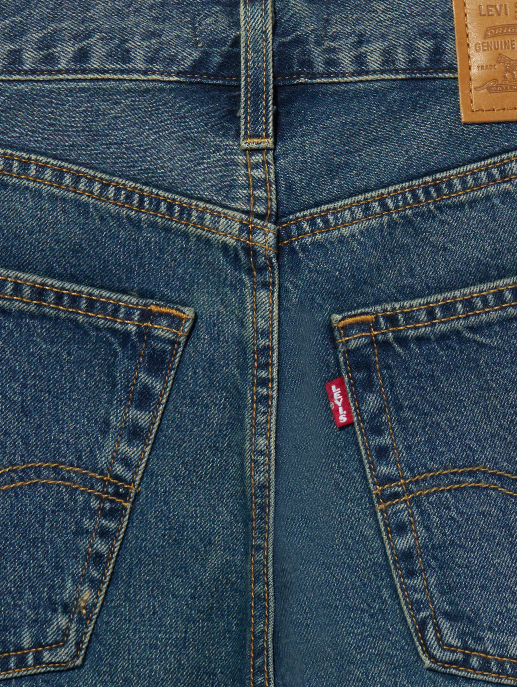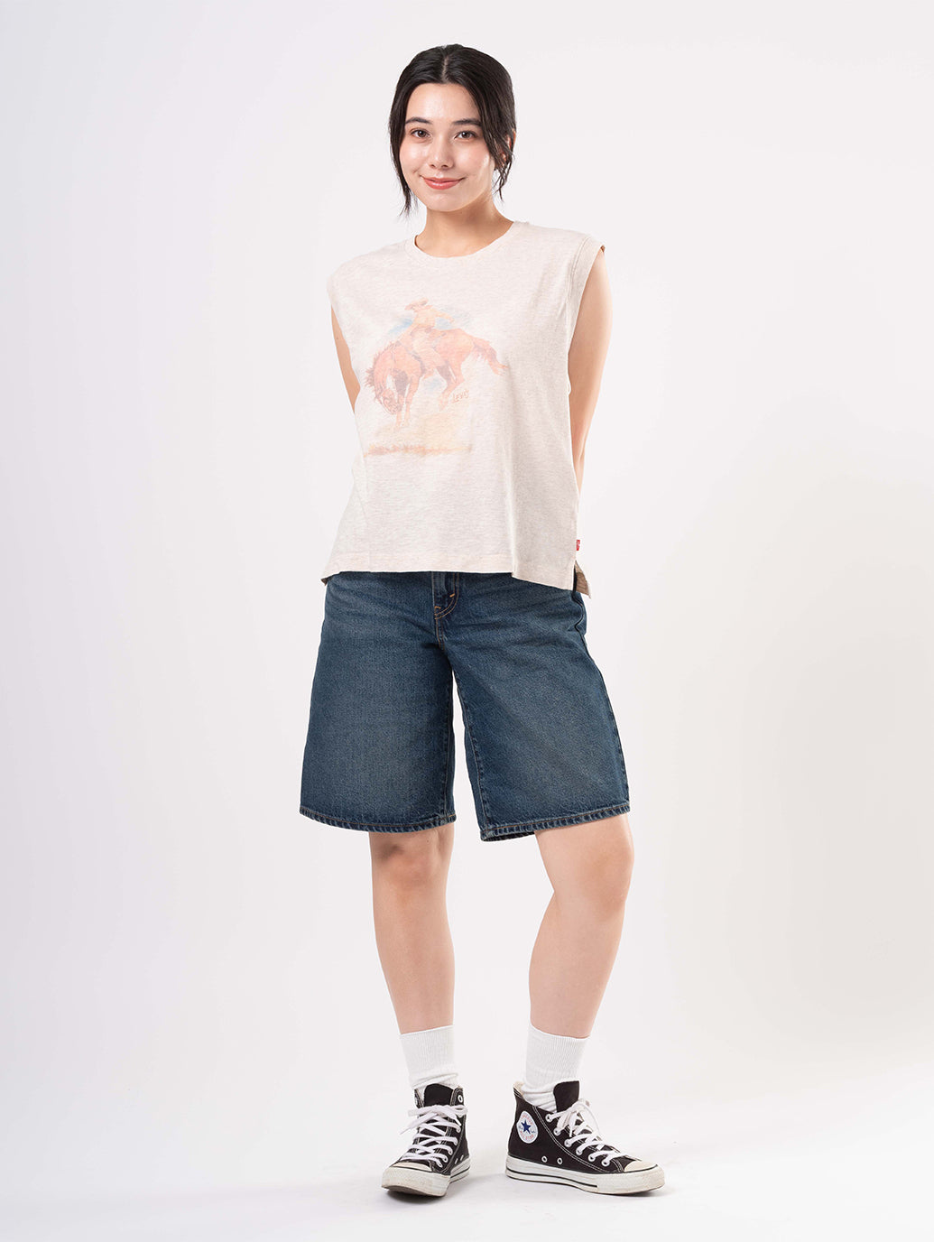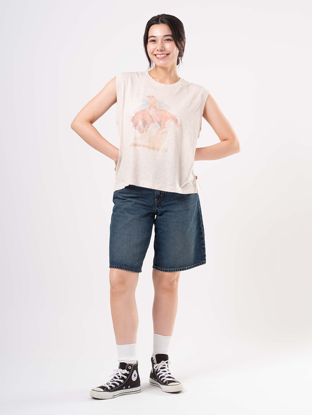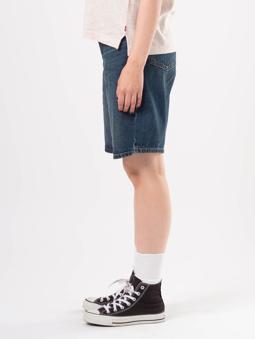 バギーなショートジーンズがトレンドのカラーでデザインされました。綿100%のリラックス感のあるミッドライズのストレートレッグジーンズ。余裕を持たせ、さりげなくエッジィな雰囲気にすることで、ゆったりしながらもシルエットが引き立ちます。お気に入りのスニーカーと合わせれば、いつでもクールな90年代のルックを楽しめます。