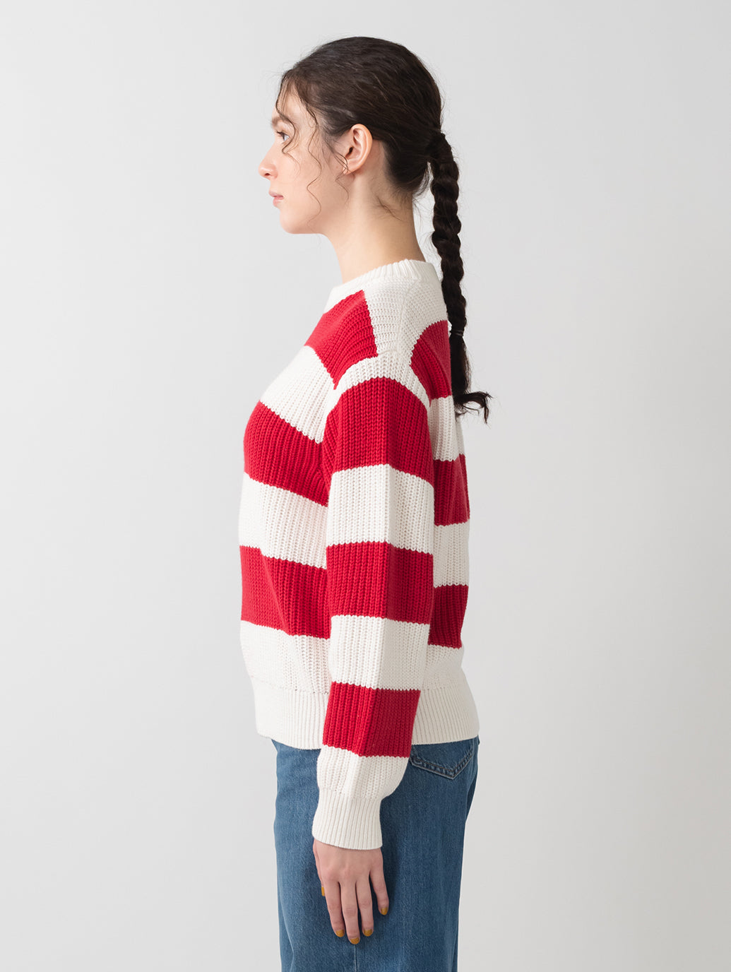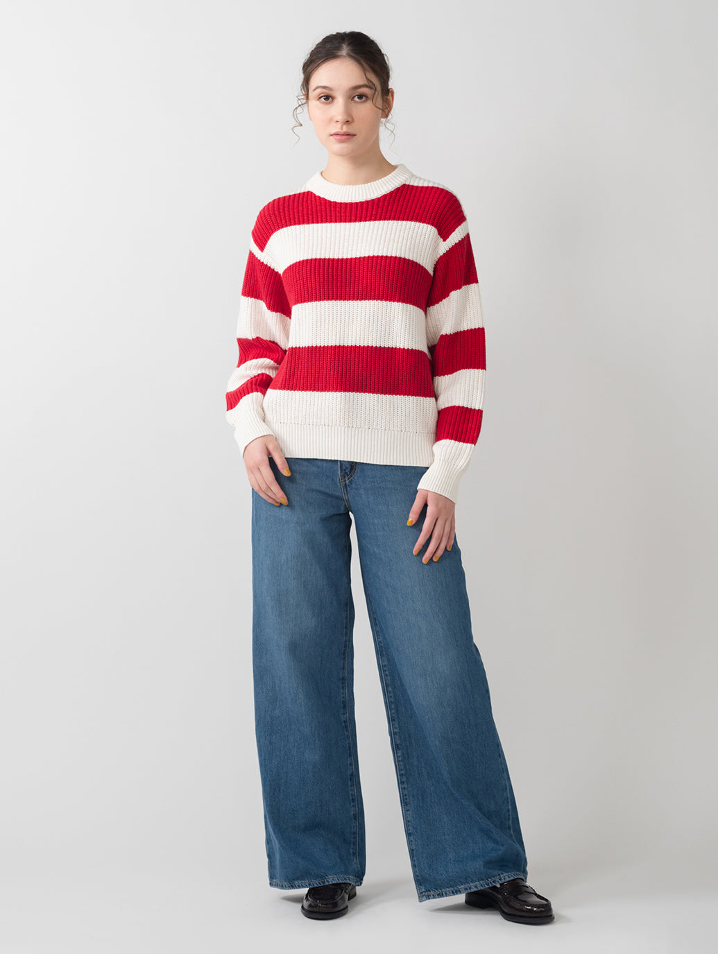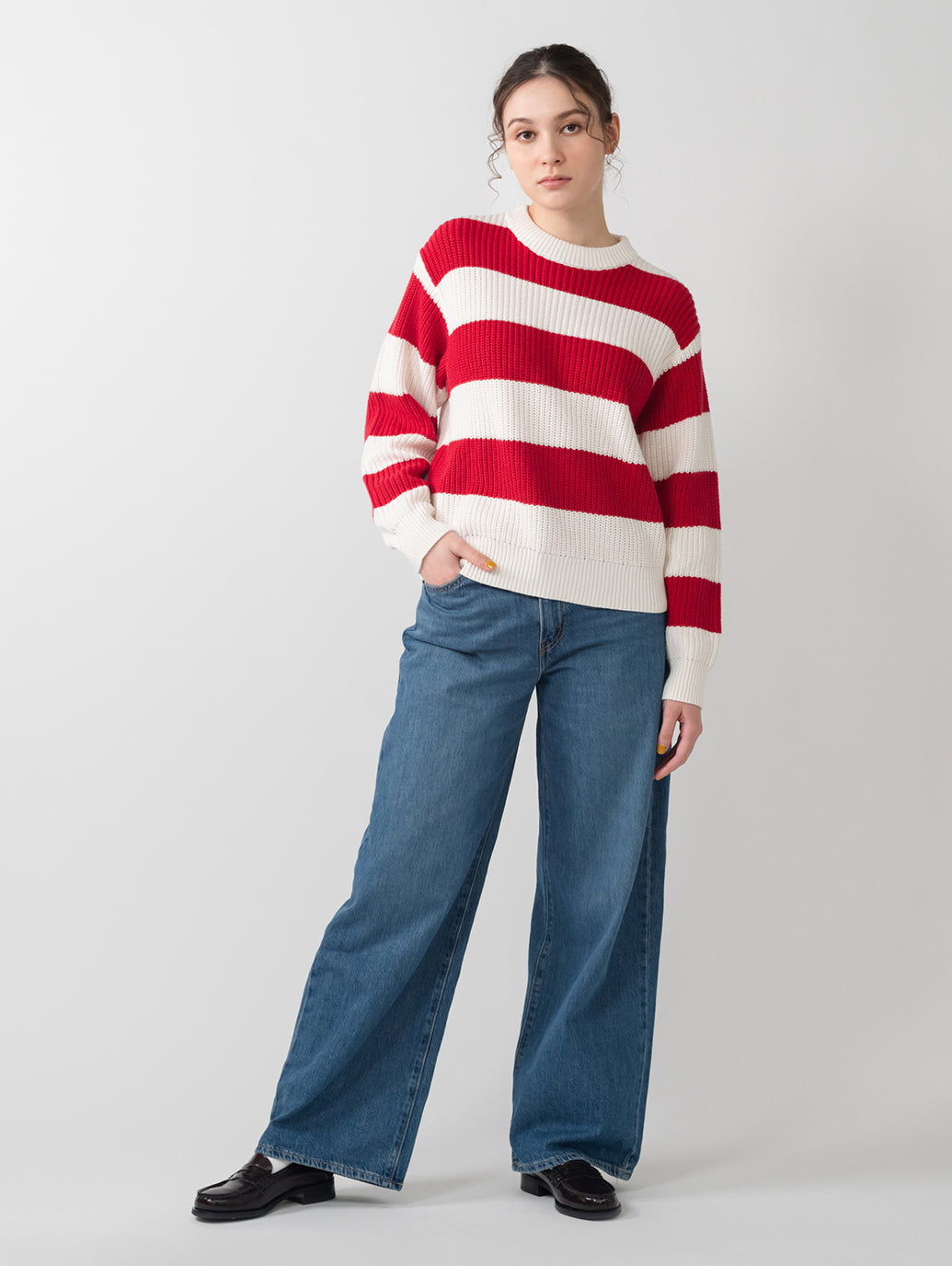 どんなジーンズとも相性ピッタリなセーターがデザインされました。幅広いボーダーで柔らかい印象を与えてくれるクルーネックのリラックスフィットです。縁がリブ編みで汎用性の高い一枚です。