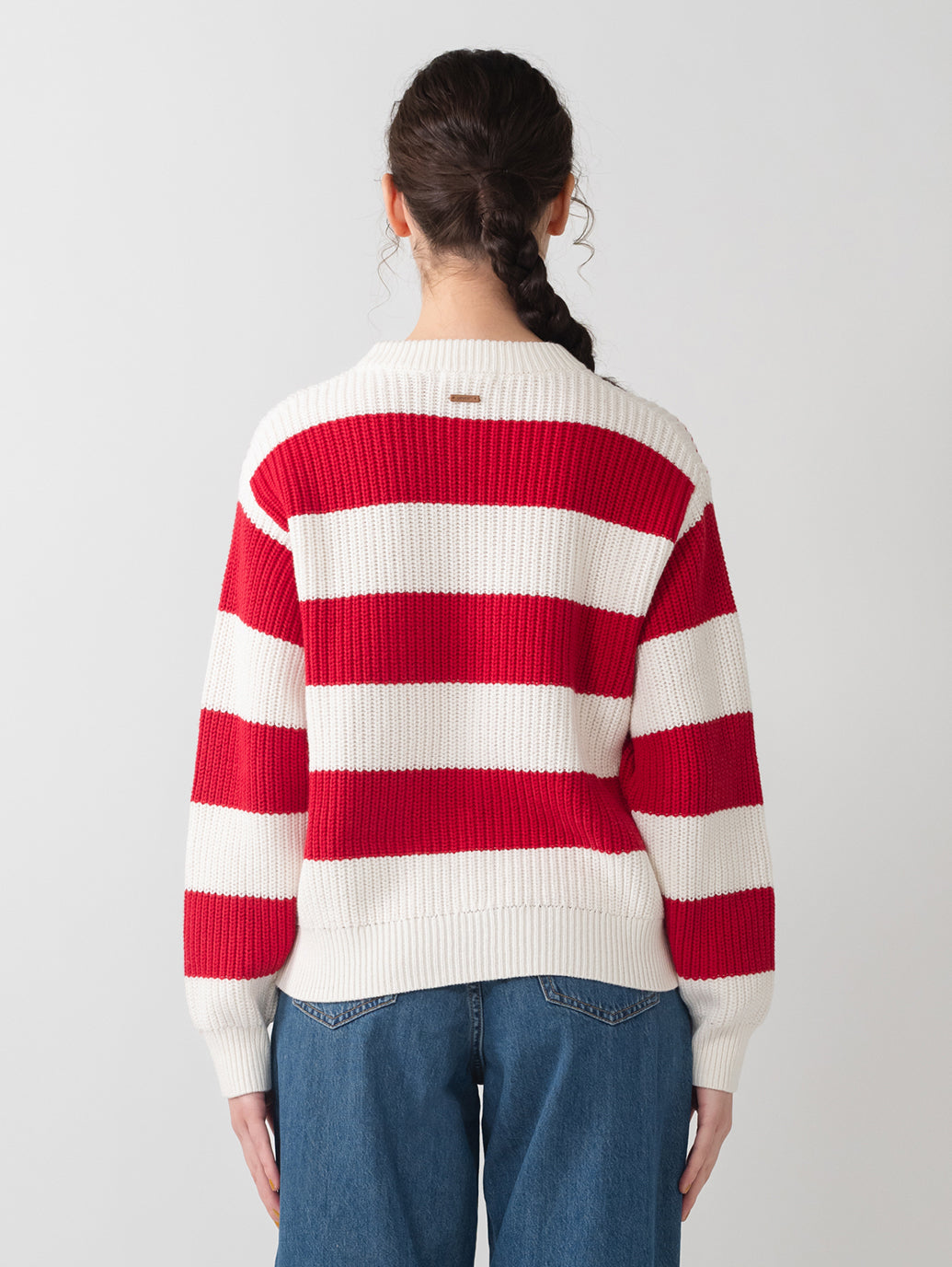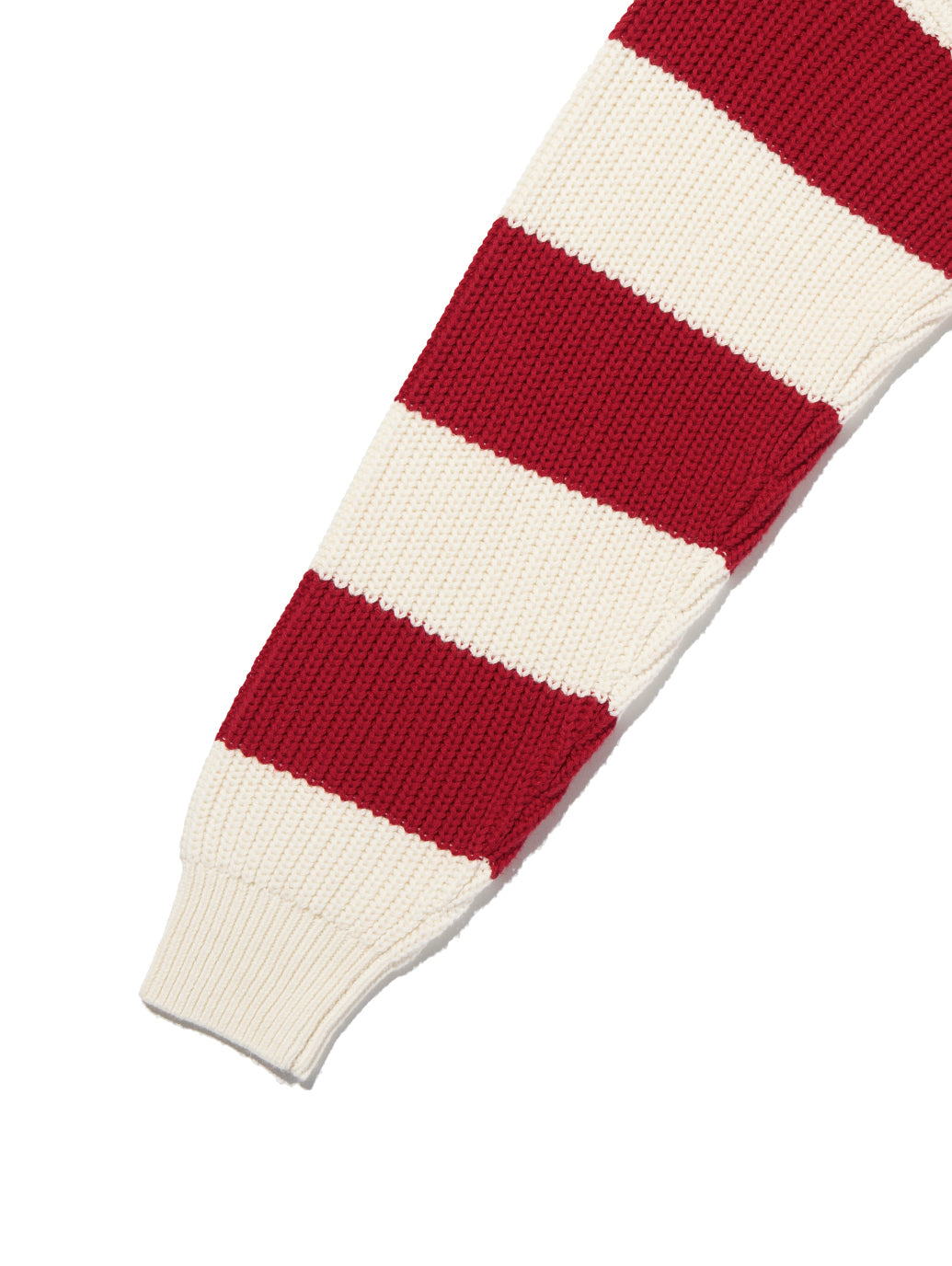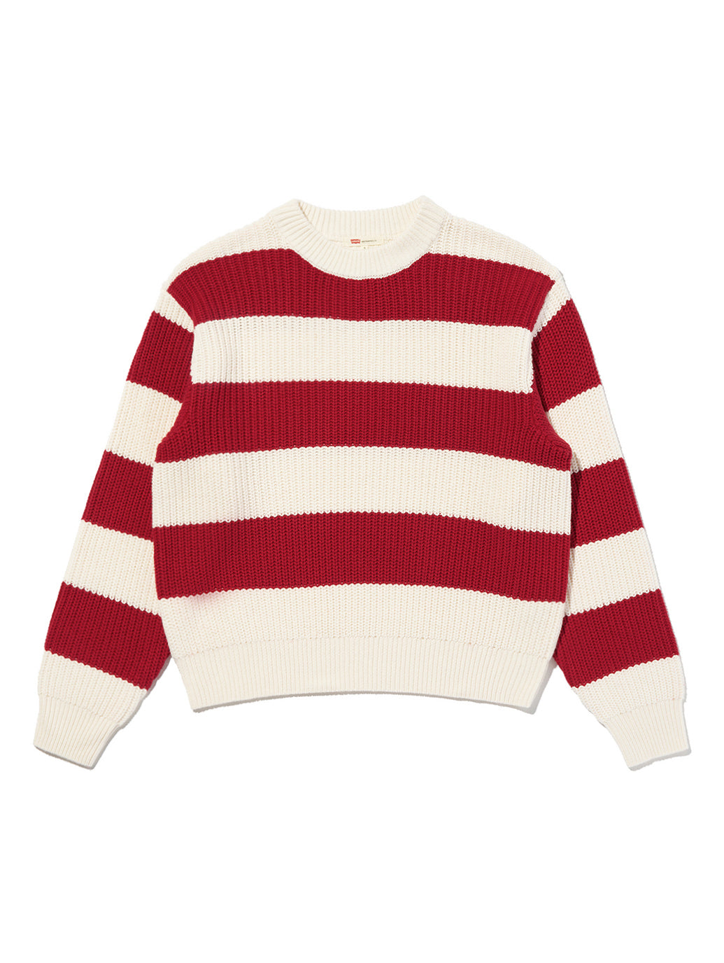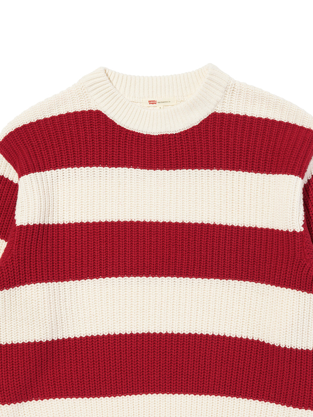 どんなジーンズとも相性ピッタリなセーターがデザインされました。幅広いボーダーで柔らかい印象を与えてくれるクルーネックのリラックスフィットです。縁がリブ編みで汎用性の高い一枚です。
