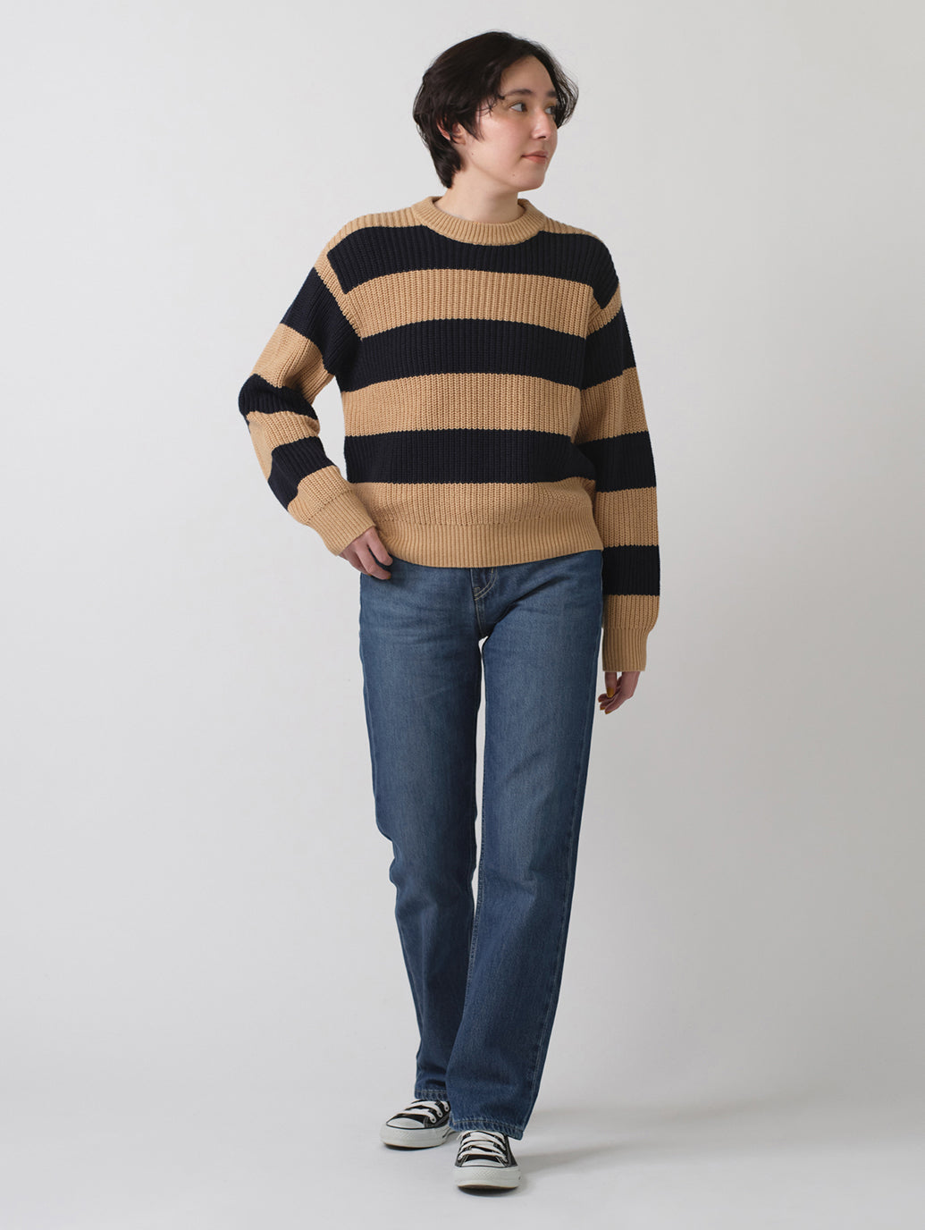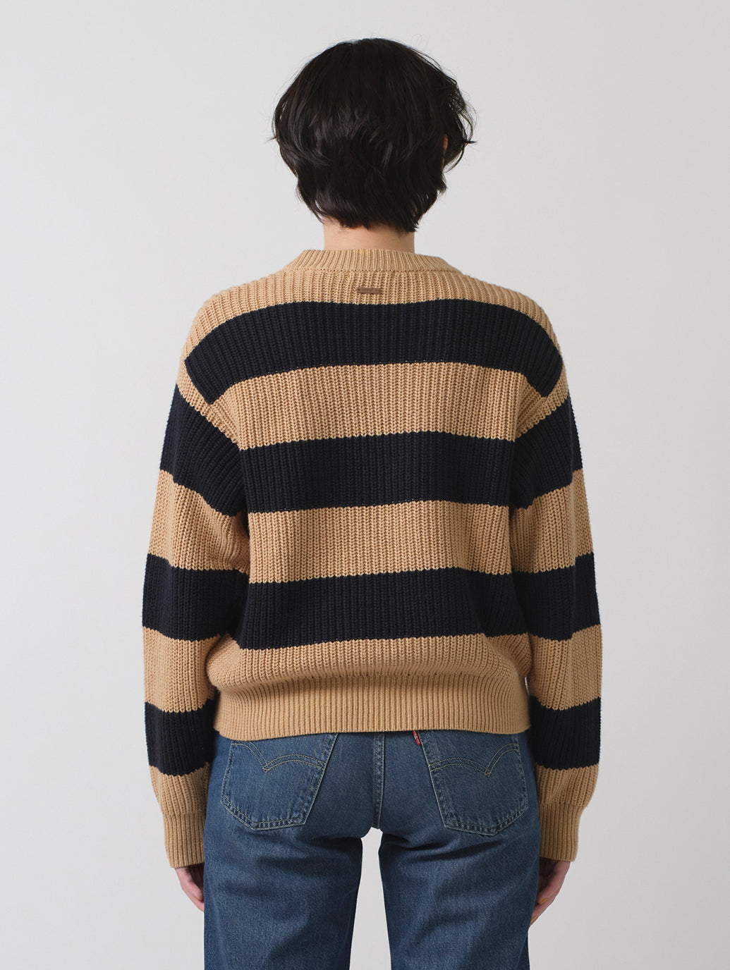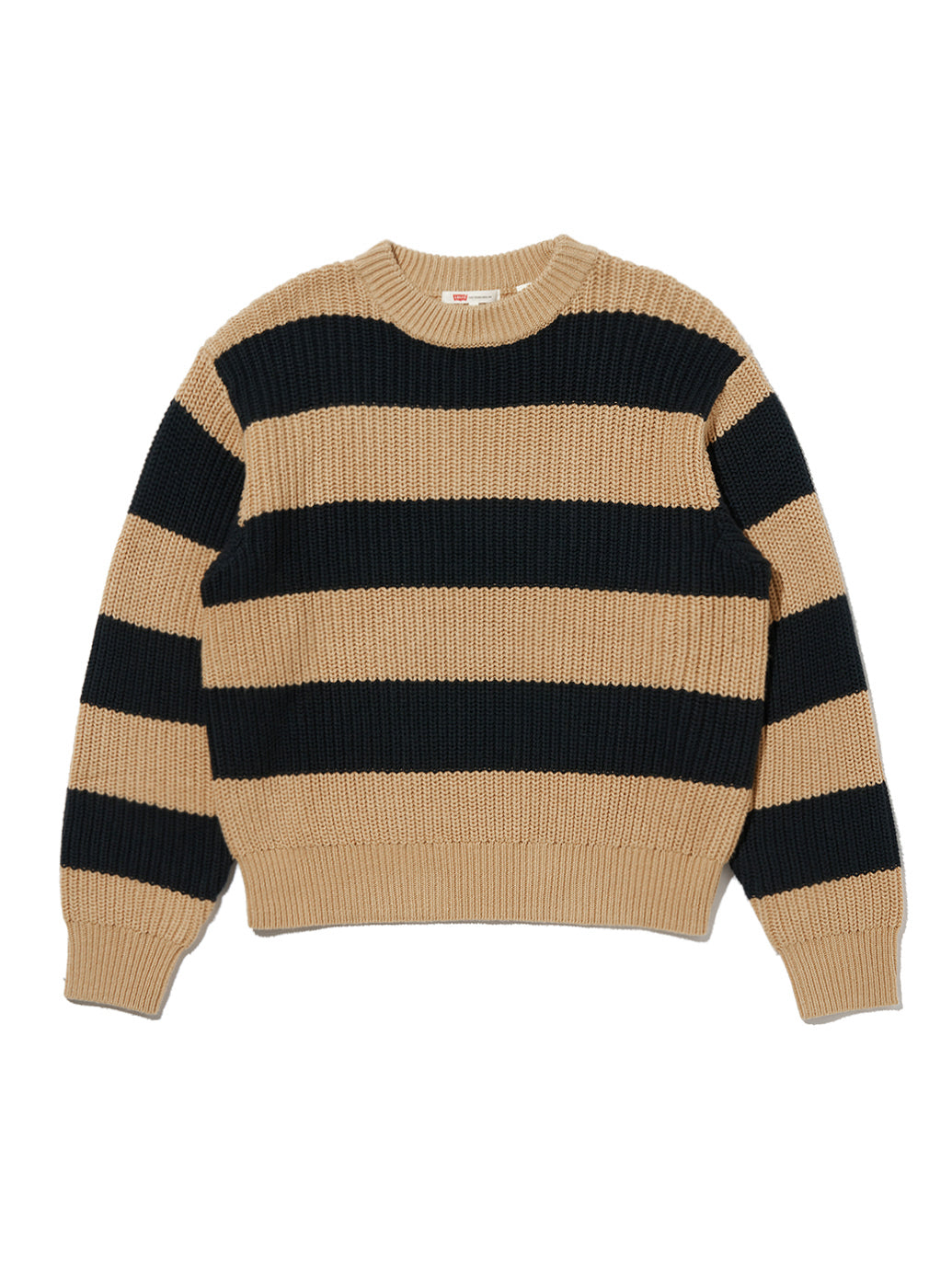 クルーネックのリラックスフィットで、縁がリブ編みのストライプデザインで着心地の良いセーターが登場しました。どんなジーンズとも相性ピッタリの一枚です。