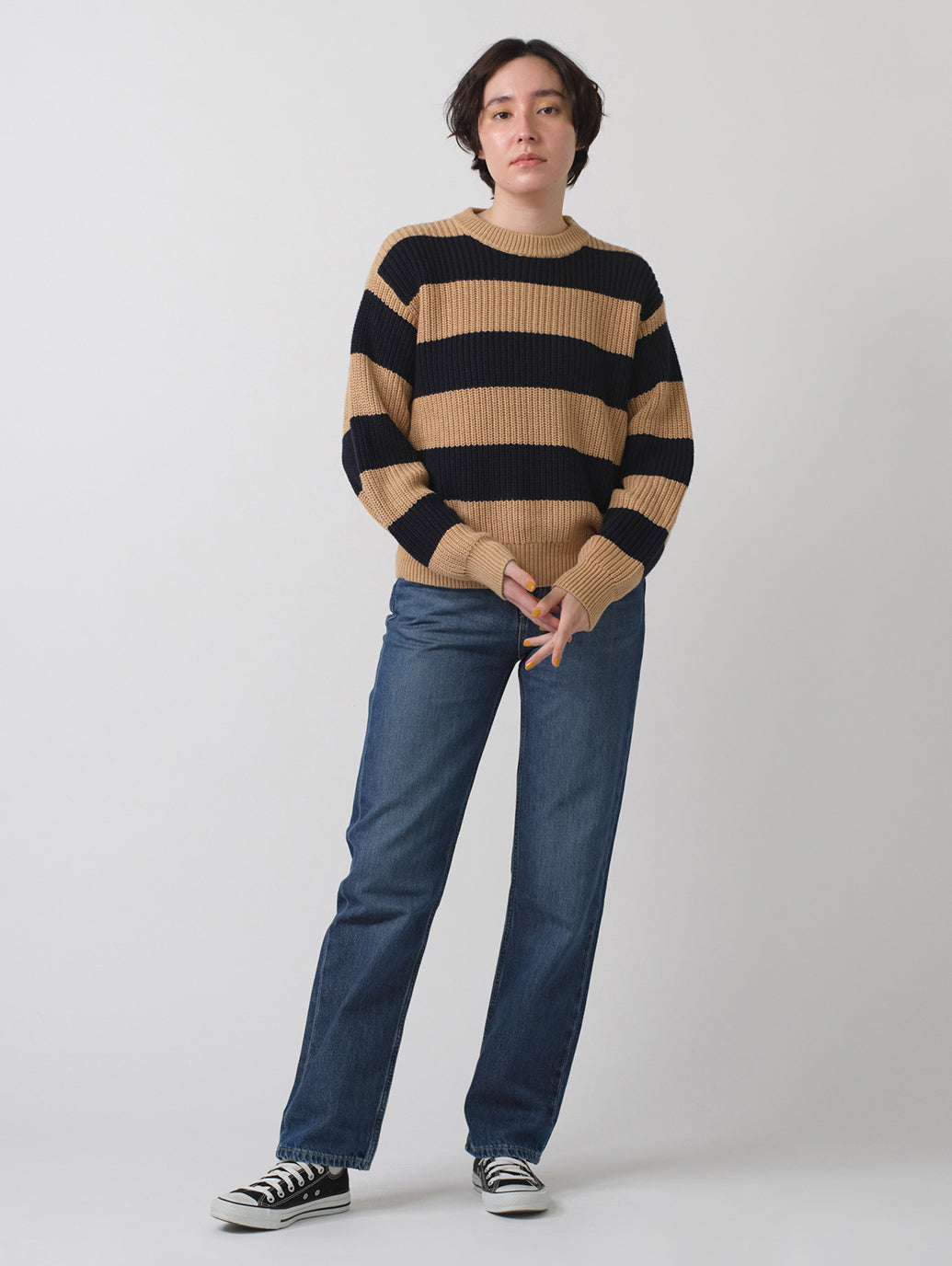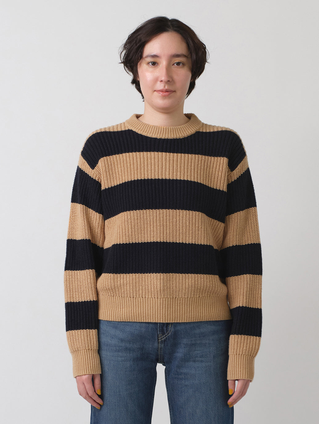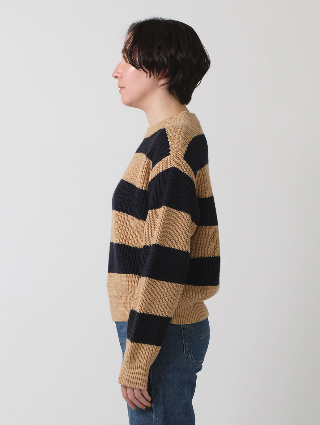 クルーネックのリラックスフィットで、縁がリブ編みのストライプデザインで着心地の良いセーターが登場しました。どんなジーンズとも相性ピッタリの一枚です。