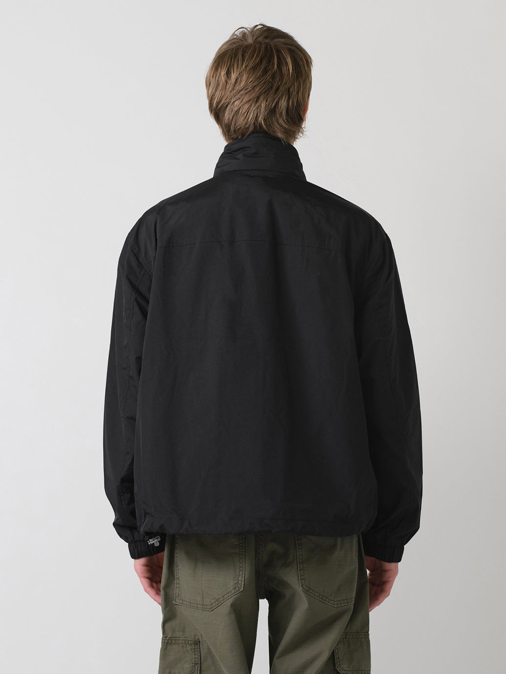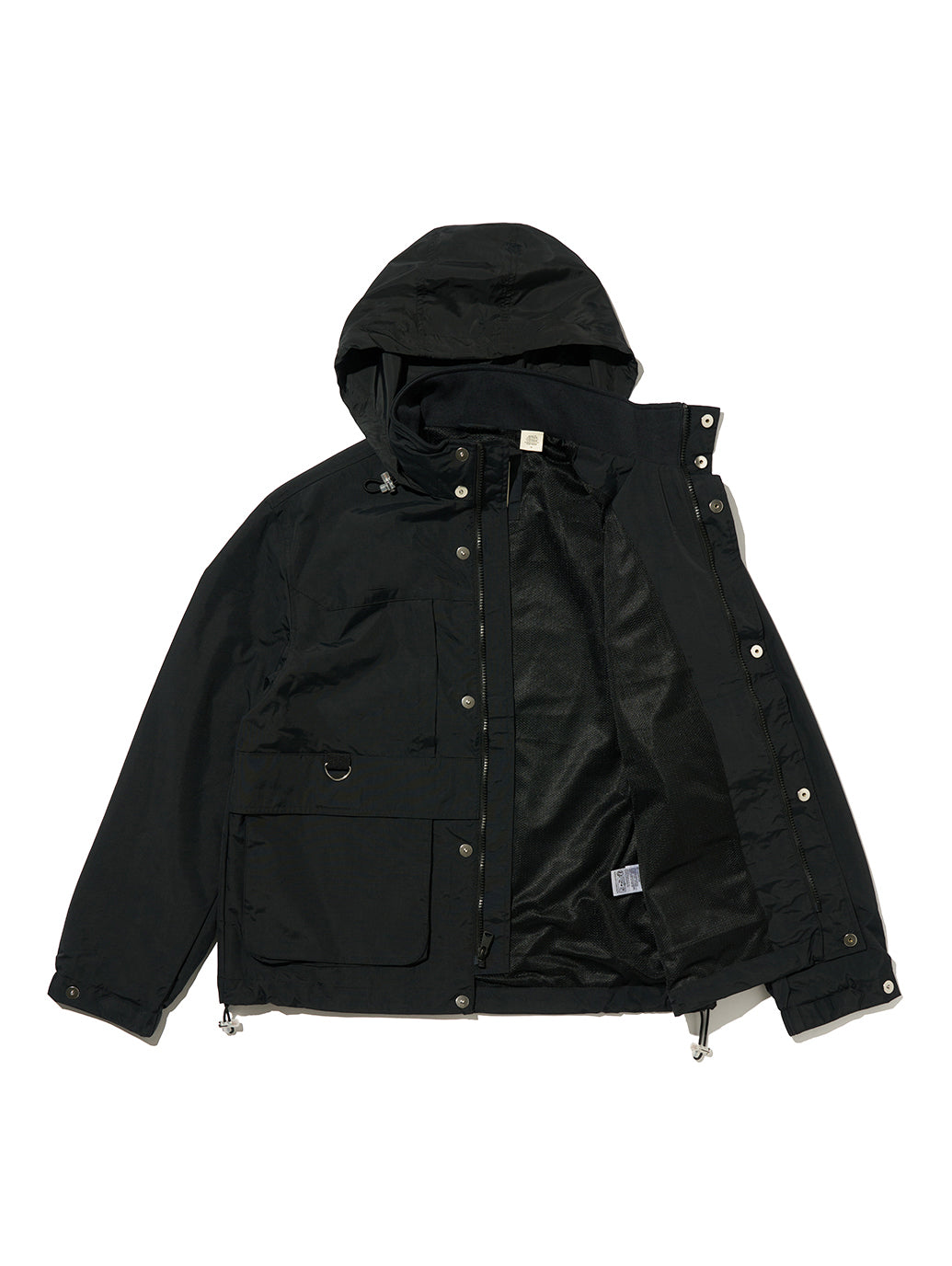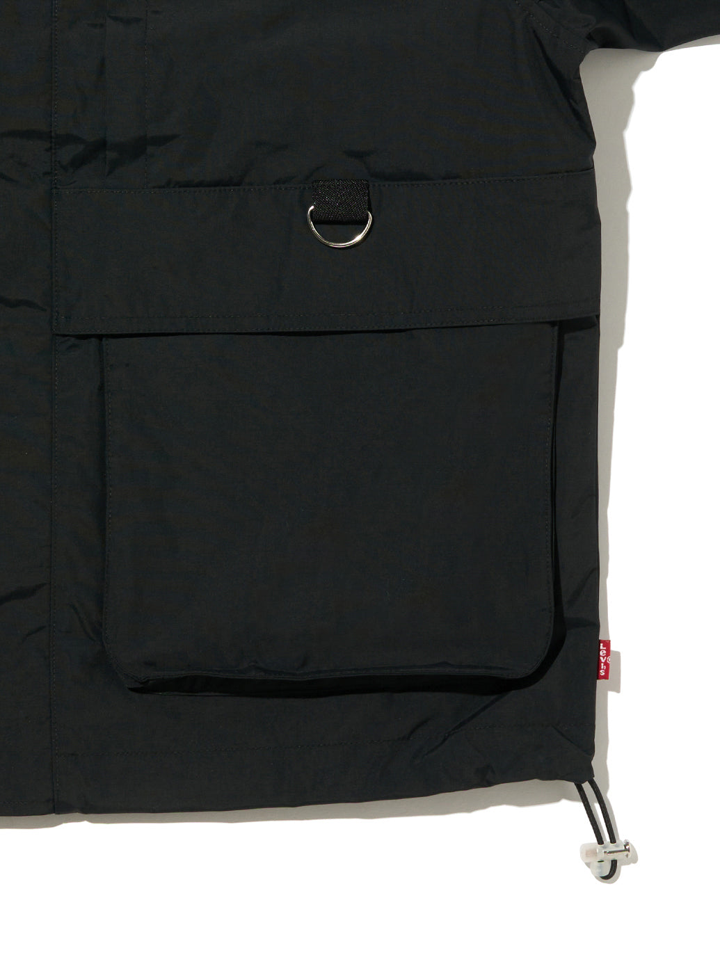 ナイロン生地のジップアップユーティリティジャケット。ブラックカラーのゆったりとしたボックスシルエットのボディ、フロントに配された4つのポケットが特徴です。裾部分はドローコード仕様でお好みでアジャストしてシルエットに変化を出すことも出来ます。幅広い季節、スタイリングで活躍する一着です。