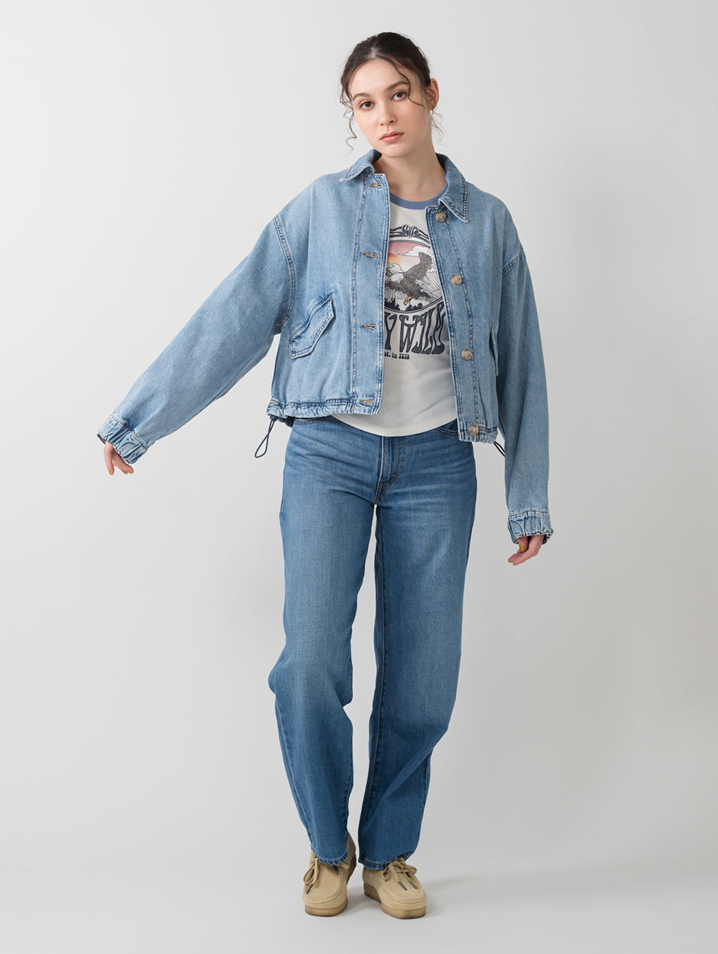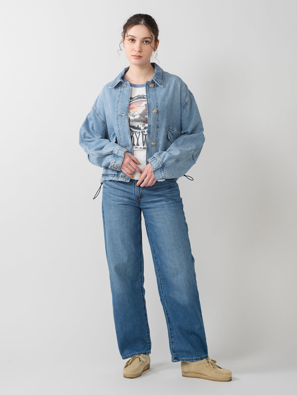 Levi'sのJanisユーティリティジャケットを、フロントボタンアップとリラックスフィット、両側ポケットで現代風にアップグレードしました。ライトインディゴカラーのLevi's®らしいデニム生地を使用したボディの裾部分はドローコード仕様になっています。絞りを効かせて短丈シルエットを更に強調することも出来、様々な着こなしに活躍する春先にお勧めの一着です。