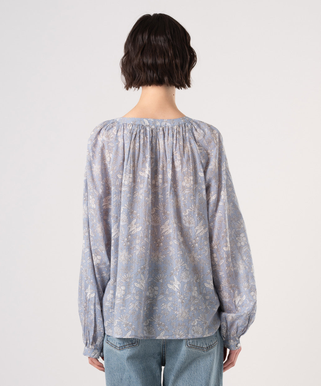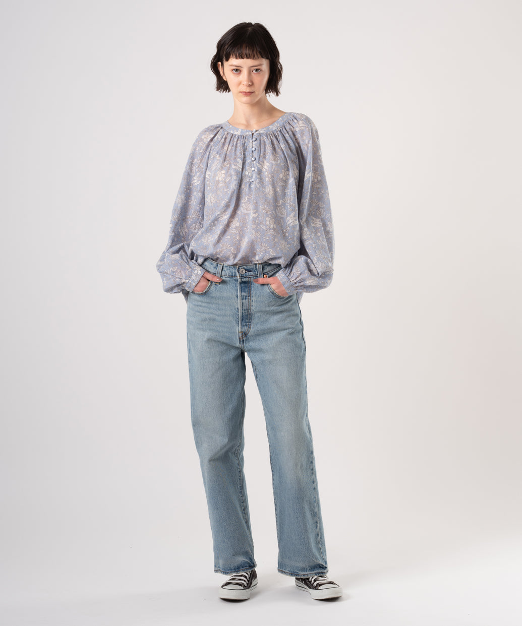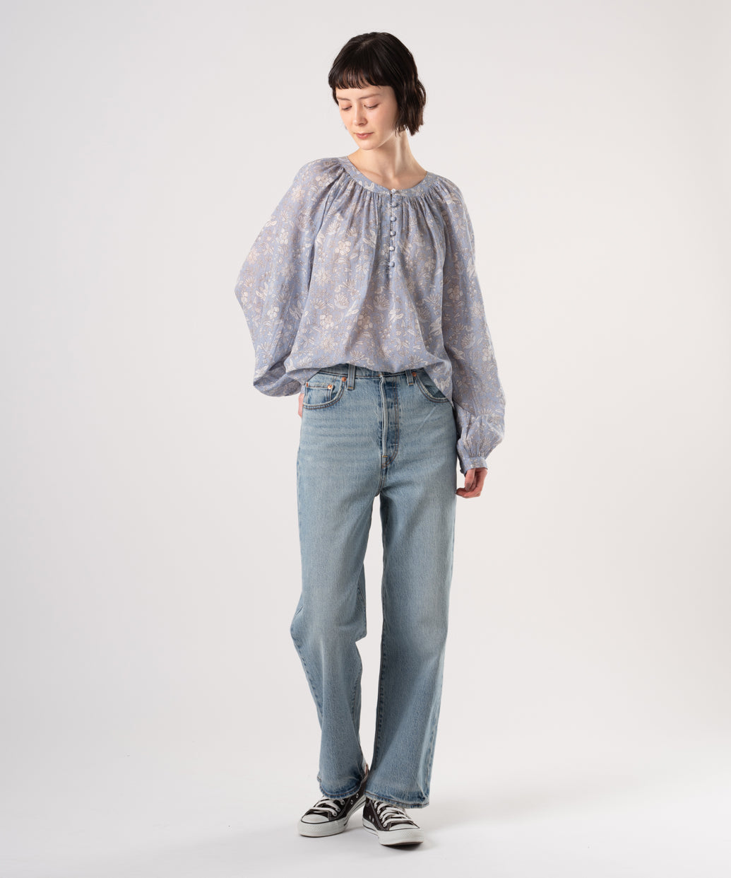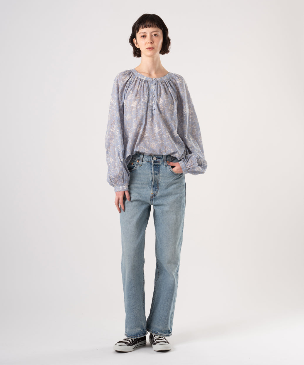 クルーネックで花柄のブルゾンスリーブのあるデザイン。ロマンティックなアイレットディテールを施しました。綿100%の生地、爽やかなホワイトカラーで春先から活躍間違いなしの一着です
