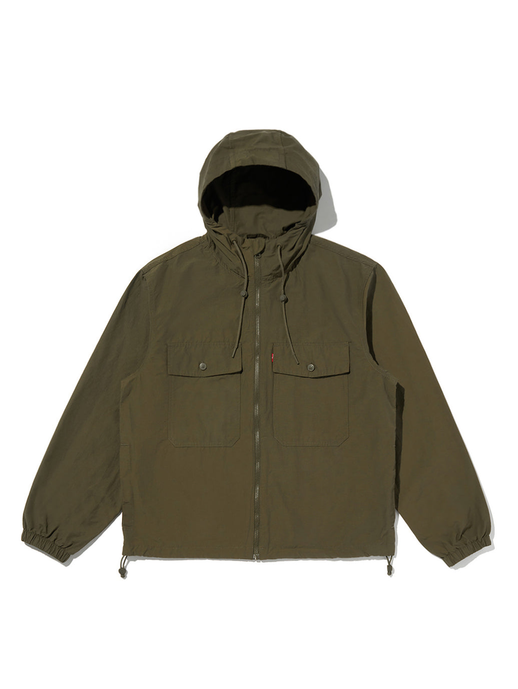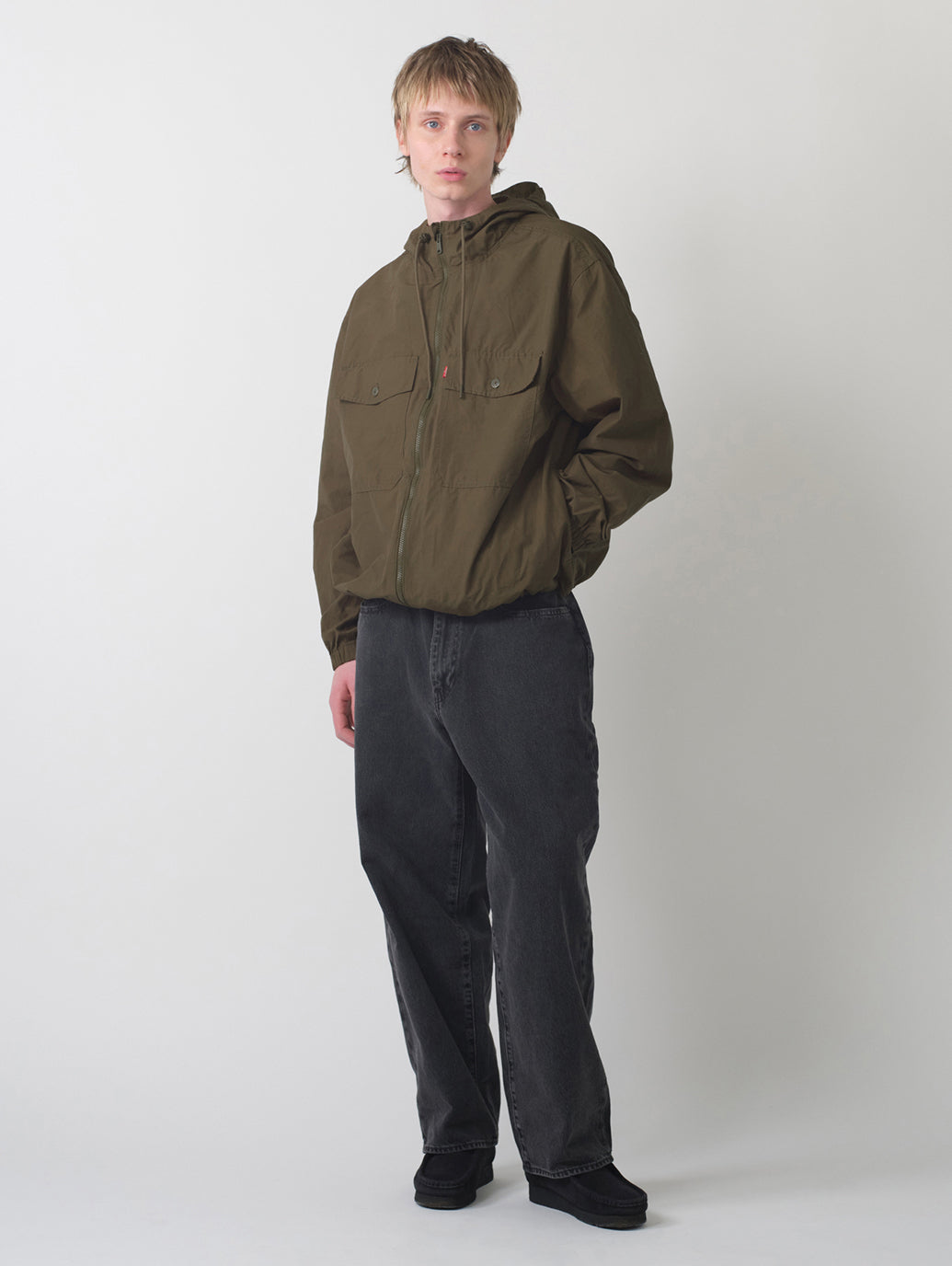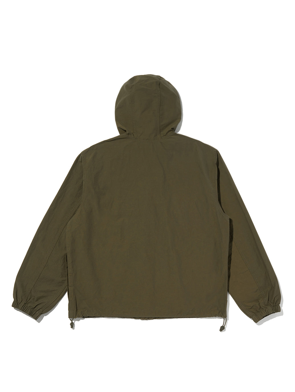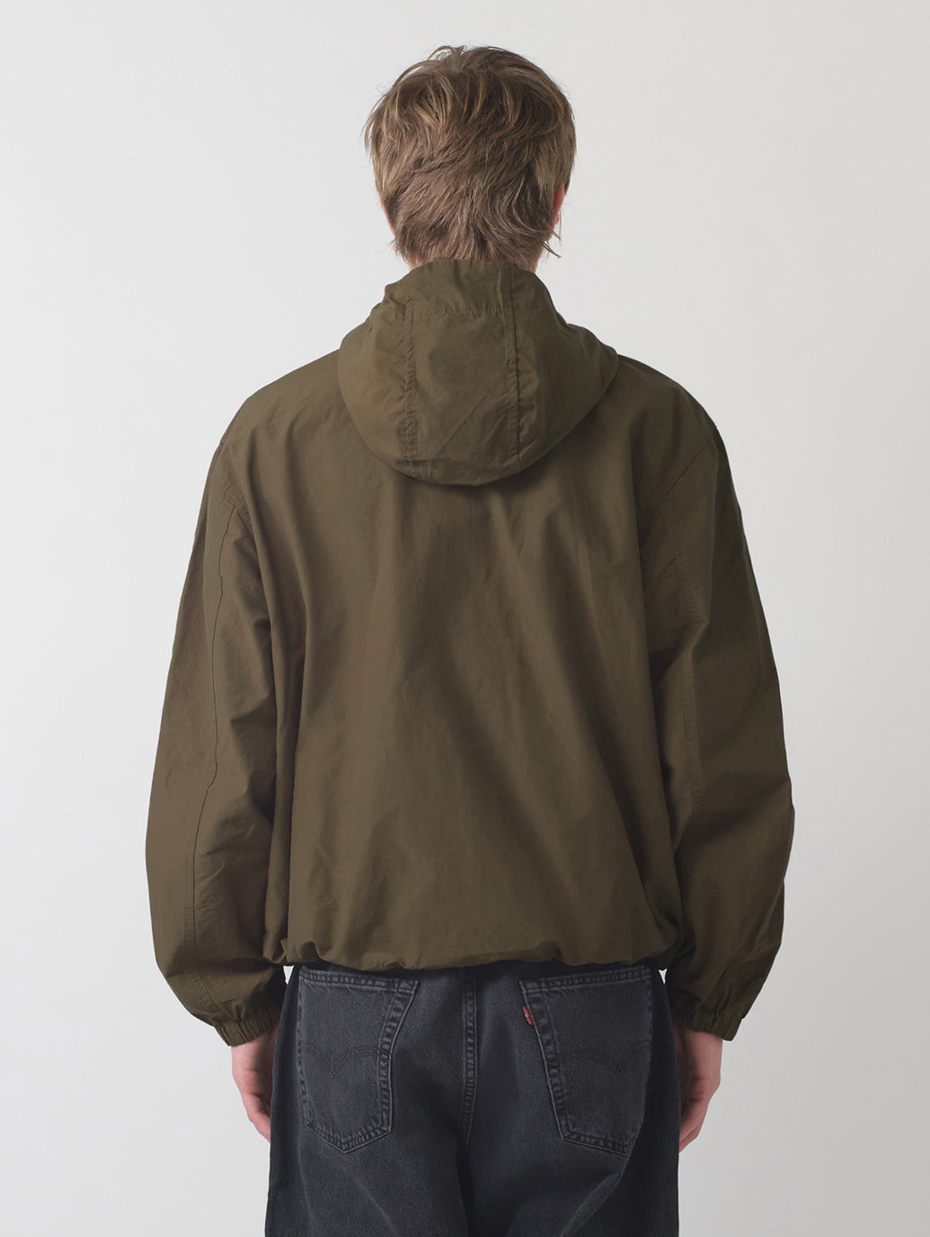 ジップアップフロント仕様のウインドブレーカー。オリーブカラーのゆったりとしたボクシーフィットのボディは、綿61%にナイロン39%を配合した生地でハリのあるが特徴です。フロントには2つのポケットを配し、裾部分はドローコード仕様なのでサイズ調整が可能です。軽く着れて、気軽に持ち運びしやすいので春先に活躍する一着です。