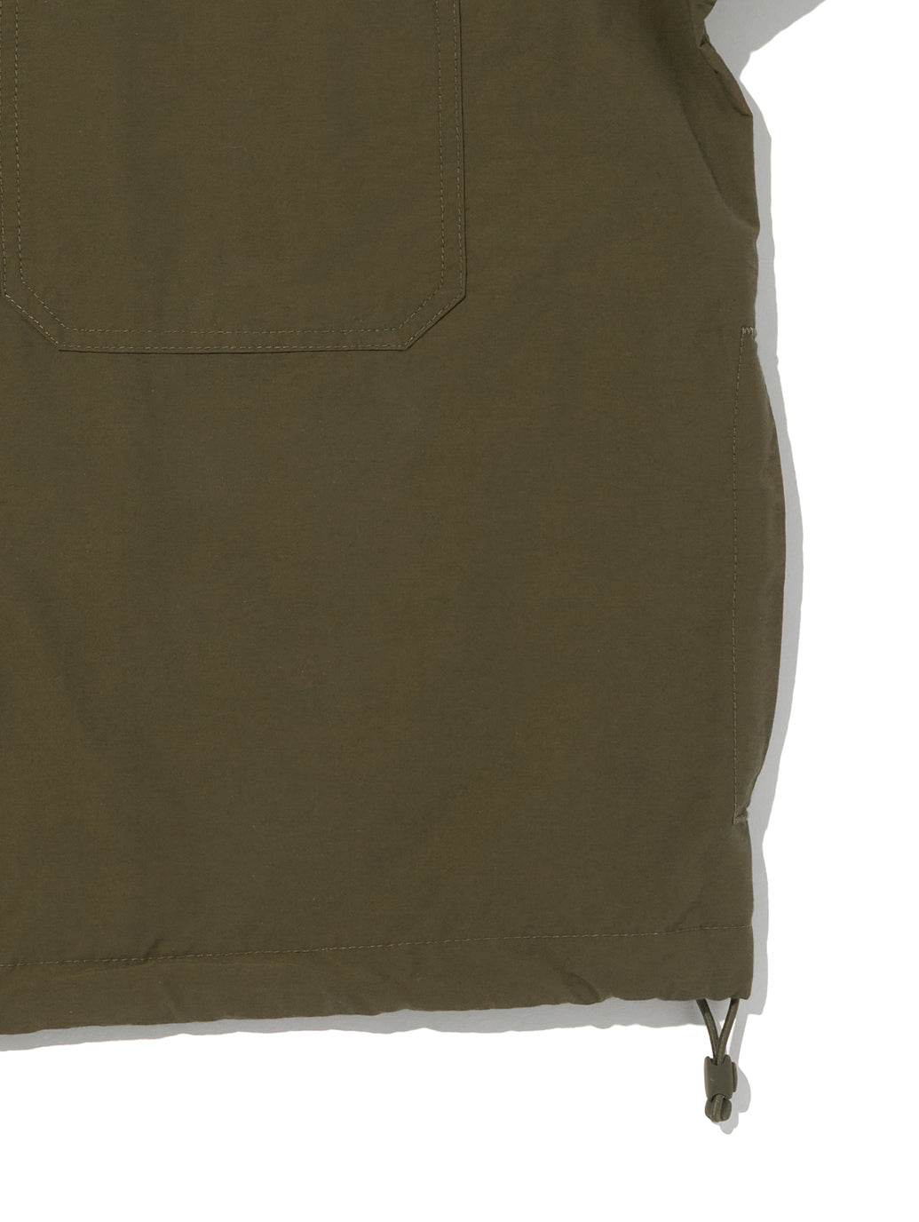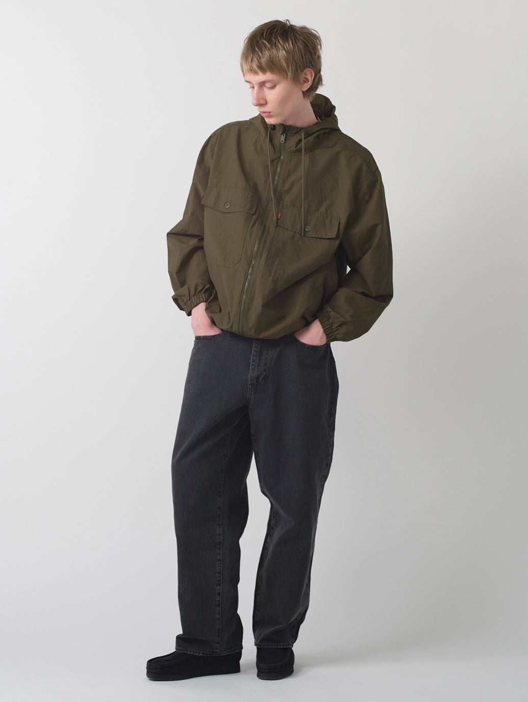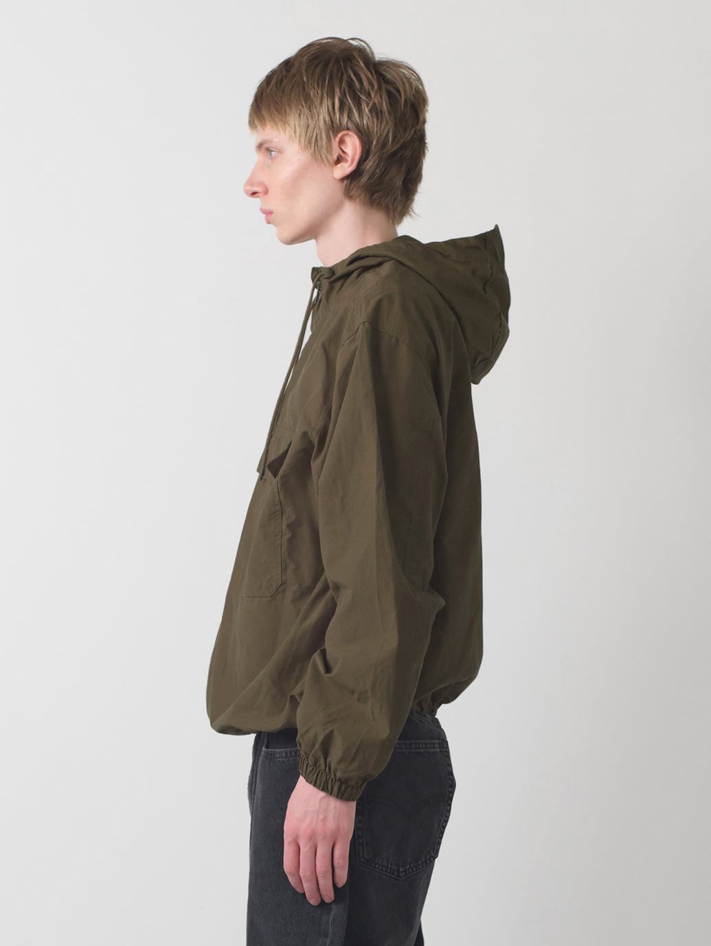 ジップアップフロント仕様のウインドブレーカー。オリーブカラーのゆったりとしたボクシーフィットのボディは、綿61%にナイロン39%を配合した生地でハリのあるが特徴です。フロントには2つのポケットを配し、裾部分はドローコード仕様なのでサイズ調整が可能です。軽く着れて、気軽に持ち運びしやすいので春先に活躍する一着です。