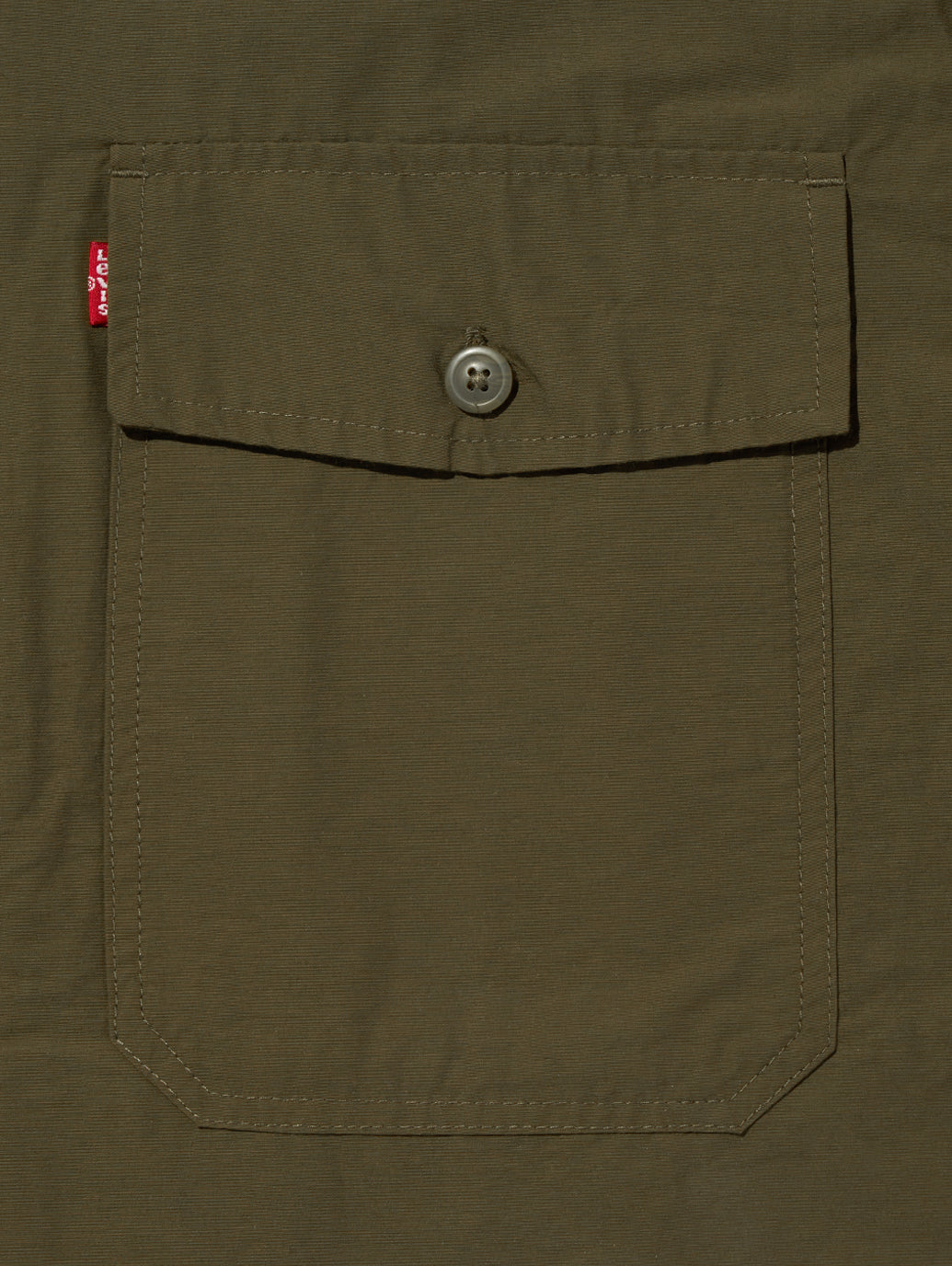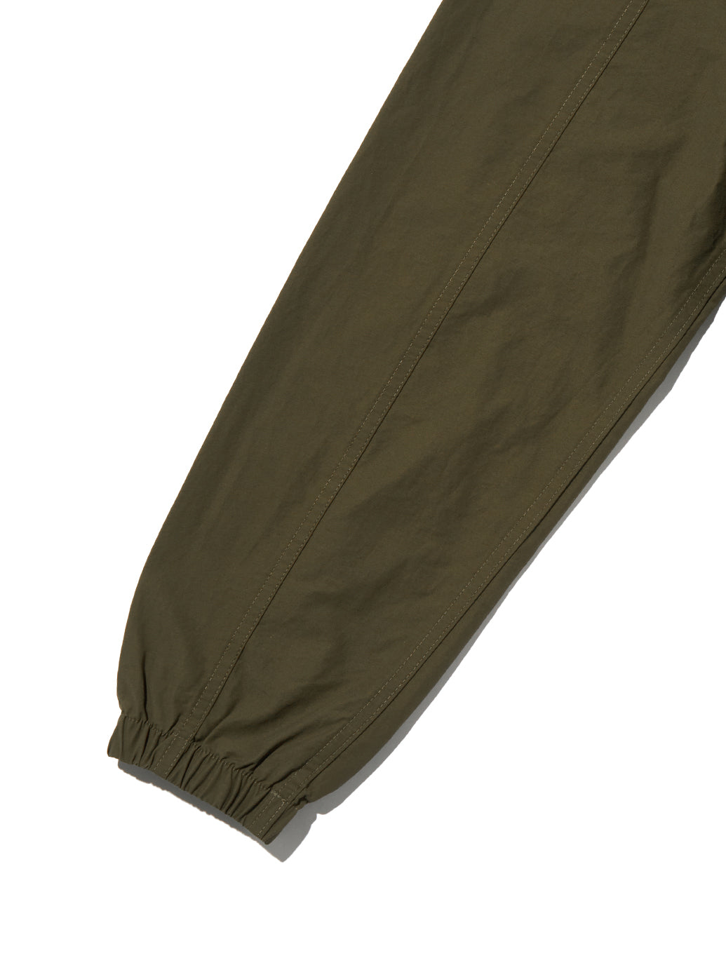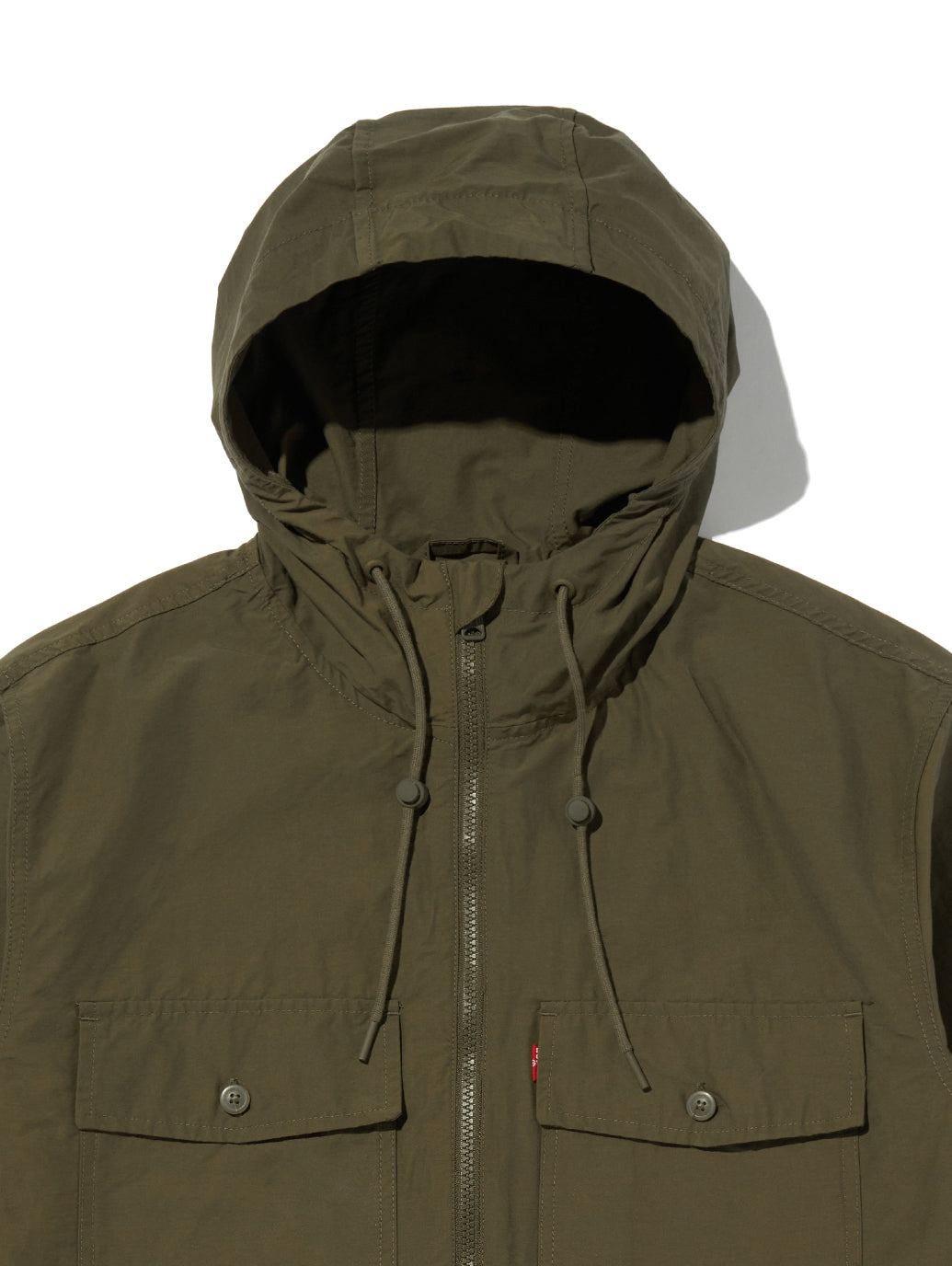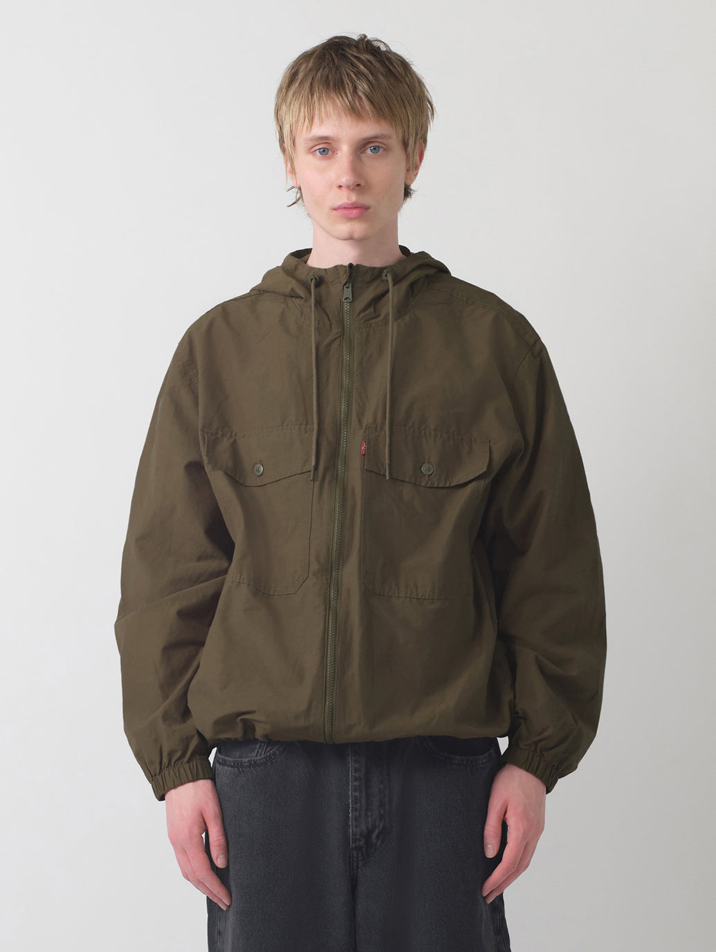 ジップアップフロント仕様のウインドブレーカー。オリーブカラーのゆったりとしたボクシーフィットのボディは、綿61%にナイロン39%を配合した生地でハリのあるが特徴です。フロントには2つのポケットを配し、裾部分はドローコード仕様なのでサイズ調整が可能です。軽く着れて、気軽に持ち運びしやすいので春先に活躍する一着です。