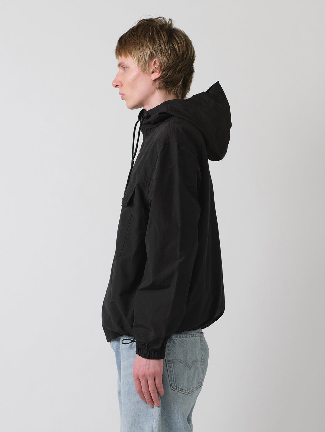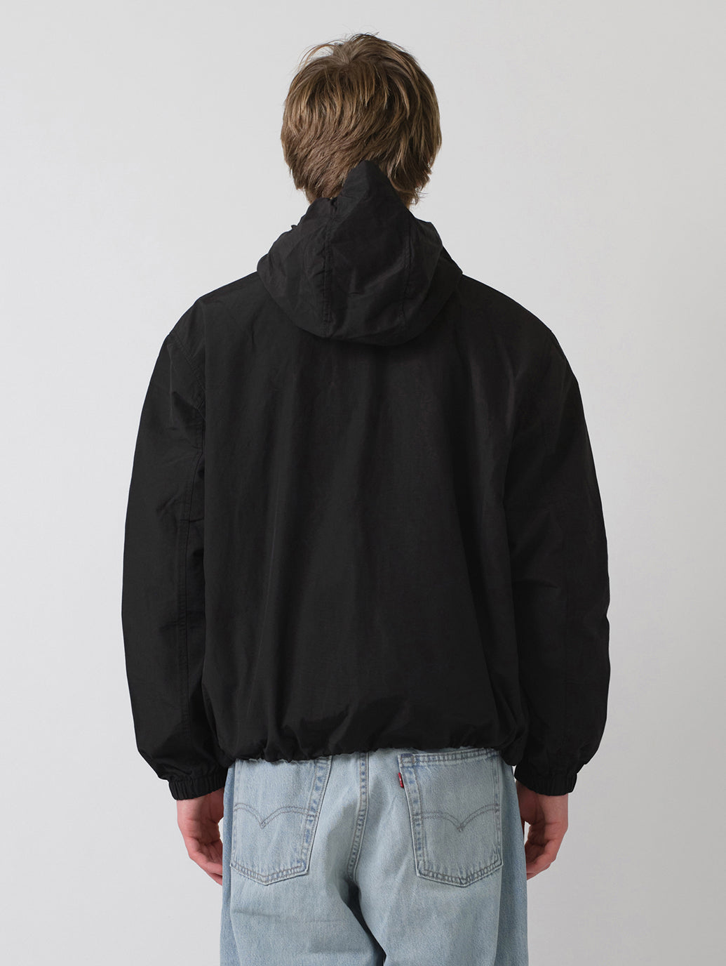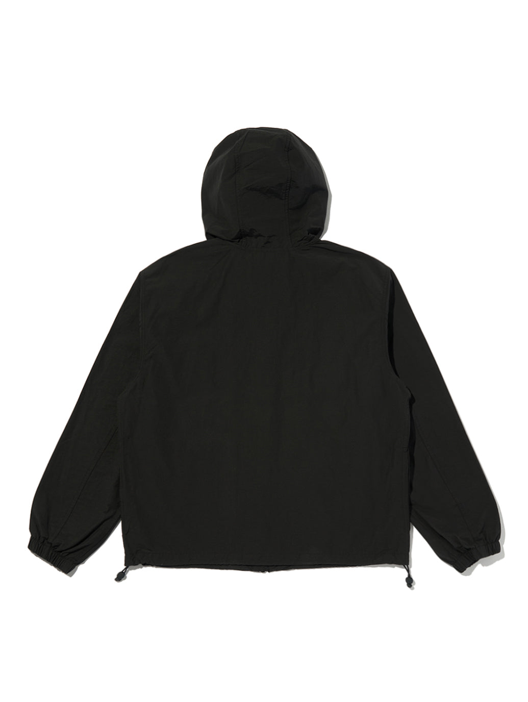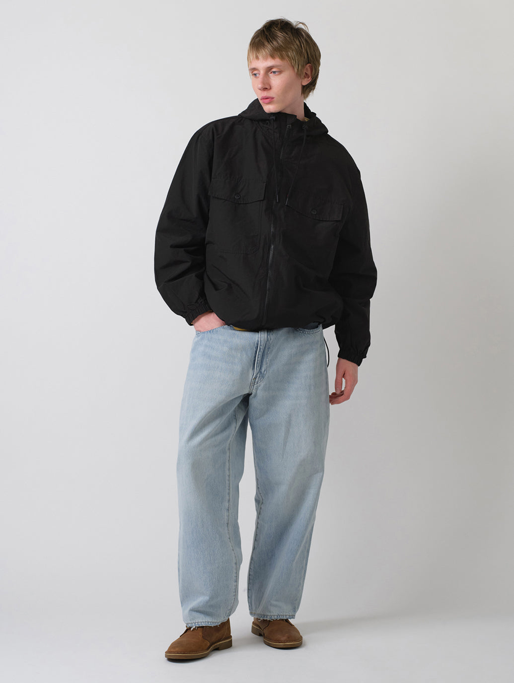 ジップアップフロント仕様のウインドブレーカー。ブラックカラーのゆったりとしたボクシーフィットのボディは、綿61%にナイロン39%を配合した生地でハリのあるが特徴です。フロントには2つのポケットを配し、裾部分はドローコード仕様なのでサイズ調整が可能です。軽く着れて、気軽に持ち運びしやすいので春先に活躍する一着です。
