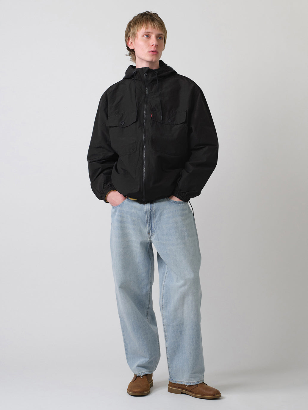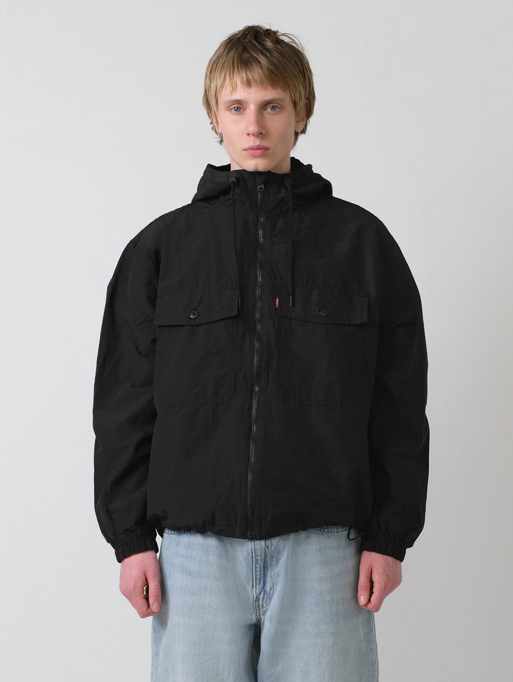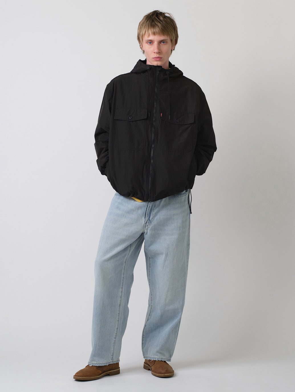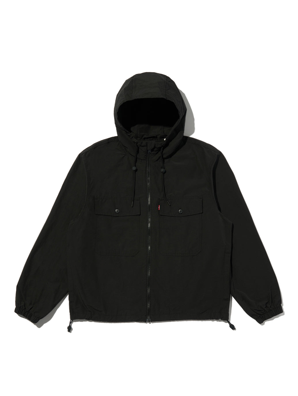 ジップアップフロント仕様のウインドブレーカー。ブラックカラーのゆったりとしたボクシーフィットのボディは、綿61%にナイロン39%を配合した生地でハリのあるが特徴です。フロントには2つのポケットを配し、裾部分はドローコード仕様なのでサイズ調整が可能です。軽く着れて、気軽に持ち運びしやすいので春先に活躍する一着です。