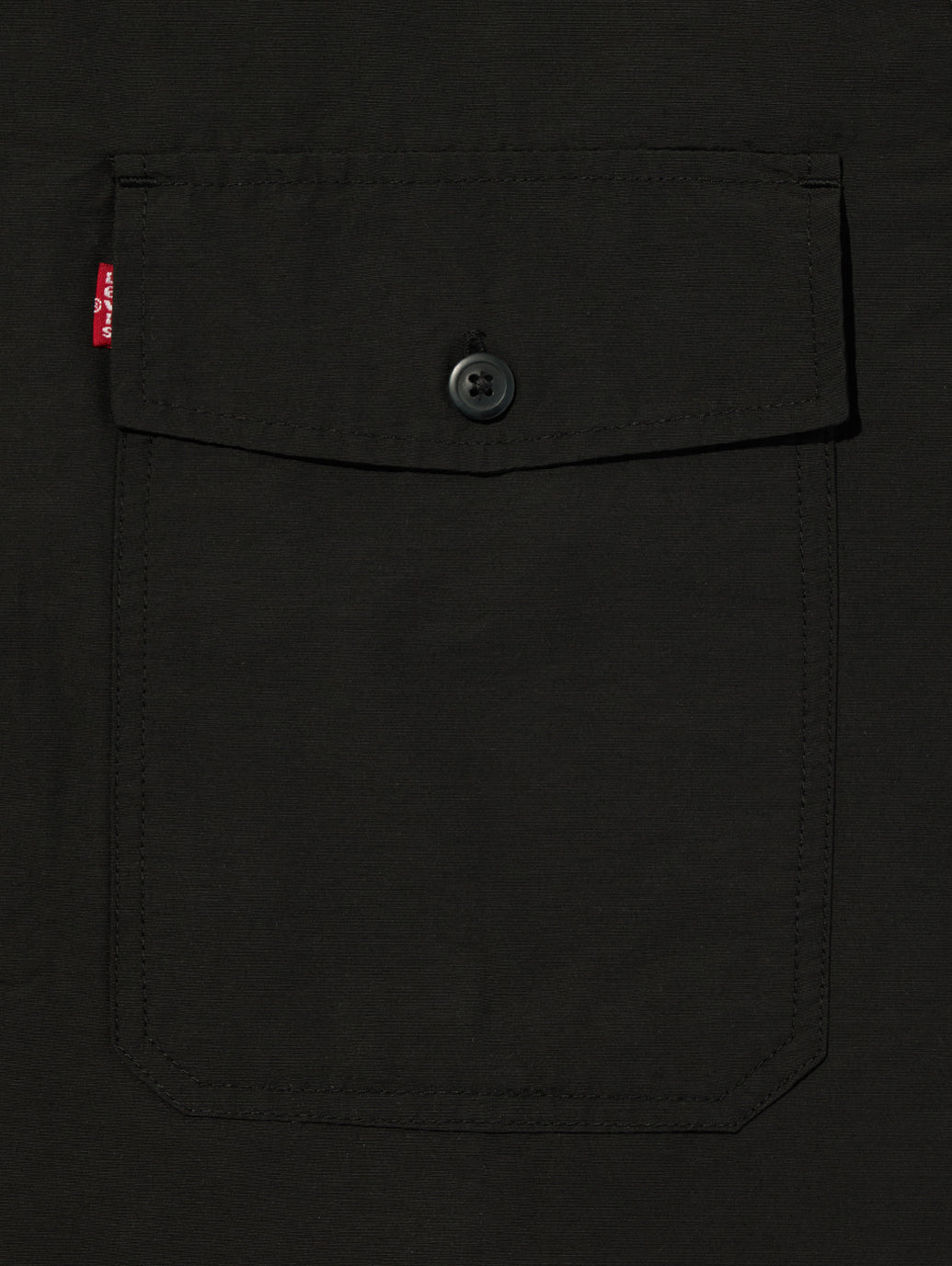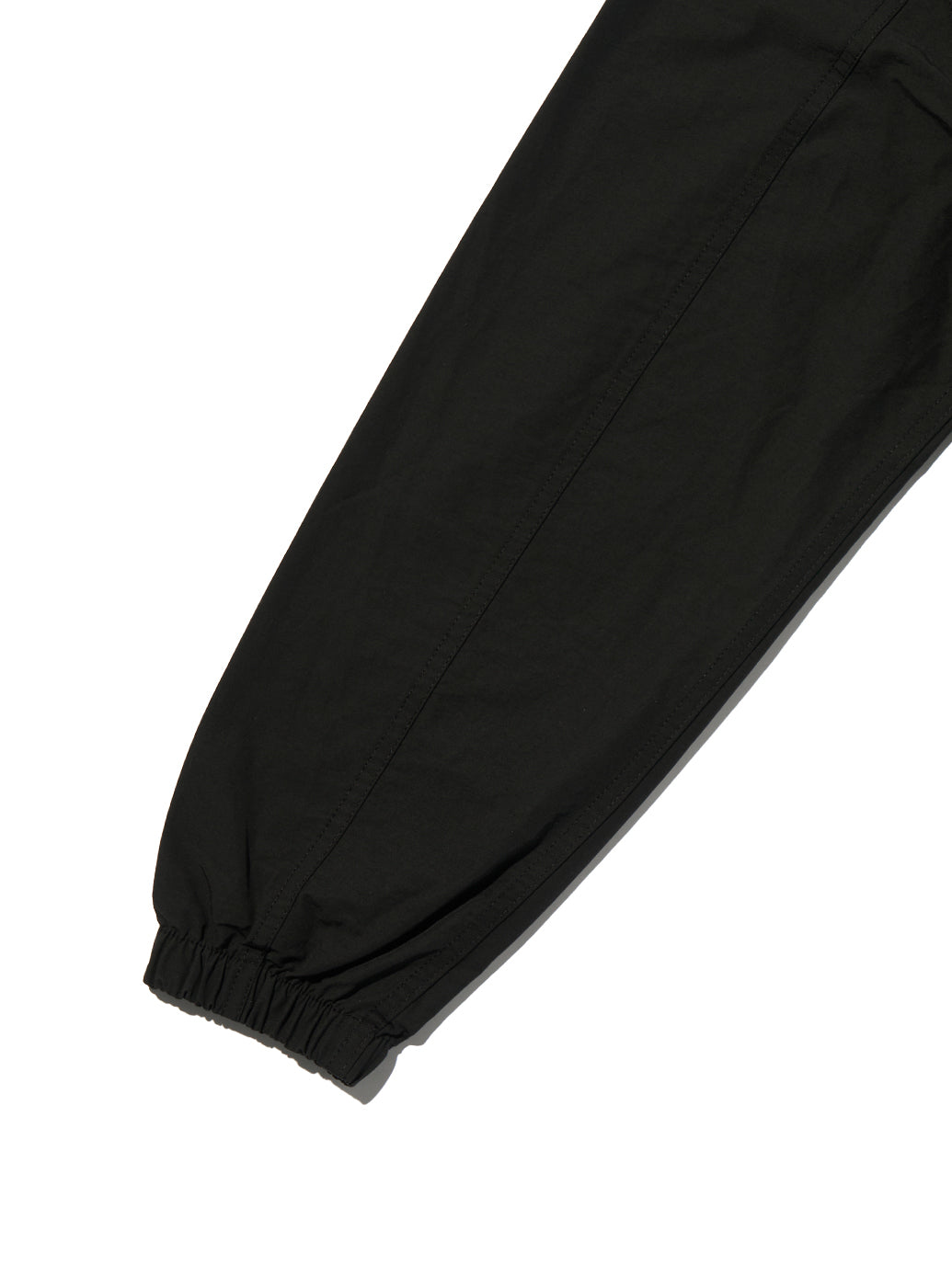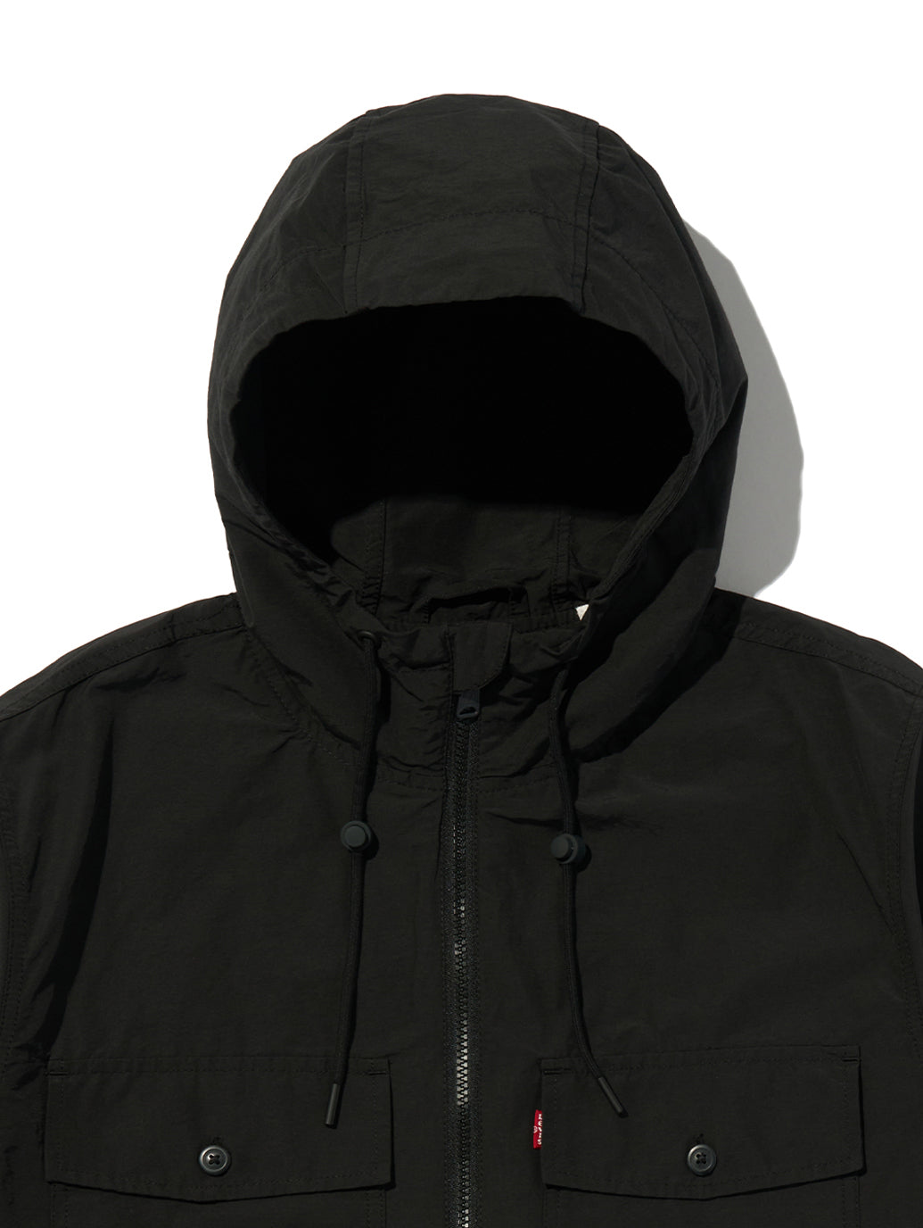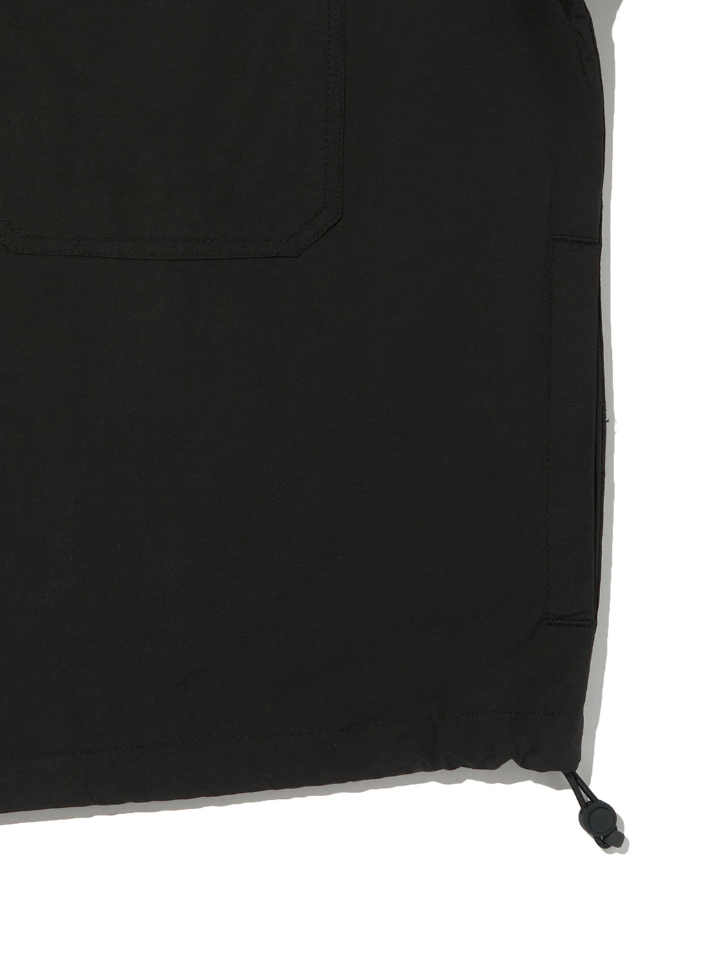 ジップアップフロント仕様のウインドブレーカー。ブラックカラーのゆったりとしたボクシーフィットのボディは、綿61%にナイロン39%を配合した生地でハリのあるが特徴です。フロントには2つのポケットを配し、裾部分はドローコード仕様なのでサイズ調整が可能です。軽く着れて、気軽に持ち運びしやすいので春先に活躍する一着です。