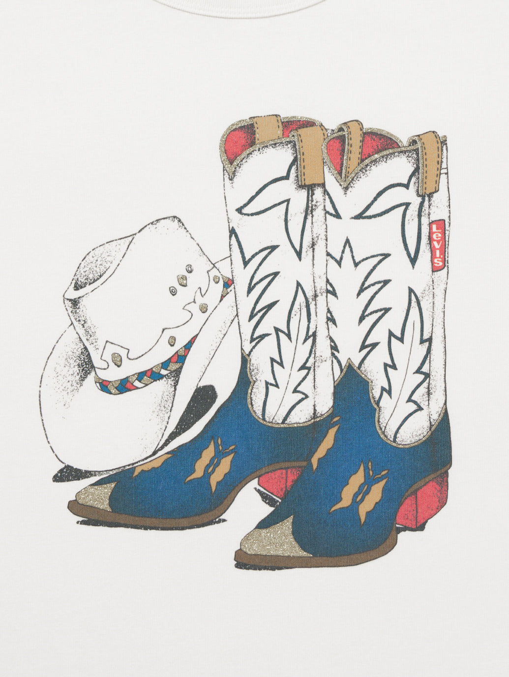 グラフィック・タボールTシャツは、クルーネックとゆったりしたフィット感に加え、ウエスタンハットとブーツをあしらった存在感抜群のヴィンテージライクなデザイン。