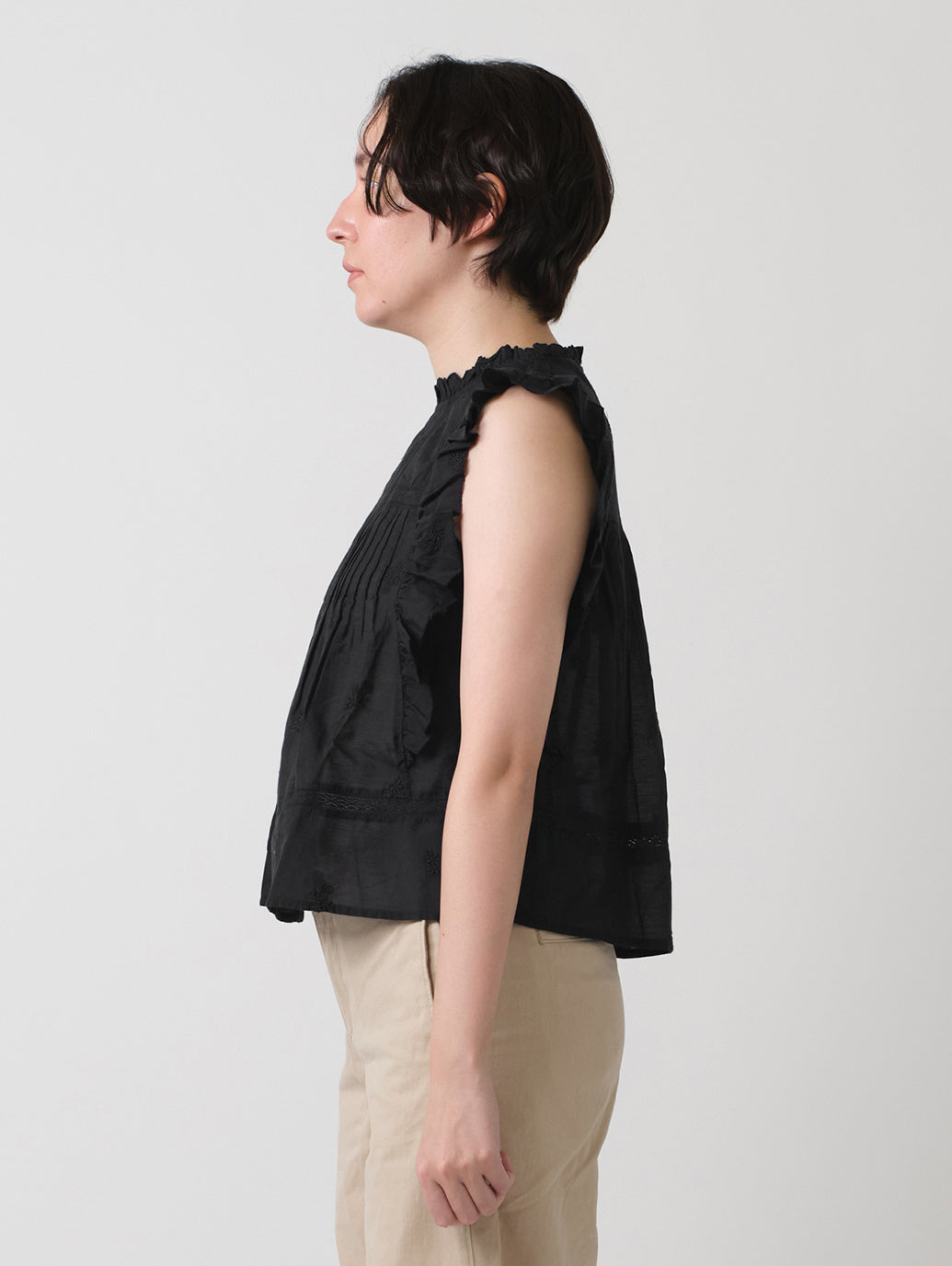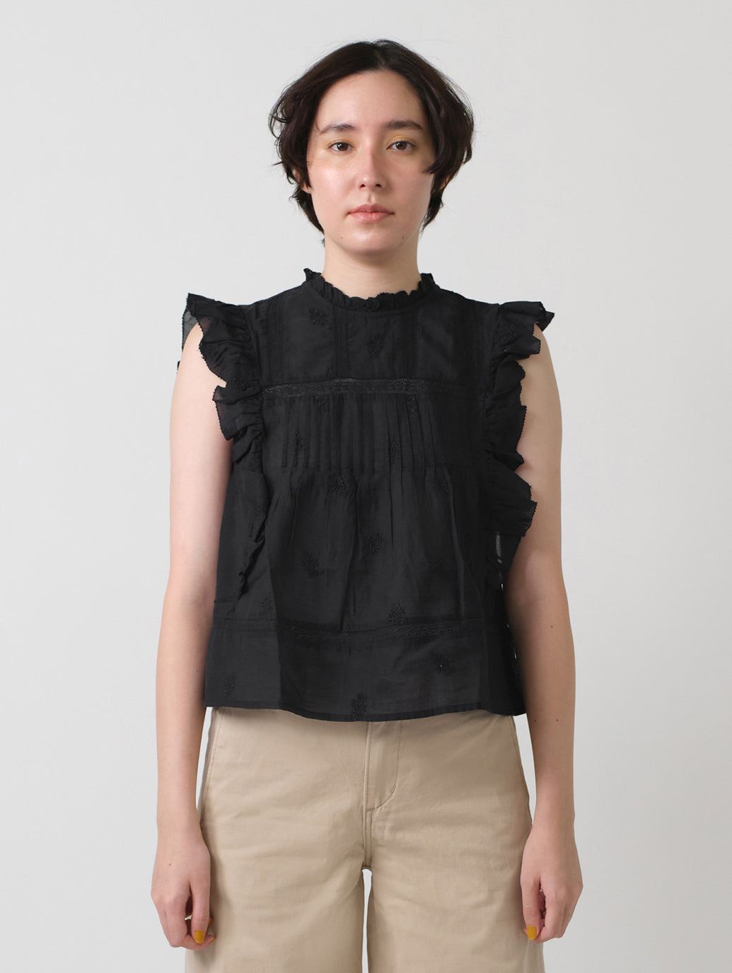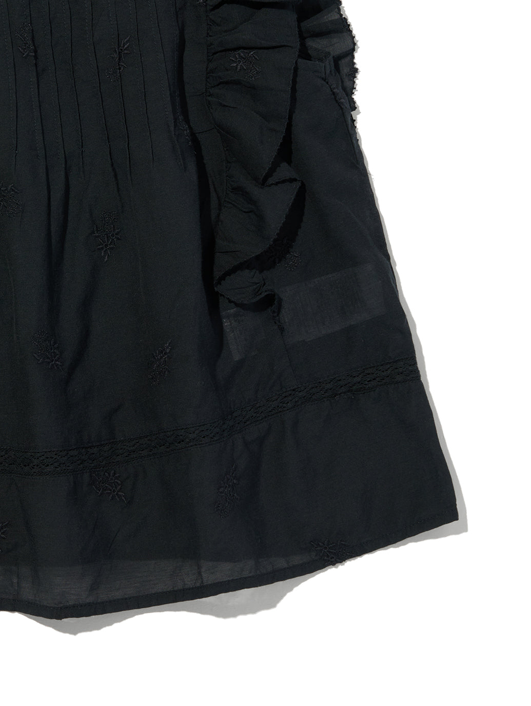 ふんわりとしたシルエットのブラックカラーのブラウス。フラッタースリーブと高いネックライン、同色のフローラルの刺繍を施して女性らしさをプラスしてくれます。綿にレーヨンを配合しており、ハリがありながらもドレープ感のある生地感で着心地も良好です。春先のスタリングのアクセントに重宝する一着です。