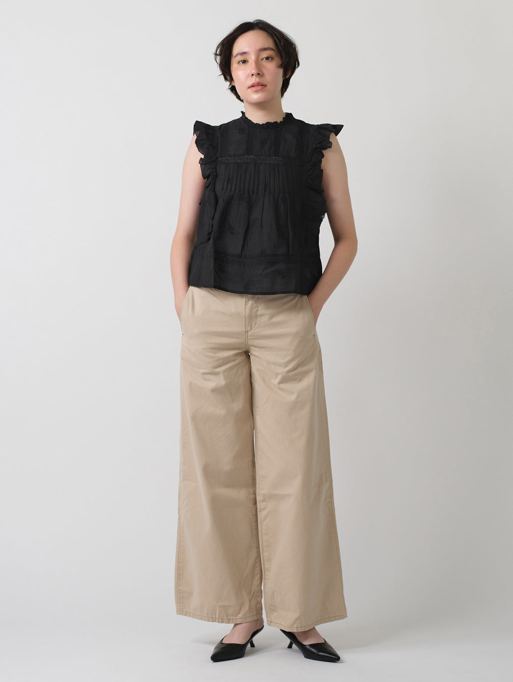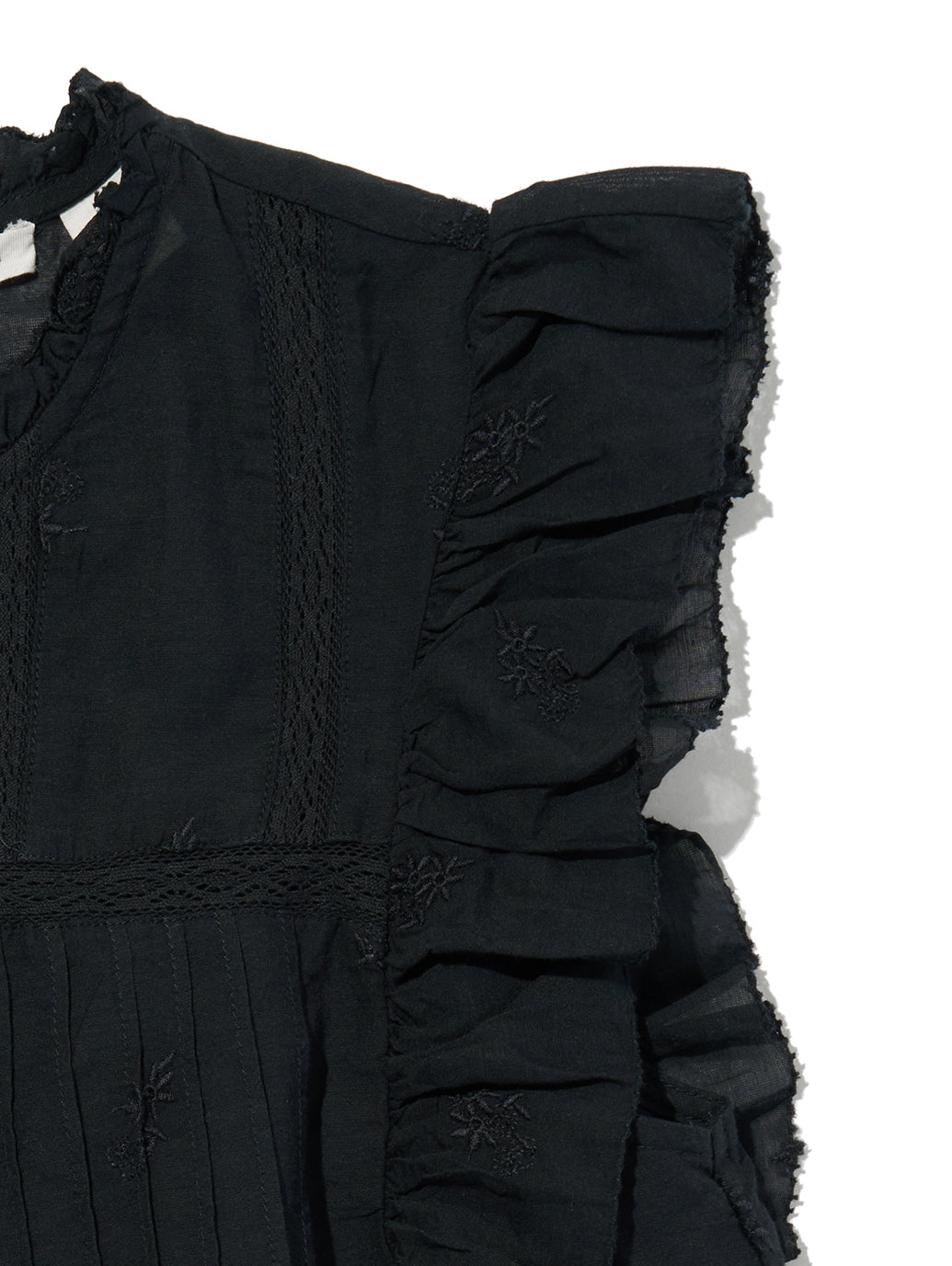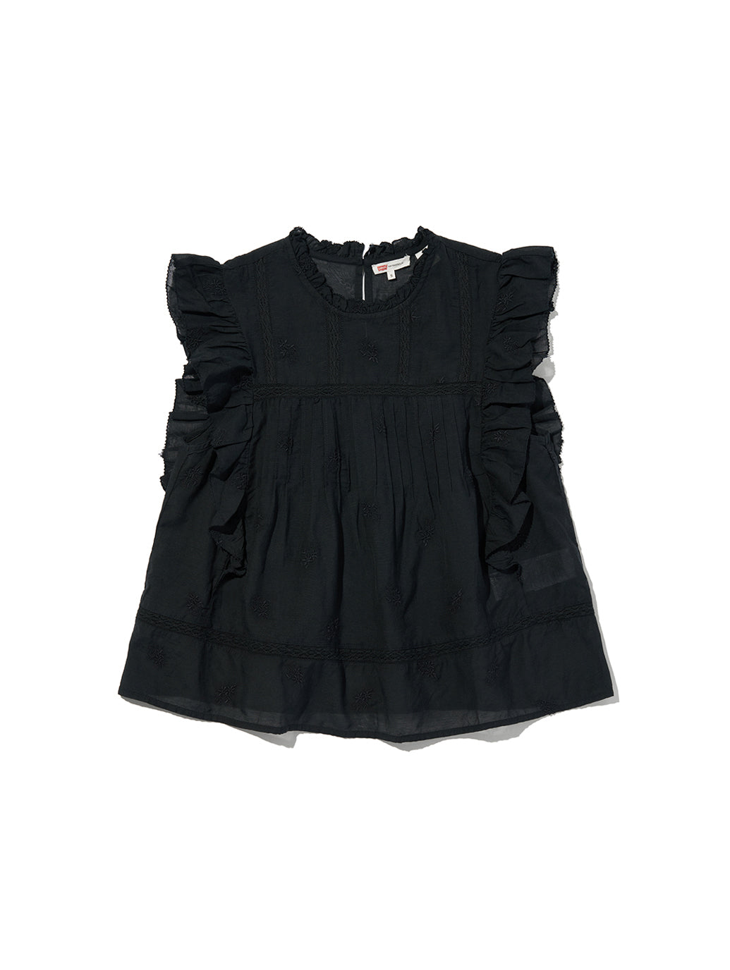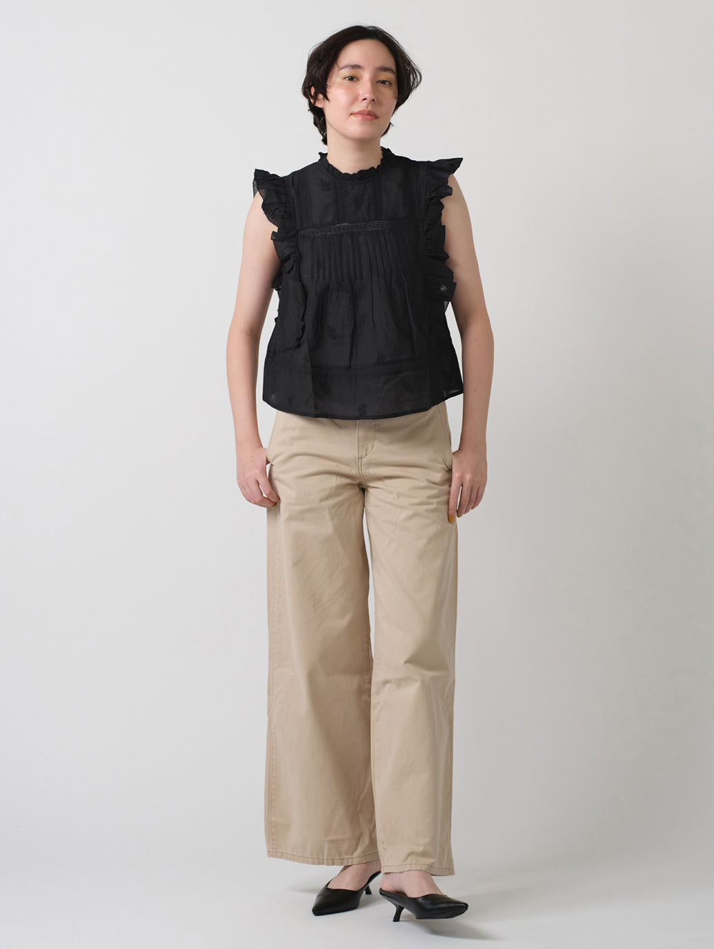 ふんわりとしたシルエットのブラックカラーのブラウス。フラッタースリーブと高いネックライン、同色のフローラルの刺繍を施して女性らしさをプラスしてくれます。綿にレーヨンを配合しており、ハリがありながらもドレープ感のある生地感で着心地も良好です。春先のスタリングのアクセントに重宝する一着です。