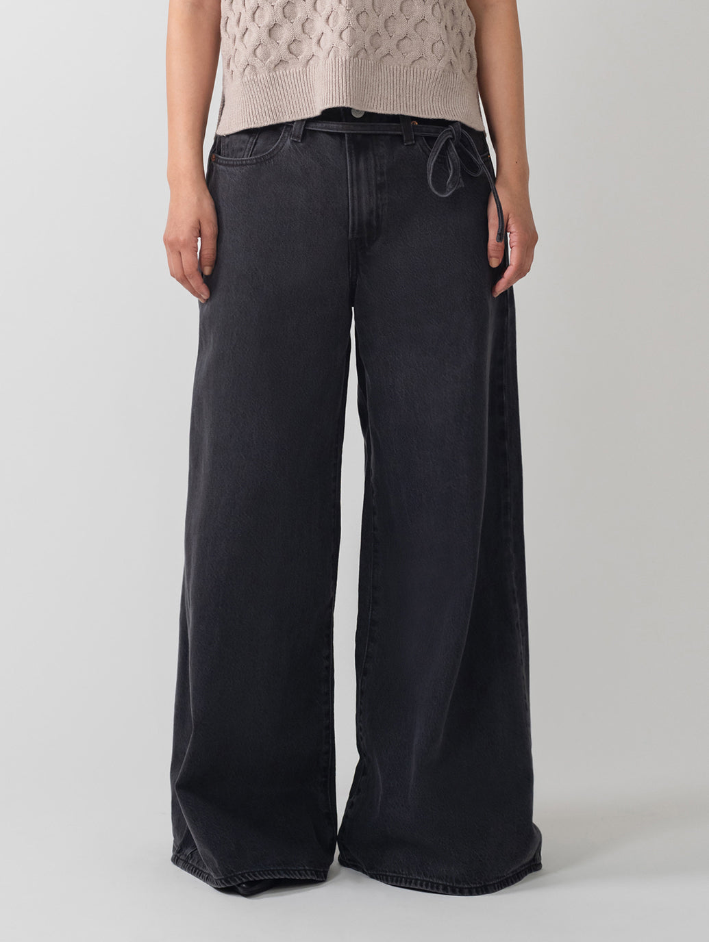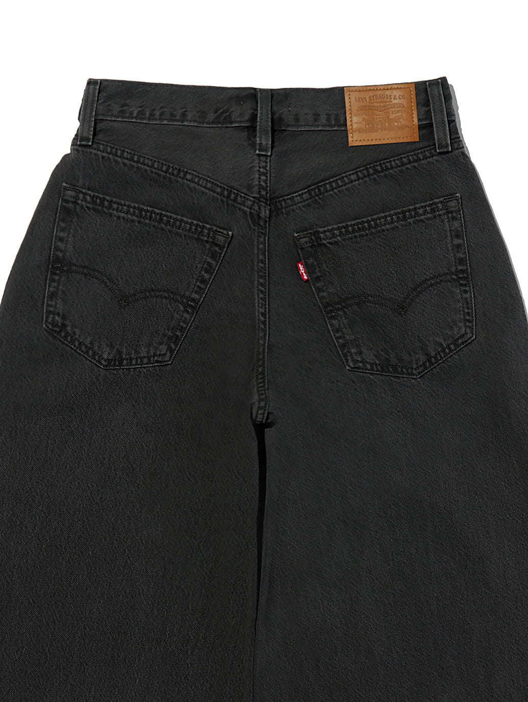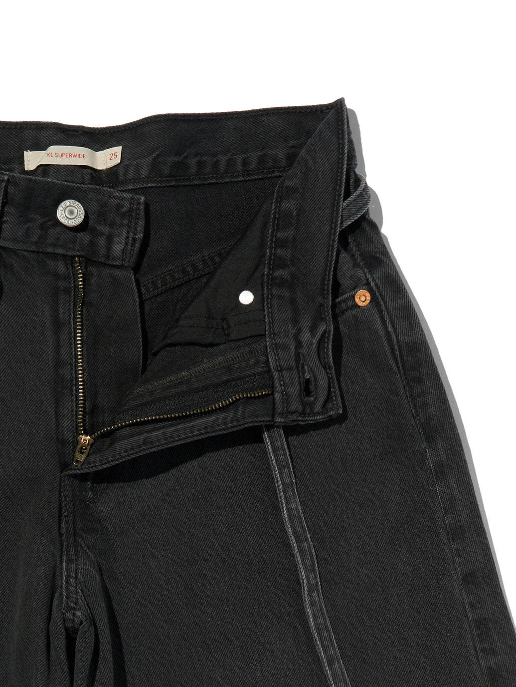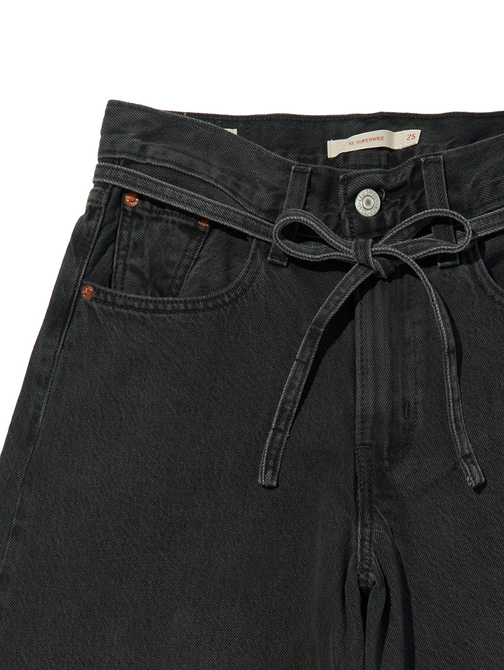 オーバーサイズのバギースタイルと特にワイドなレッグ、そして着やすいミッドライズを、XLスーパーワイドジーンズに取り入れました。さらに、調節可能なタイベルト仕様、ブラックユーズドカラーなので、幅広い着こなしを楽しめる一本です。