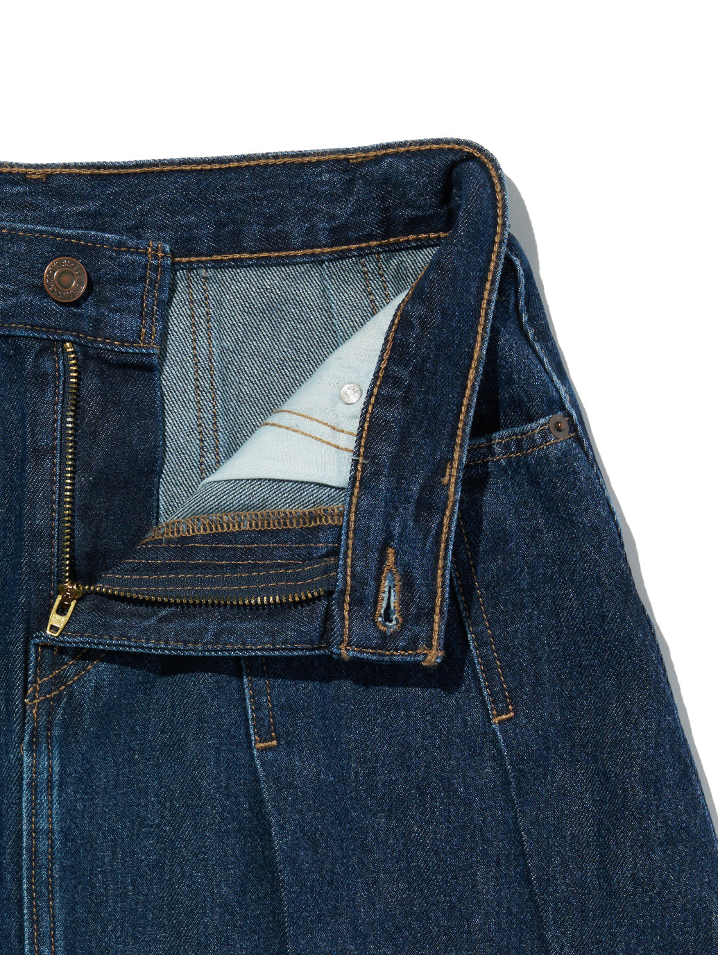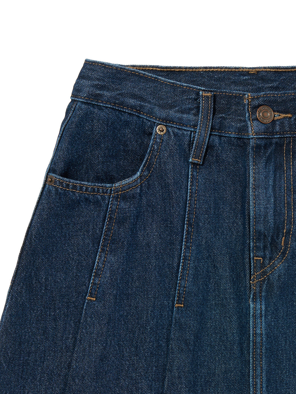 深みのあるダークインディゴデニムのプリーツミニスカートは、ウエストにぴたっとフィット。