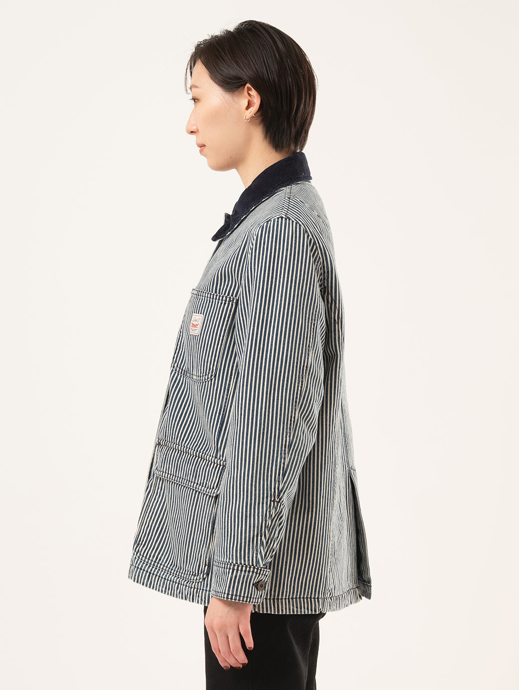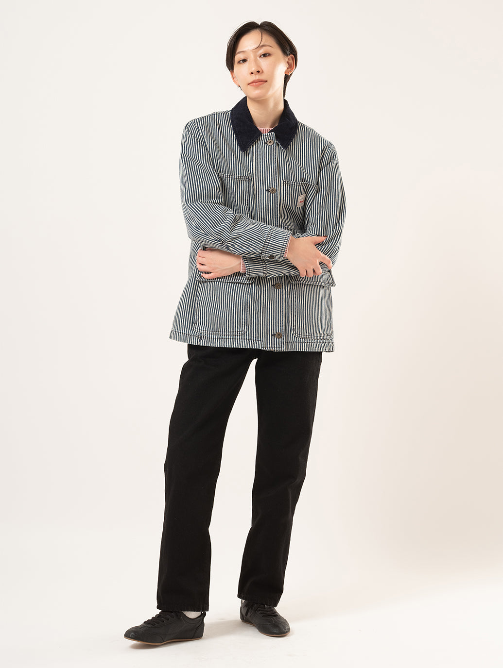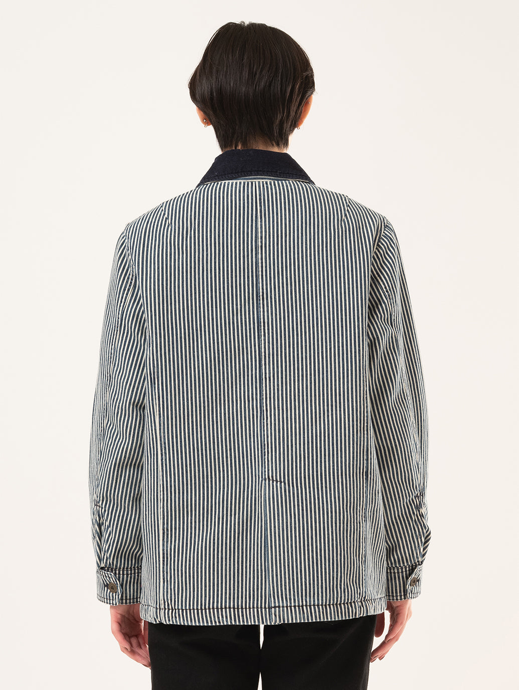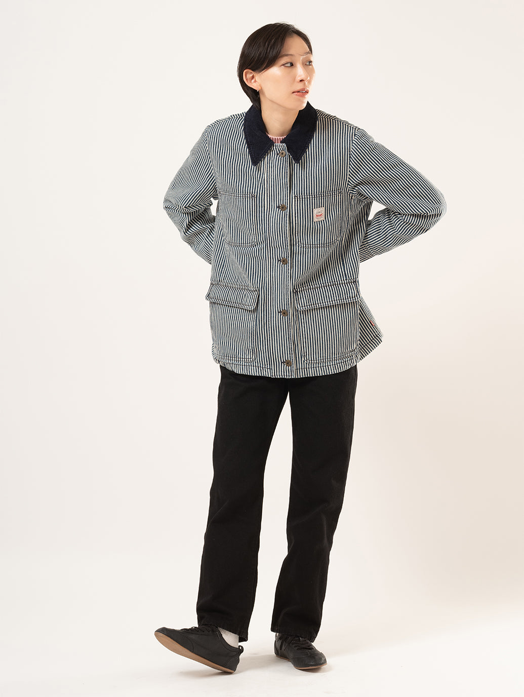Bree Barn ストライプジャケットは、ジップとボタン留めを組み合わせたフロントデザインがポイント。ゆったりとしたフィット感とロング丈シルエットに加え、レイヤード風のディテールが魅力の一着です。