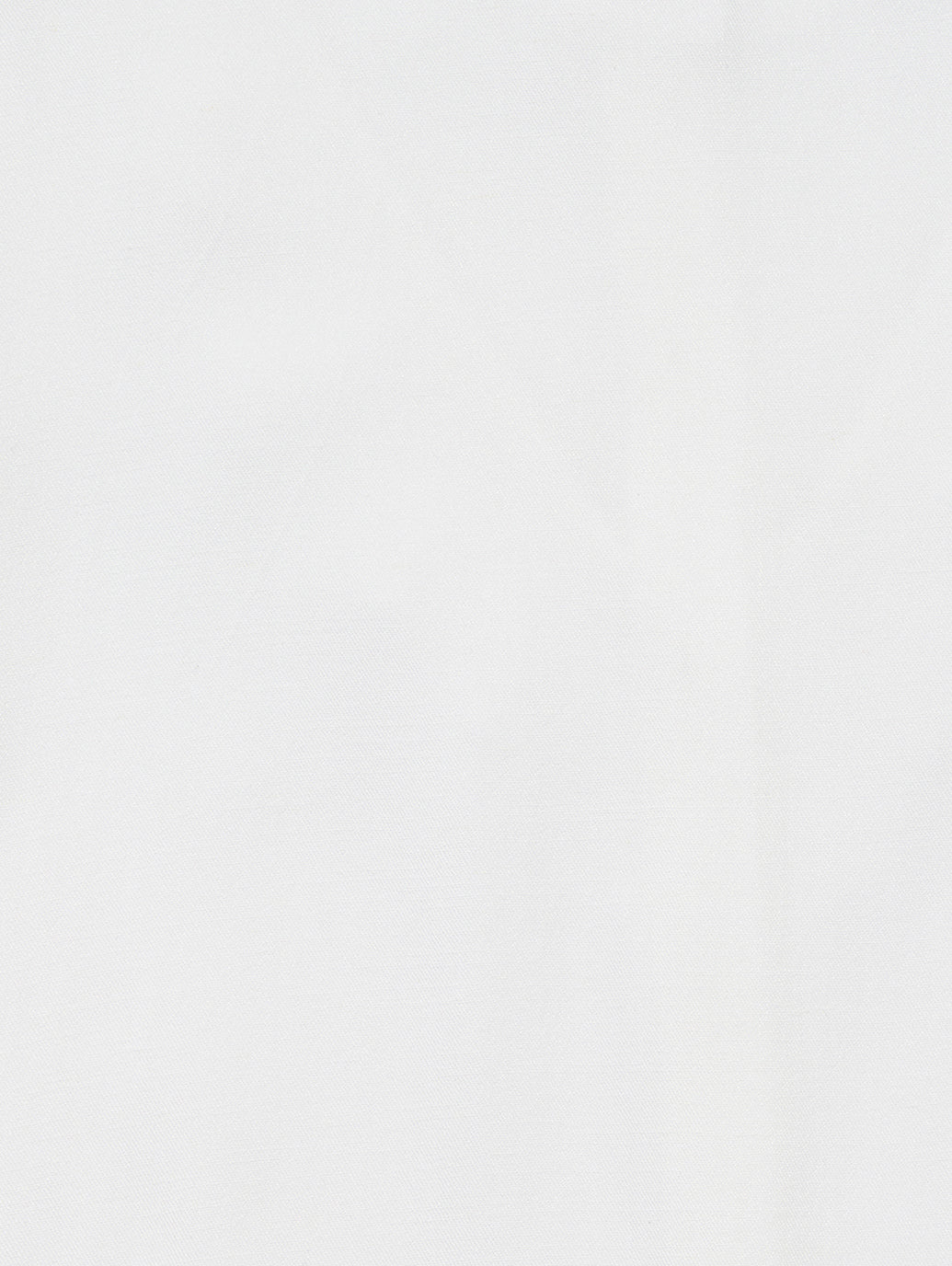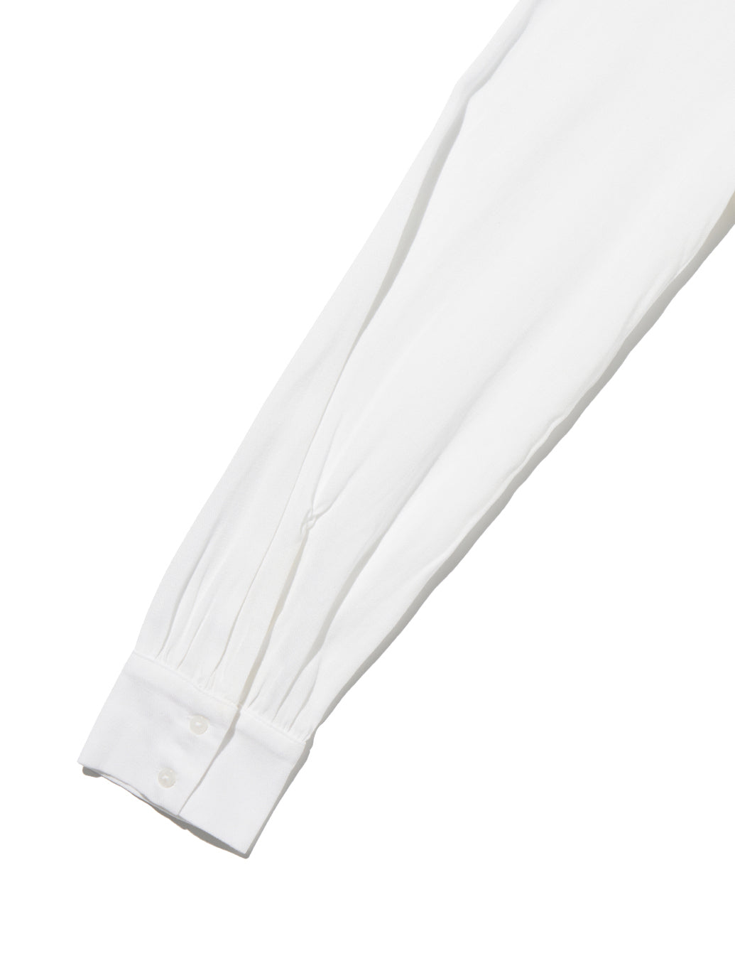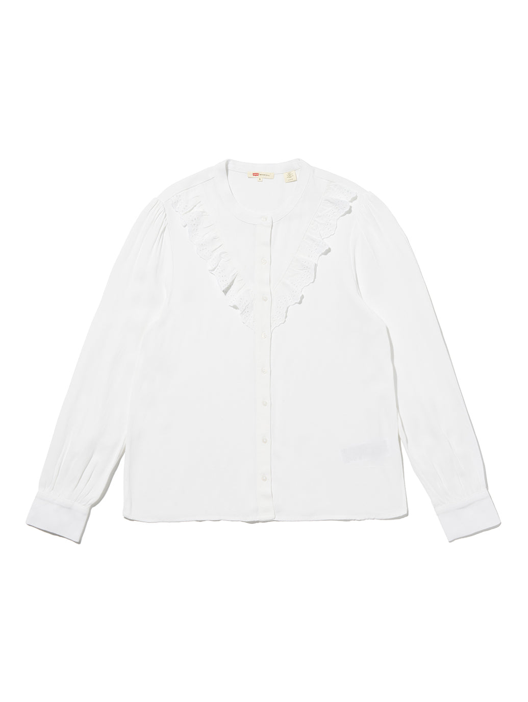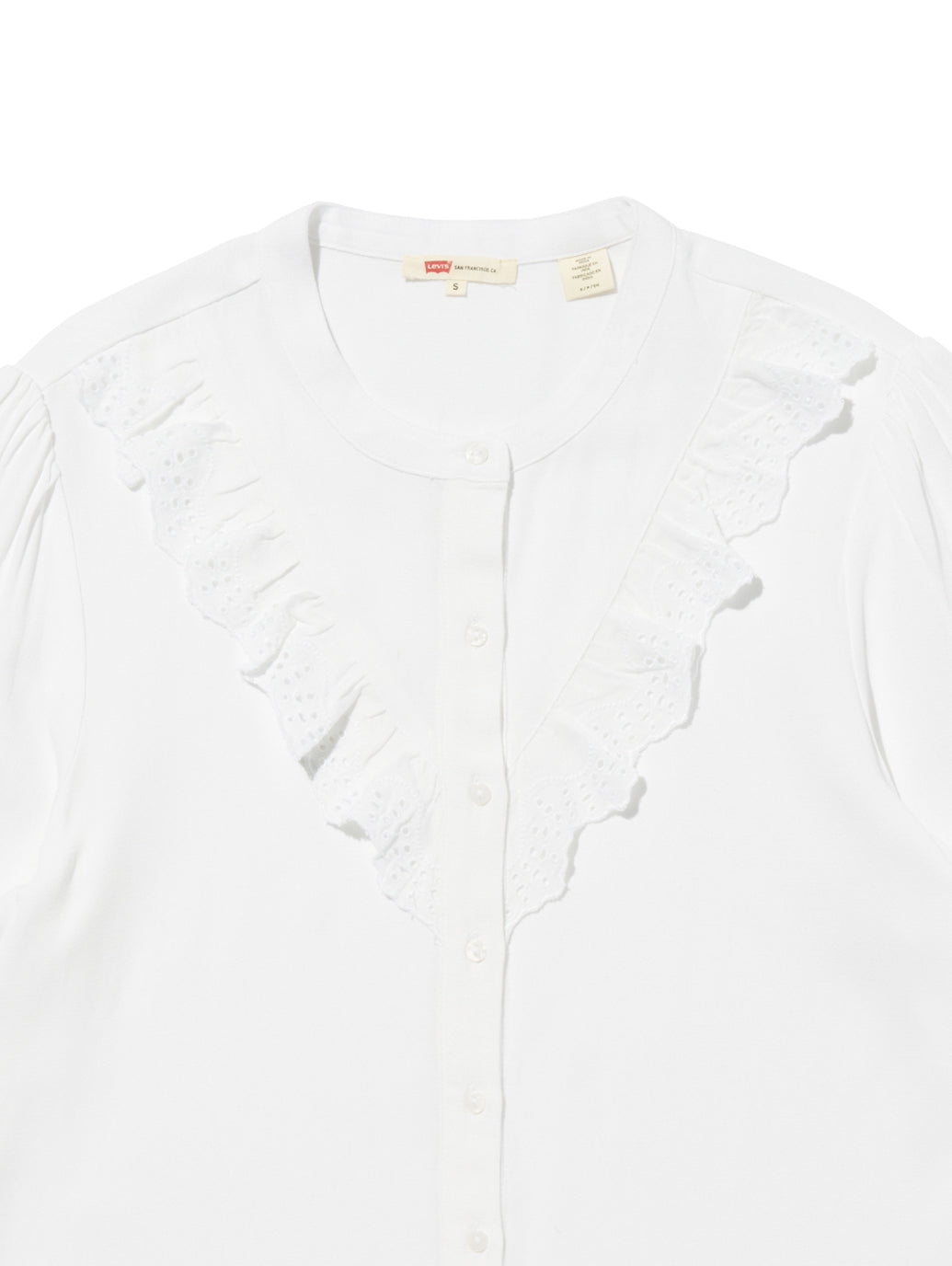 ハイネックとクラシックなフロントボタンアップ、ブルゾンスリーブのあるデザインで、ロマンティックなアイレットディテールを施しました。レーヨン90%/麻10%の生地、爽やかなホワイトカラーで春先から活躍間違いなしの一着です。