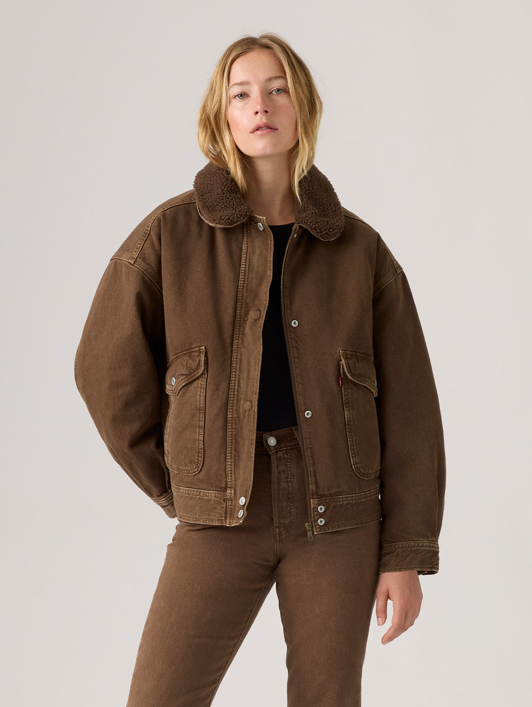 シェルパ ボンバージャケットは、フェイクムートンの襟とボタンアップフロントが特徴です。