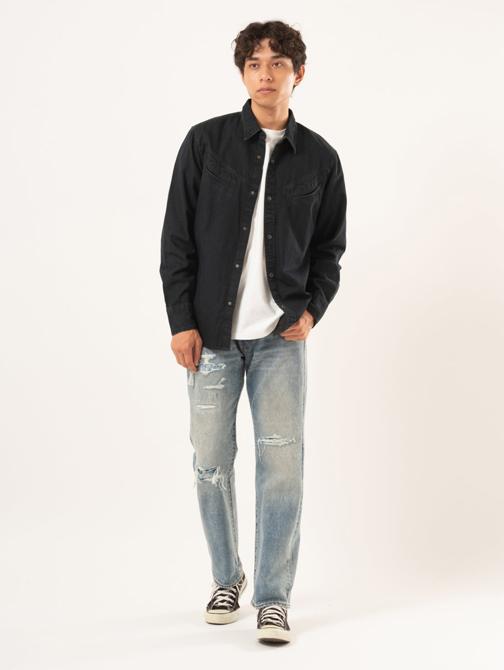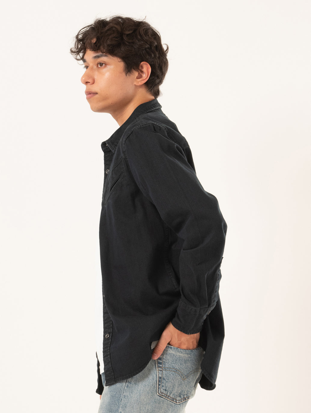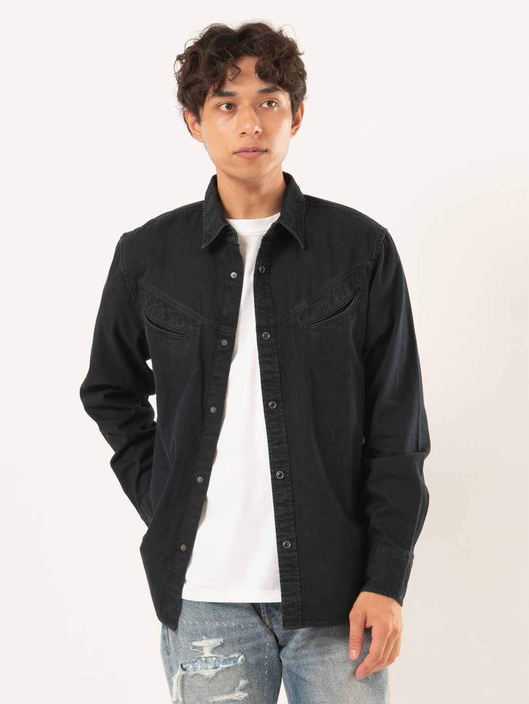 スマイリー ウエスタン シャツは、クラシックなウエスタンシャツから着想を得て、ボタンフロントやヨークのディテールを丁寧に再現。程よくゆとりのあるスタンダードフィットは、穿き込んだデニムやエイジングを楽しむジャケットにも自然に馴染みます。新品でありながら、ワードローブにすっと溶け込み、時を重ねるほど自分だけの表情を見せてくれる一着です。