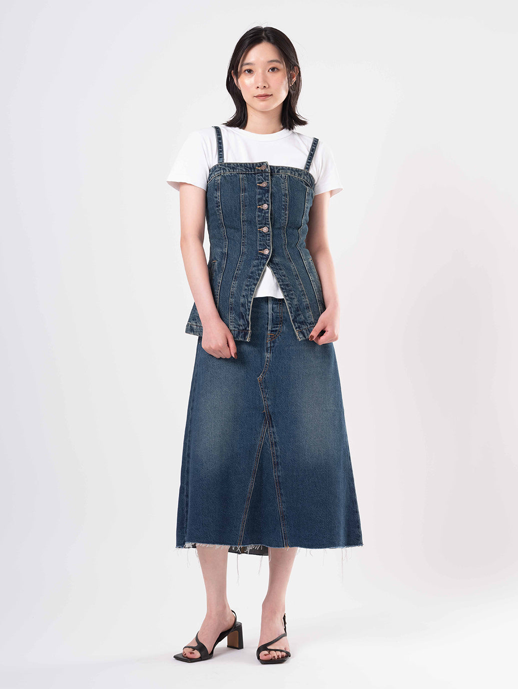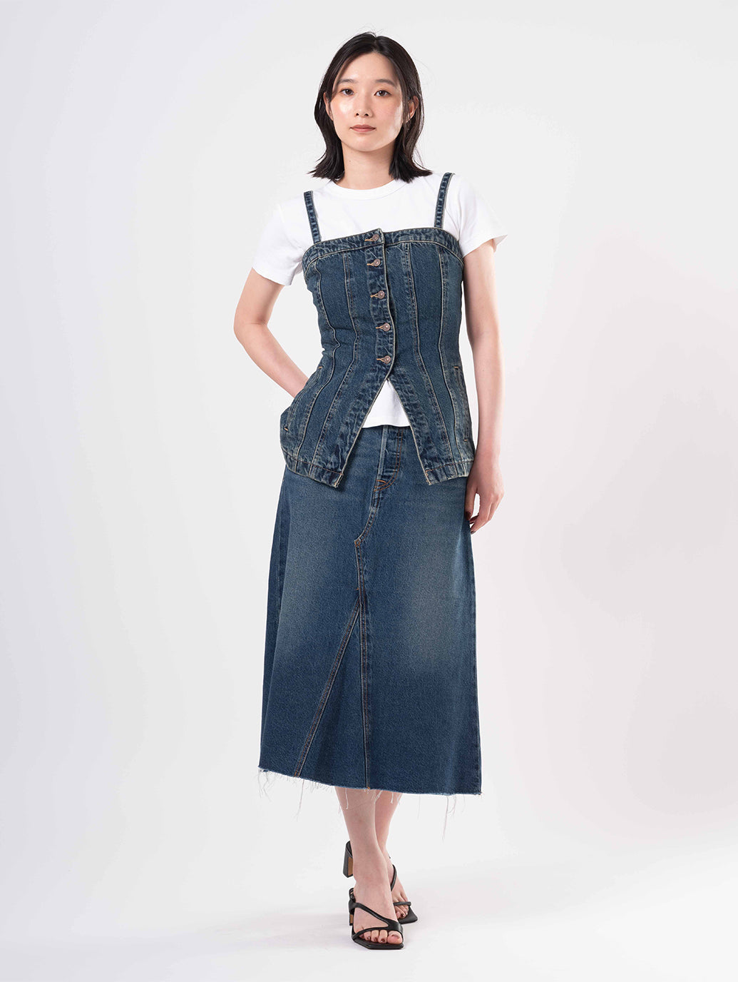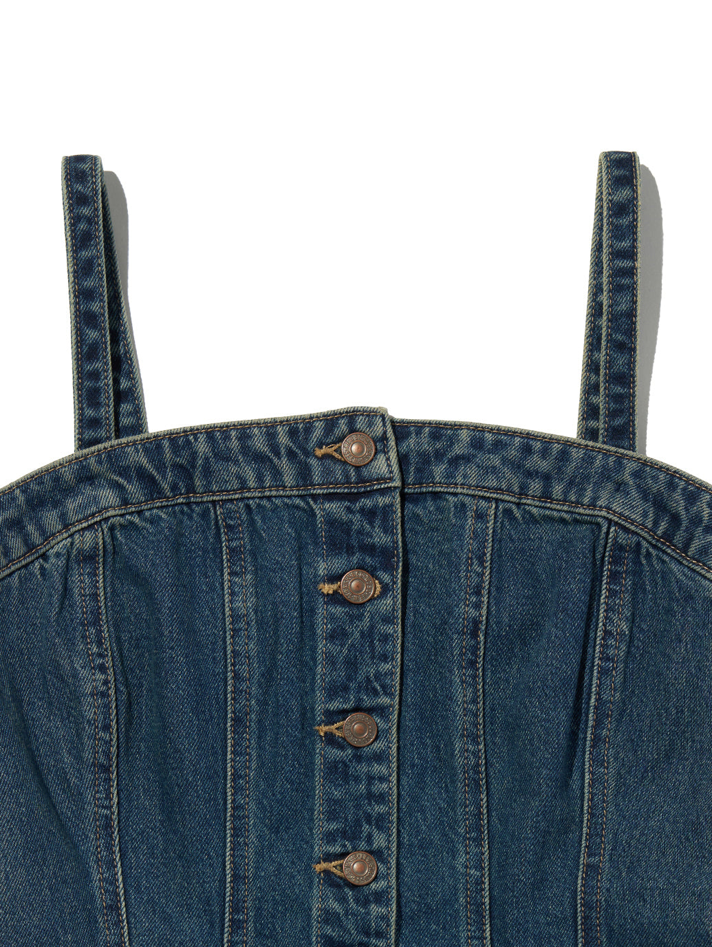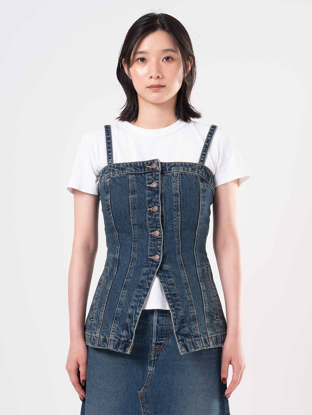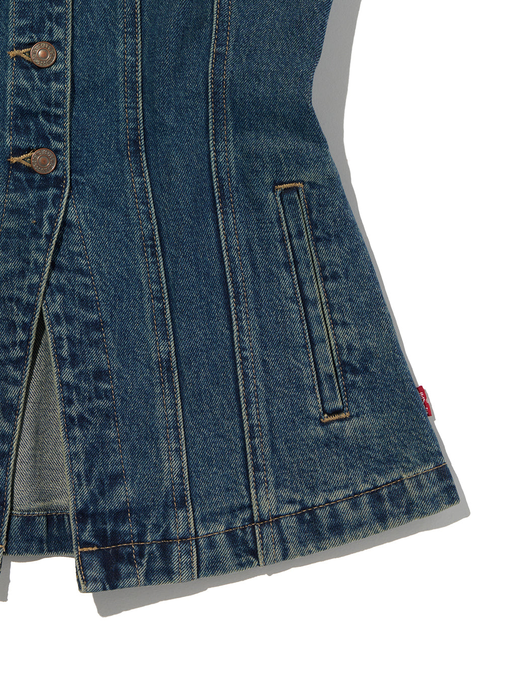 Levi'sらしくデニム生地を使用したテーラード ビスチェ。柔らかなスクエアネック、ボタン留めのフロント、そして美しいスリムフィットが魅力です。ストラップは取り外し可能でオールシーズン活躍するアイテムです。