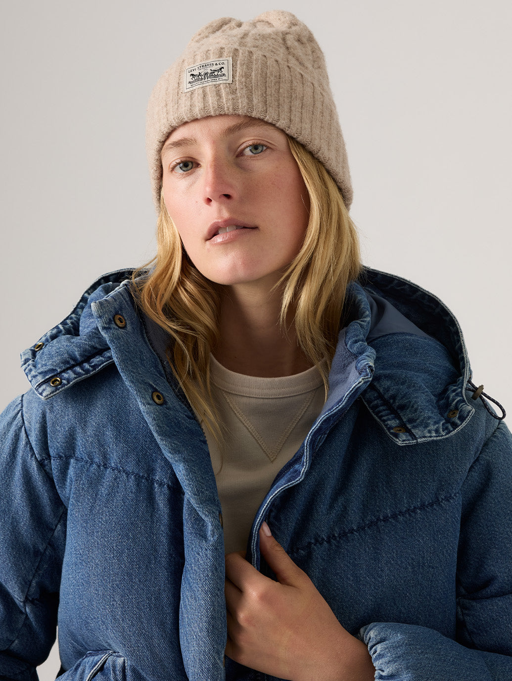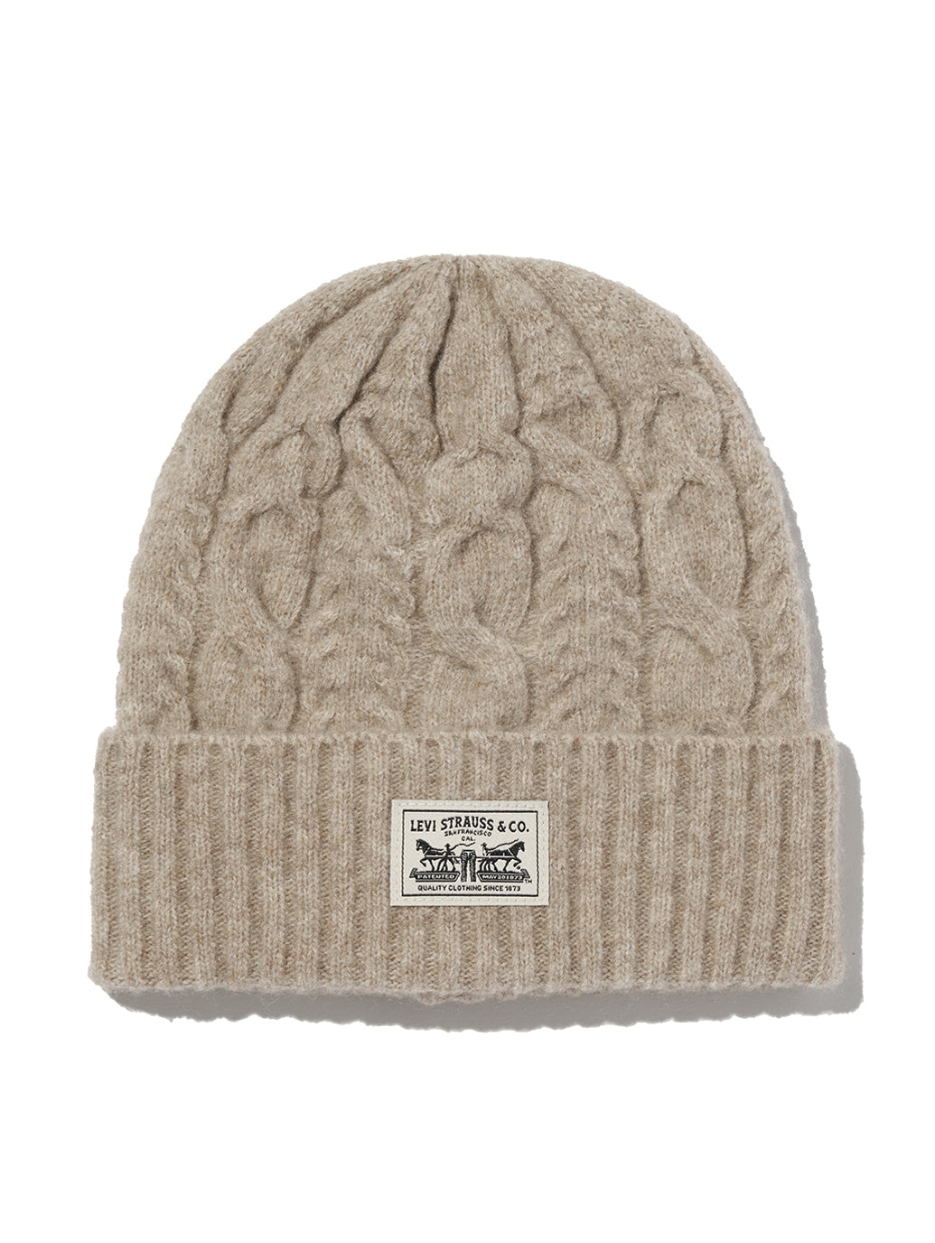 ホリデーシーズンにぴったりのケーブルニットバックパッチビーニー。暖かいケーブルニット素材を使用し、Levi's®のシグネチャーパッチで仕上げた一枚です。寒い季節のカジュアルスタイルに最適。