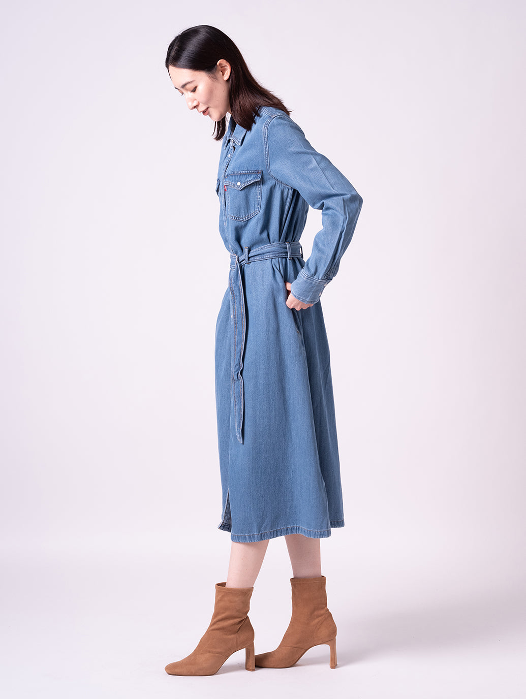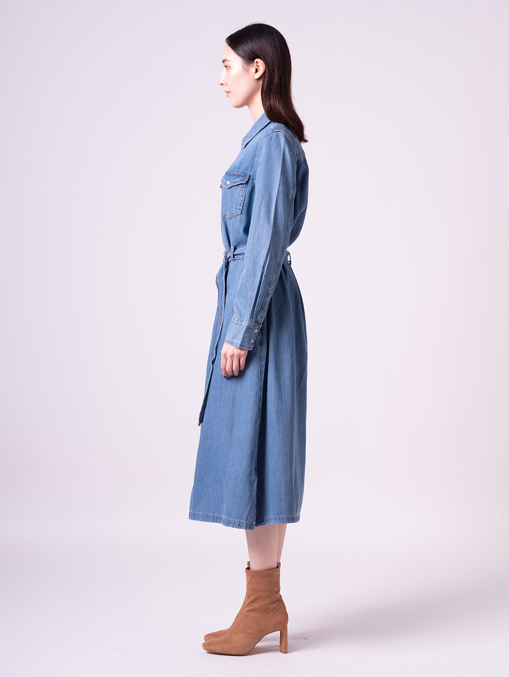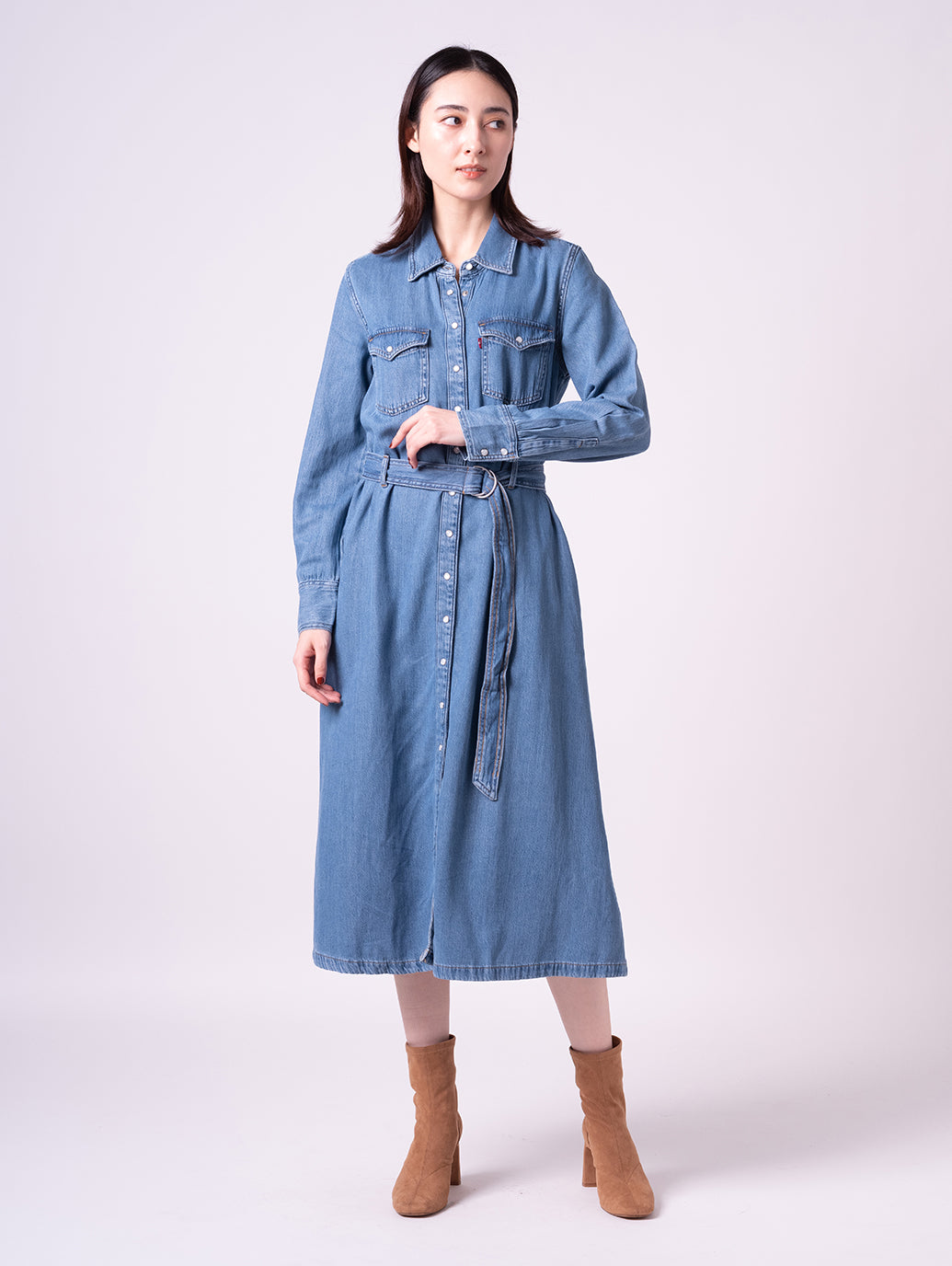 ウェスタン風でモダンな Quincey ロングスリーブ マキシ ドレス。フロントのボタン留め、ウエストをマークするベルト、足首が隠れる長さが特徴です。