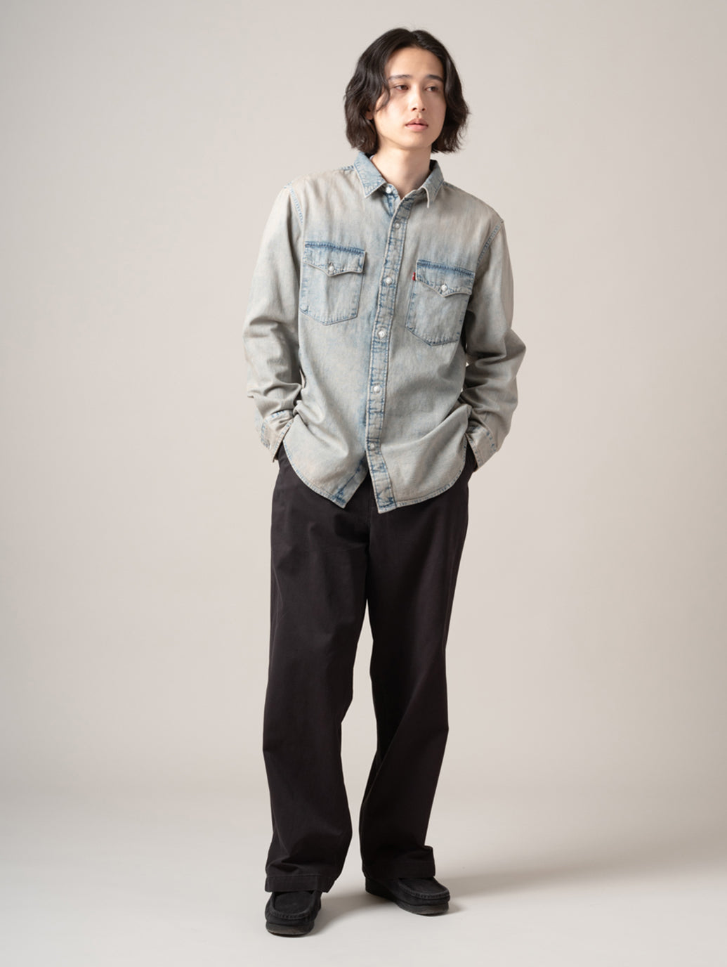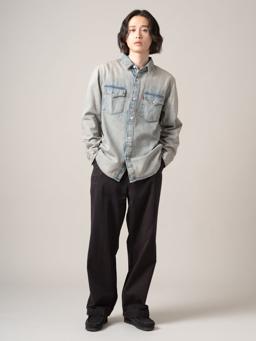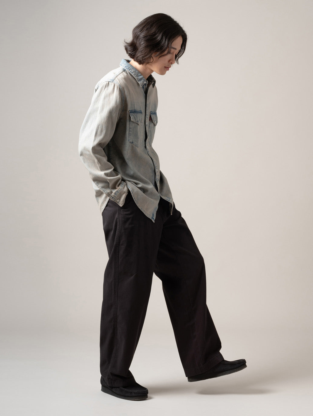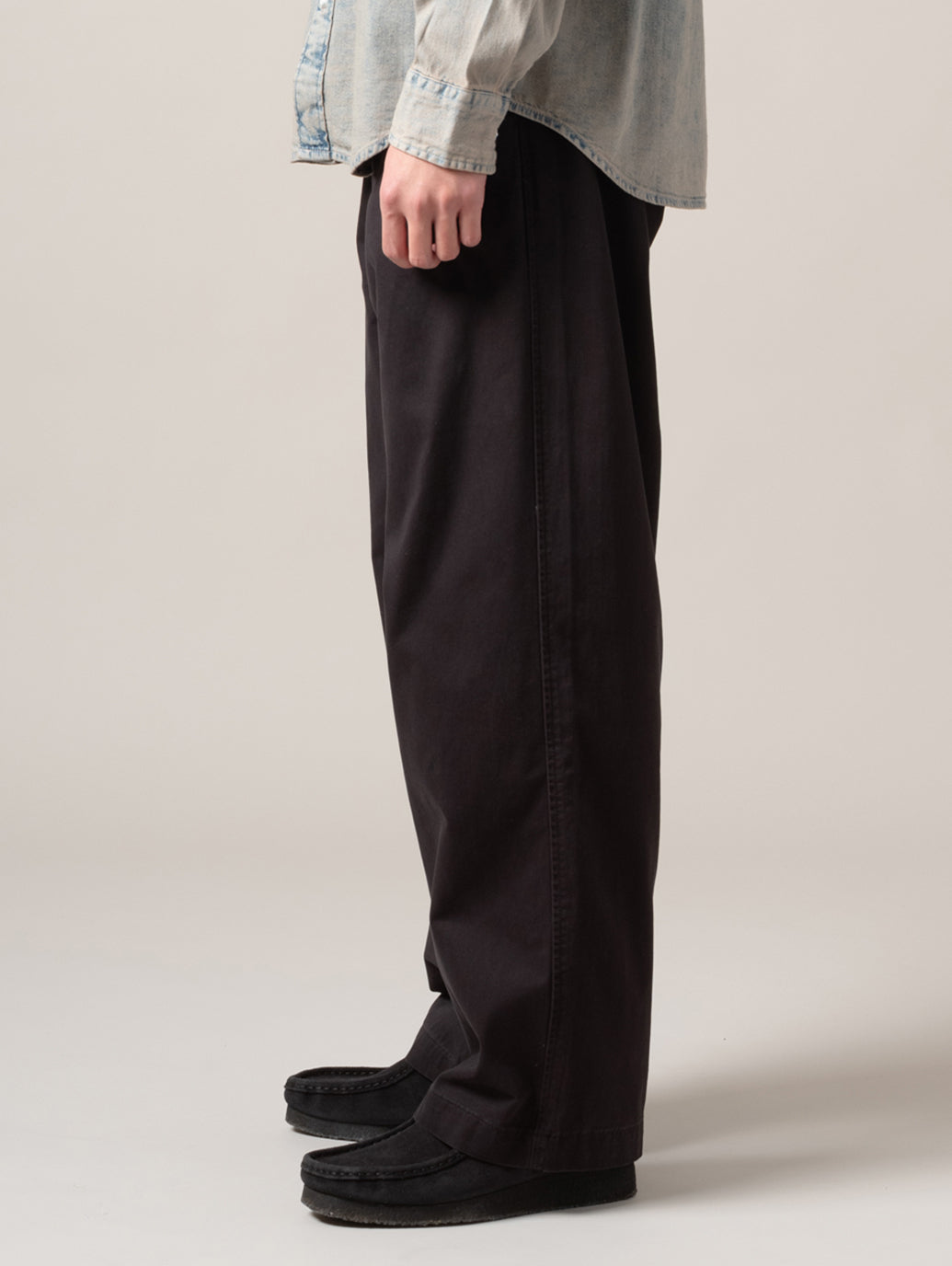 ストレートレッグのソフトなパンツで、腿にかけてきれいなレギュラーフィットスタイルに90年代風のルーズフィットを組み合わせたハイブリットなシルエットです。 model:181cm B89 W68 H83 着用サイズ:33inch