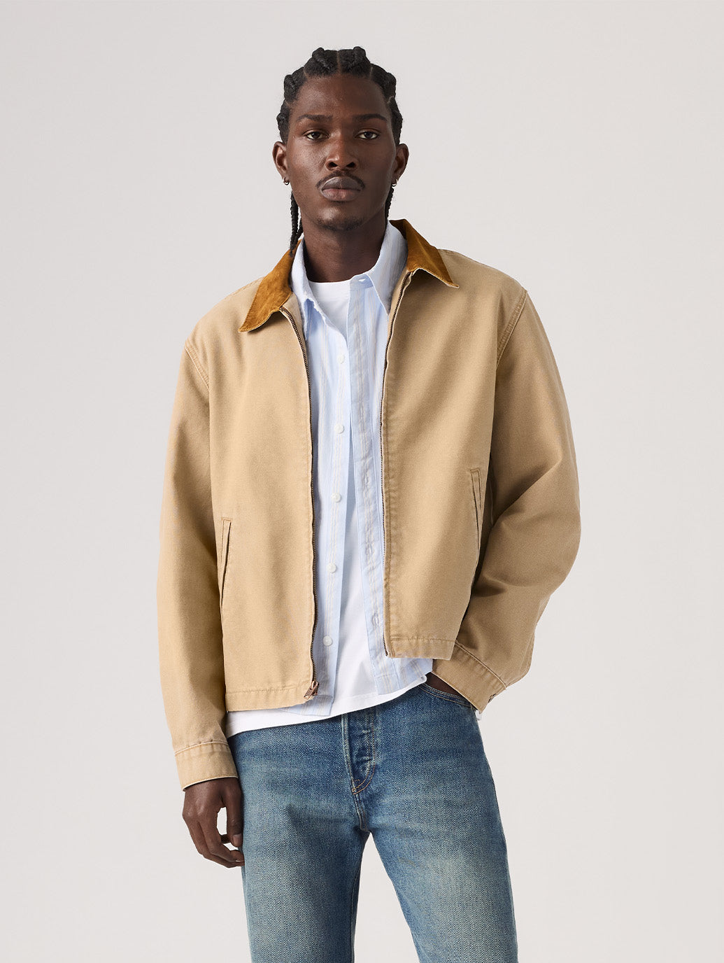 クラシックなワークウェア ジャケットからインスピレーションを得た Castro フルジップ ジャケット。ジップ デザインでリラックスしたややクロップド丈のフィット感で便利なサイド ポケット 2 つを組み合わせました。 襟は別の素材を取り入れワークテイストがお好きな方にはたまらないアイテムです。