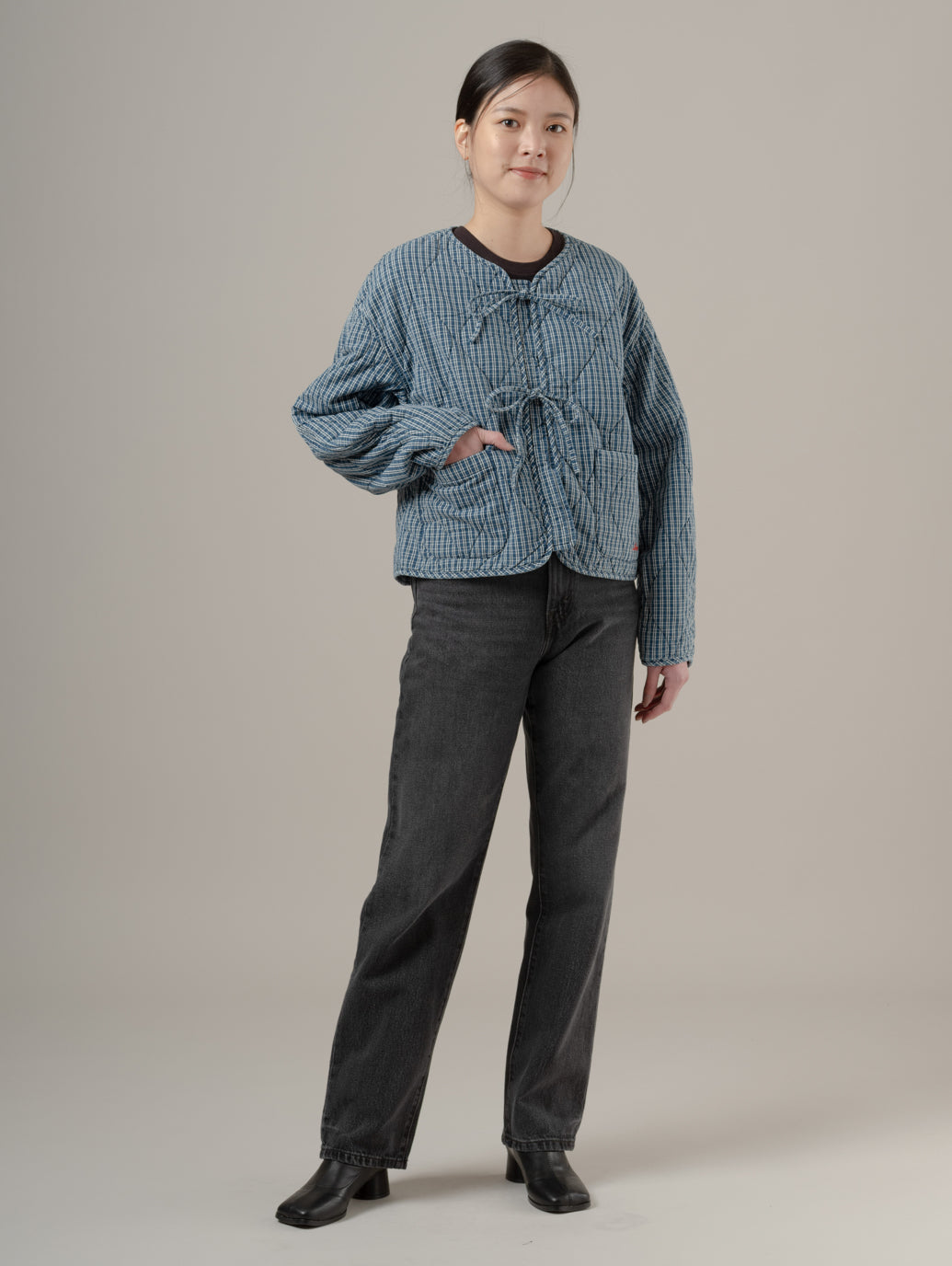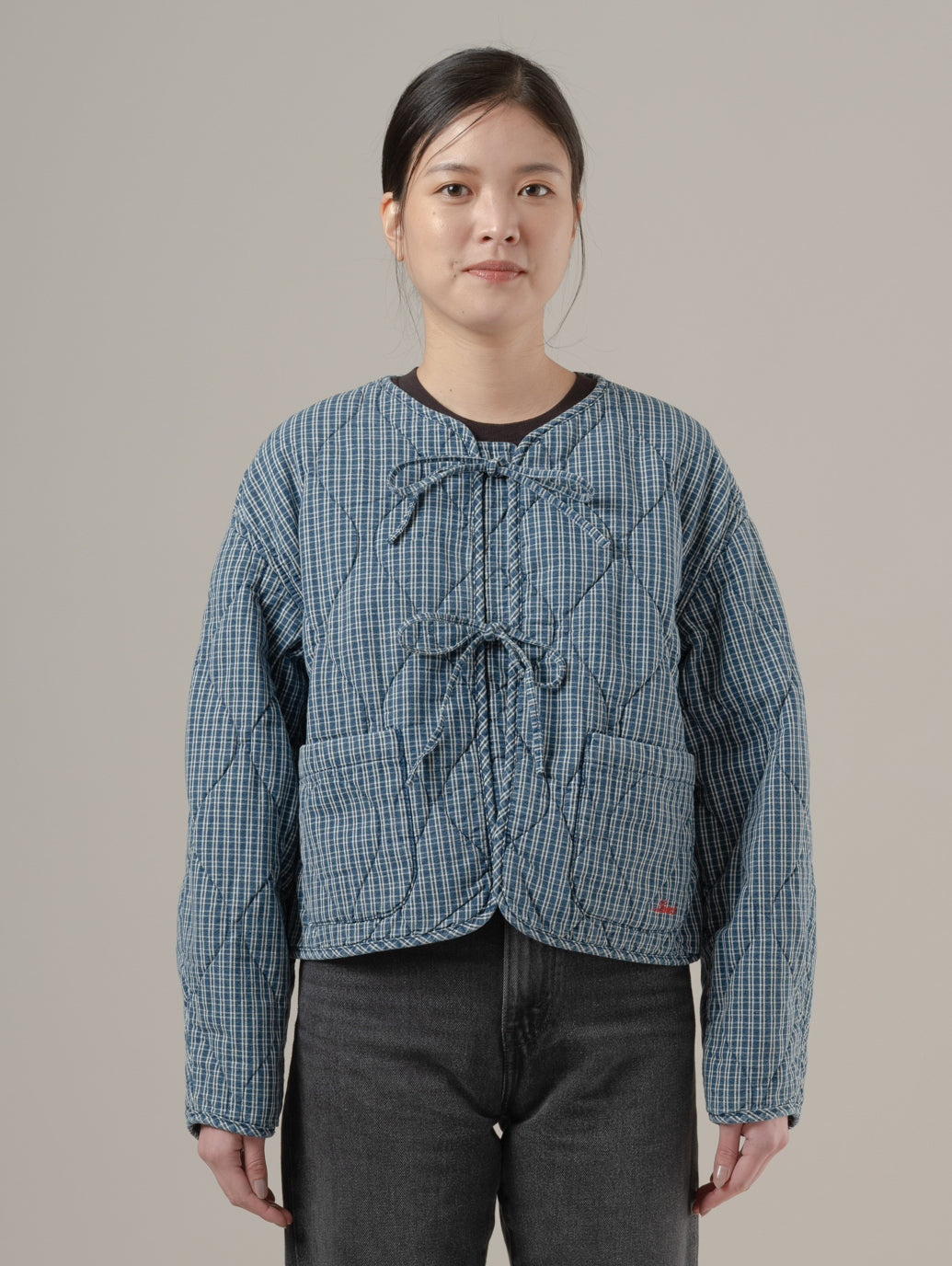 Rue Liner Jaketは首元のリボン付きで女性らしく、キルティング素材で軽くて暖かく、様々なコーデに合わせやすい一着です。 model:167cm B74 W61 H88 着用サイズ:S