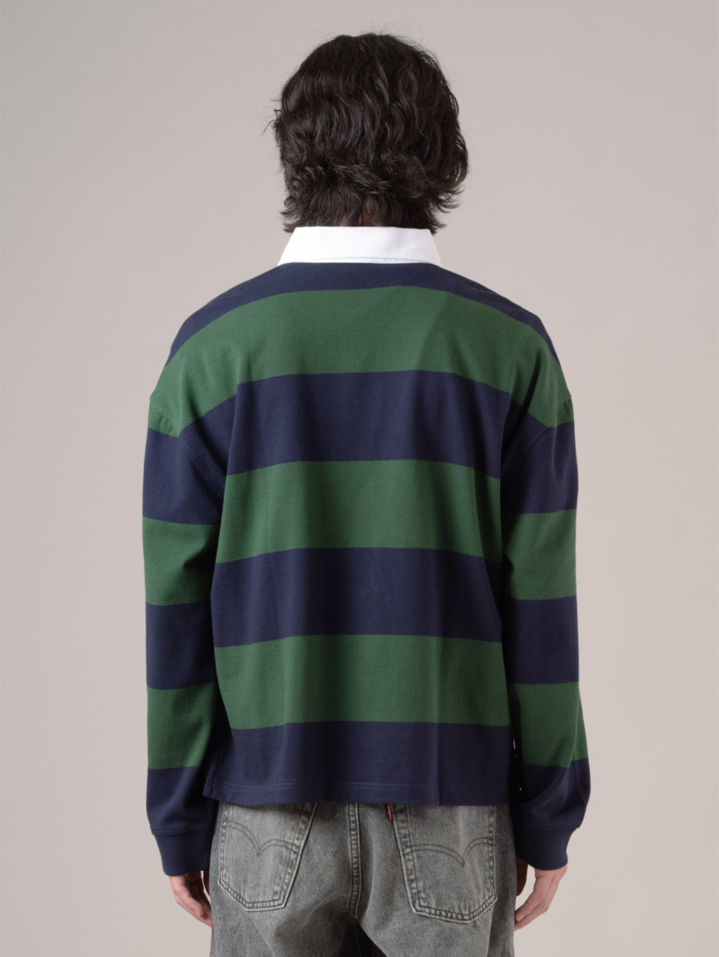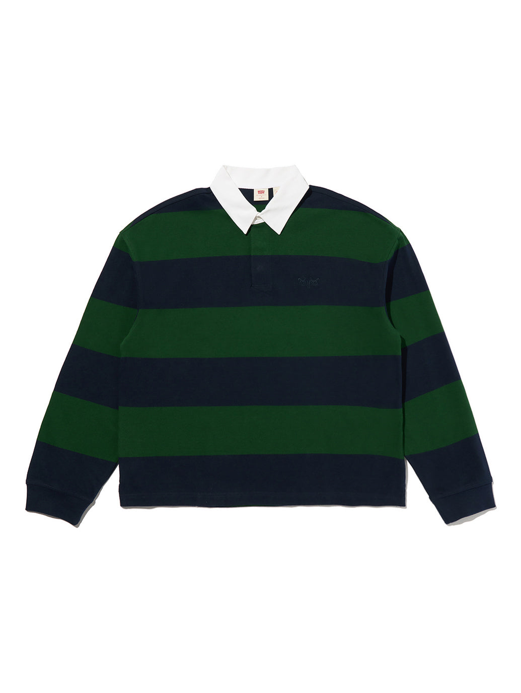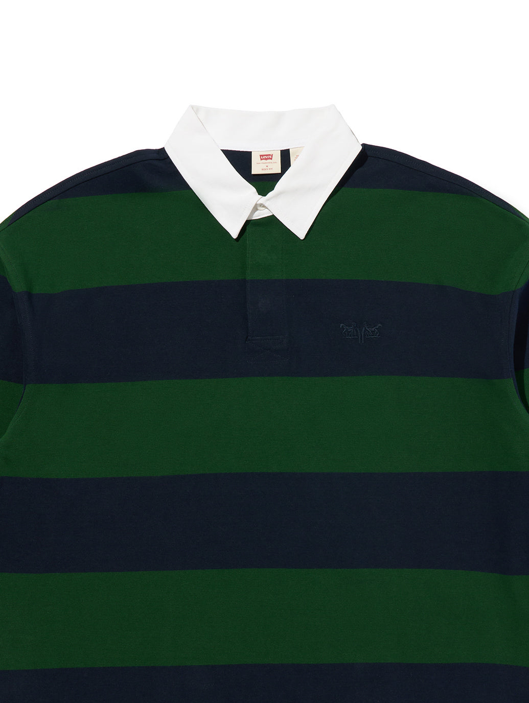 リーバイスでも人気のアイテムでもあるラグビーシャツから新しいアイテムが登場。ボタンダウンで程よいルーズフィット、そしてお馴染みのクラシックなネイビーとグリーンのストライプ。胸には同色でツーホースの刺繍があしらわれたデザインです。 model:177cm B83 W73 H82 着用サイズ:L