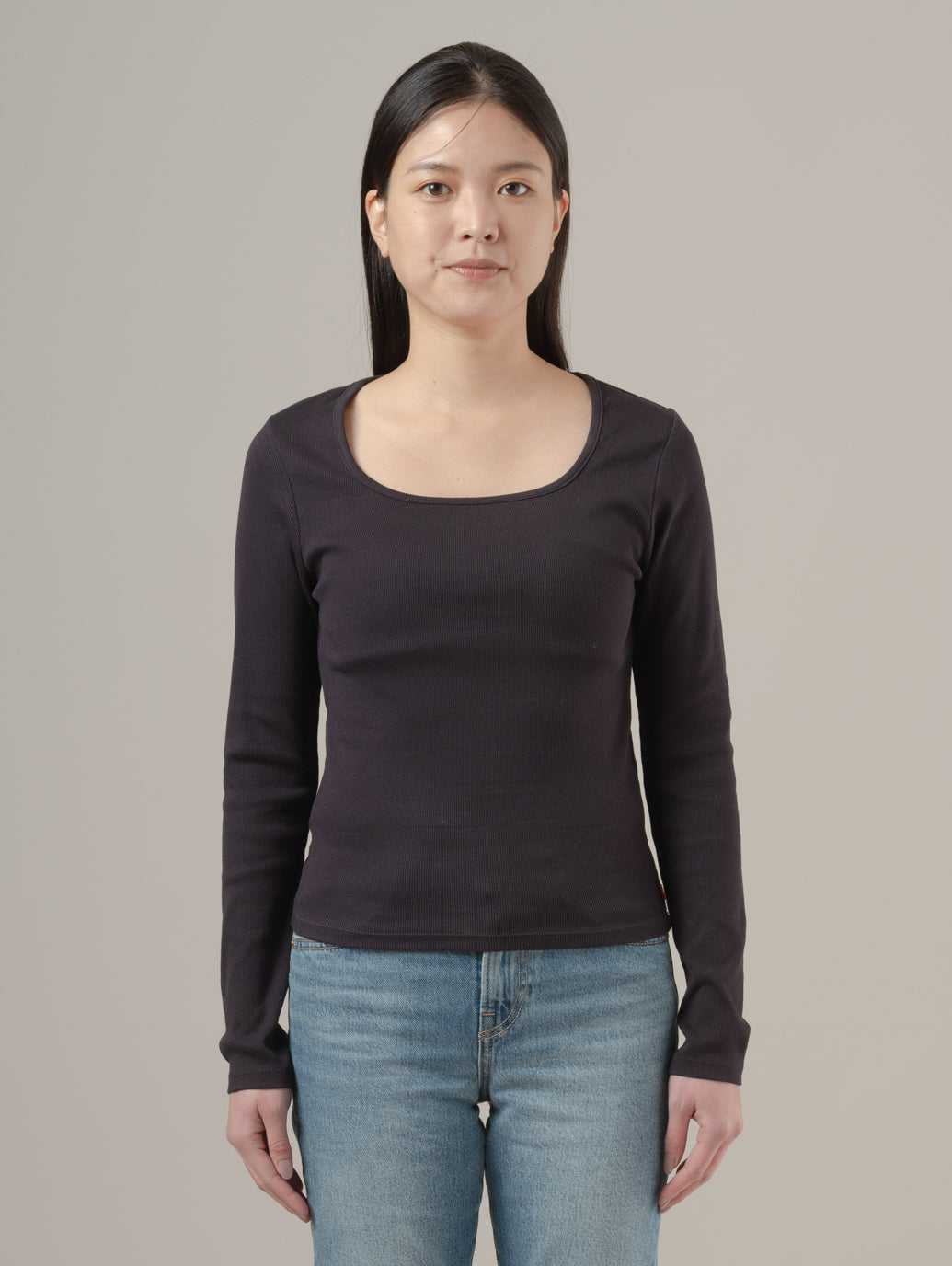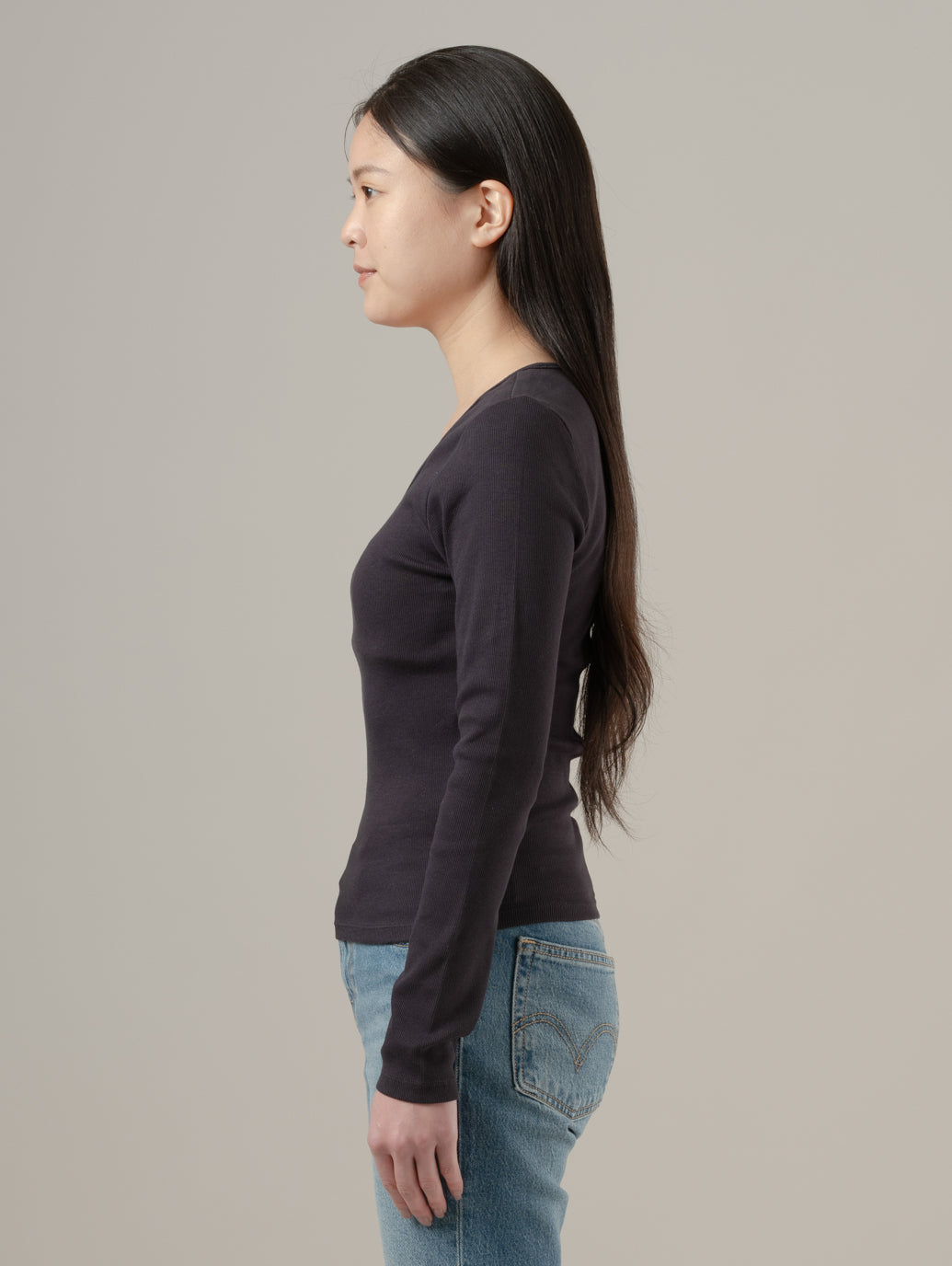 スクエアネック ロングスリーブ は、どんな時にも使える万能アイテム。デコルテを美しく見せるスクエアネック、フィット感のあるカット。 綿95%、ポリウレタン5%で伸縮性と柔らかなリブ編みニットに仕上げてます。 model:167cm B74 W61 H88 着用サイズ:S