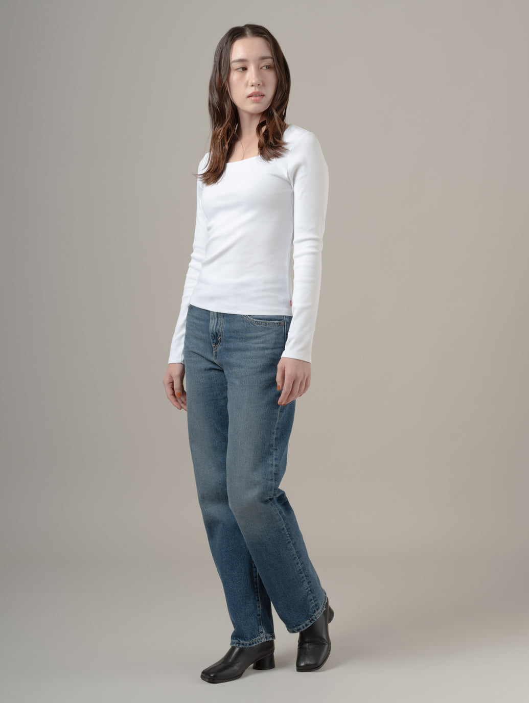 スクエアネック ロングスリーブ は、どんな時にも使える万能アイテム。デコルテを美しく見せるスクエアネック、フィット感のあるカット。 綿95%、ポリウレタン5%で伸縮性と柔らかなリブ編みニットに仕上げてます。 model:168cm B80 W63 H92 着用サイズ:S