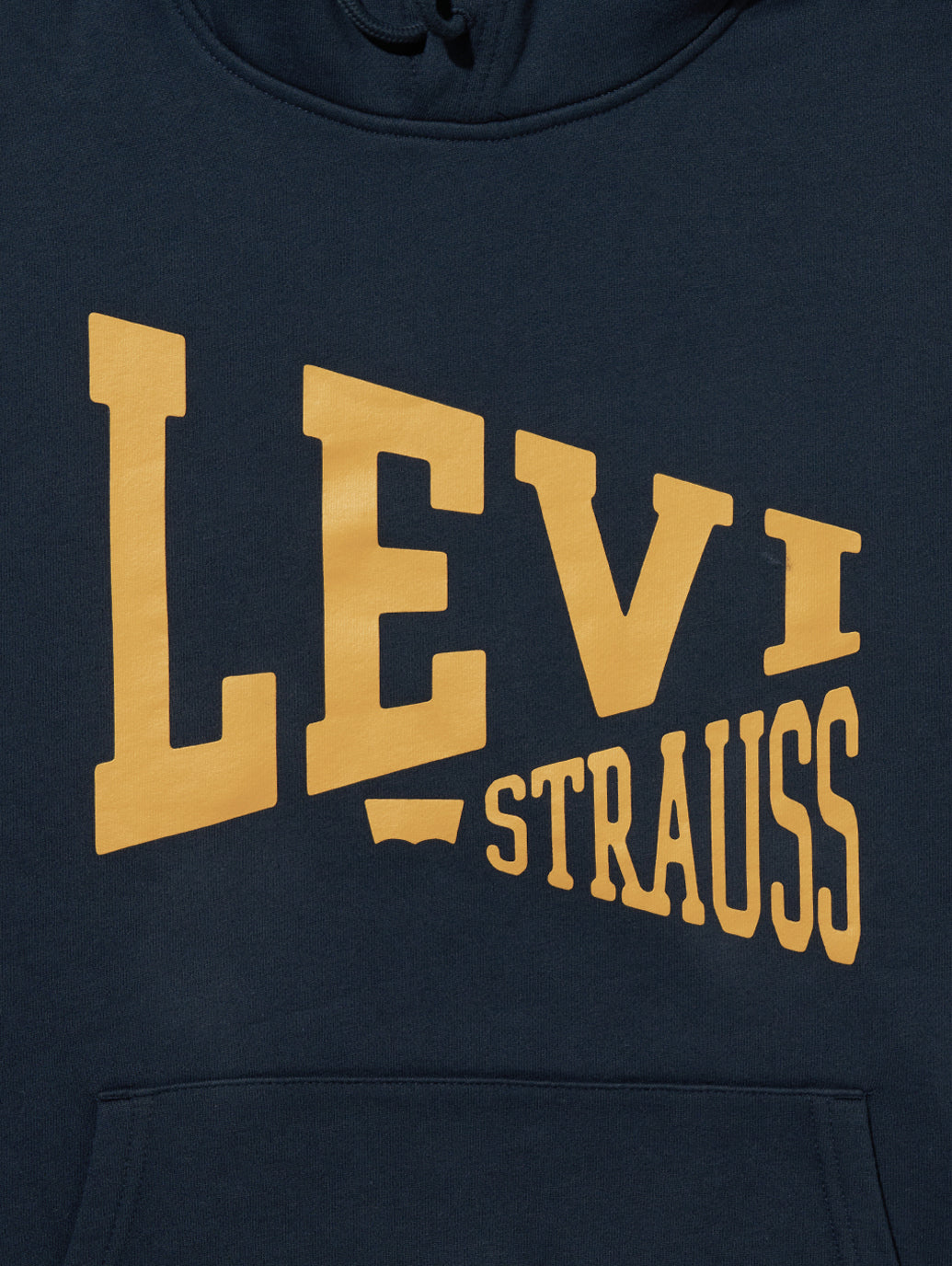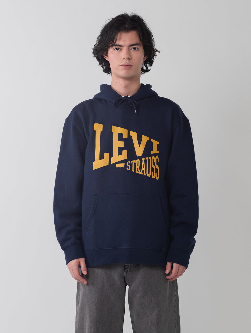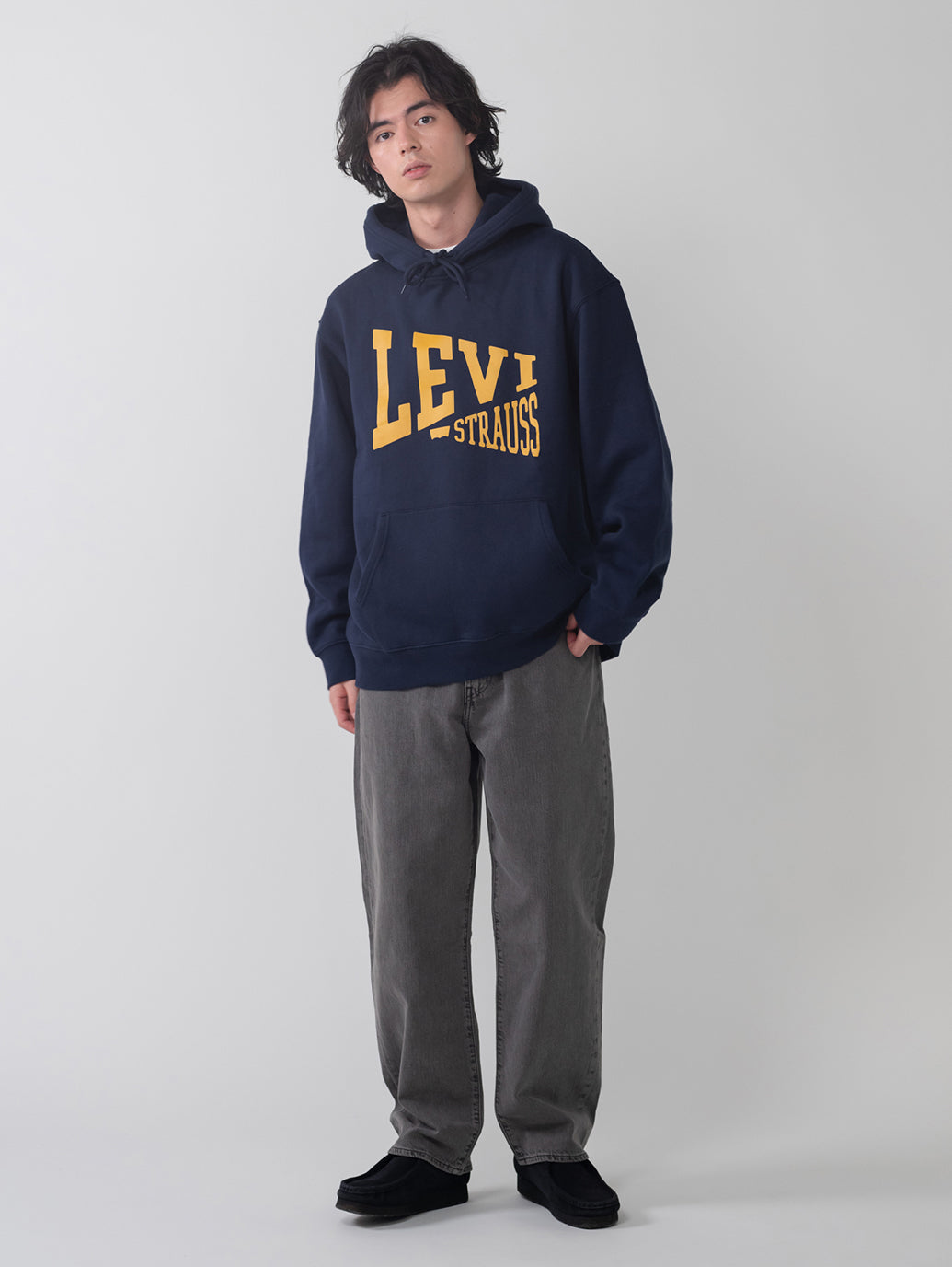 リラックスフィットを採用したグラフィックパーカー。ネイビーカラーのボディのフロントに大胆なロゴをあしらったインパクトのあるデザインです。秋冬シーズンはインナーとして、春先には主役として活躍する一着です。
