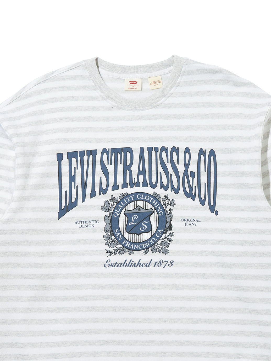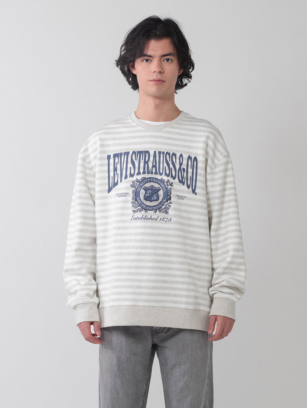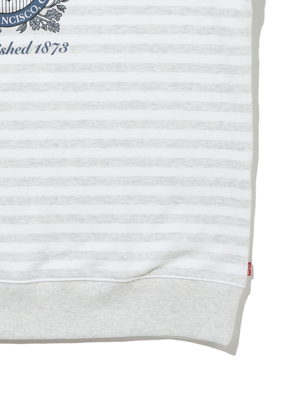 リラックスフィットを採用したクルーネックパーカー。ホワイトとグレーの薄っすらとしたボーダー柄のボディのフロントにロゴをあしらったデザインです。秋冬シーズンはインナーとして、春先には主役として活躍する一着です。