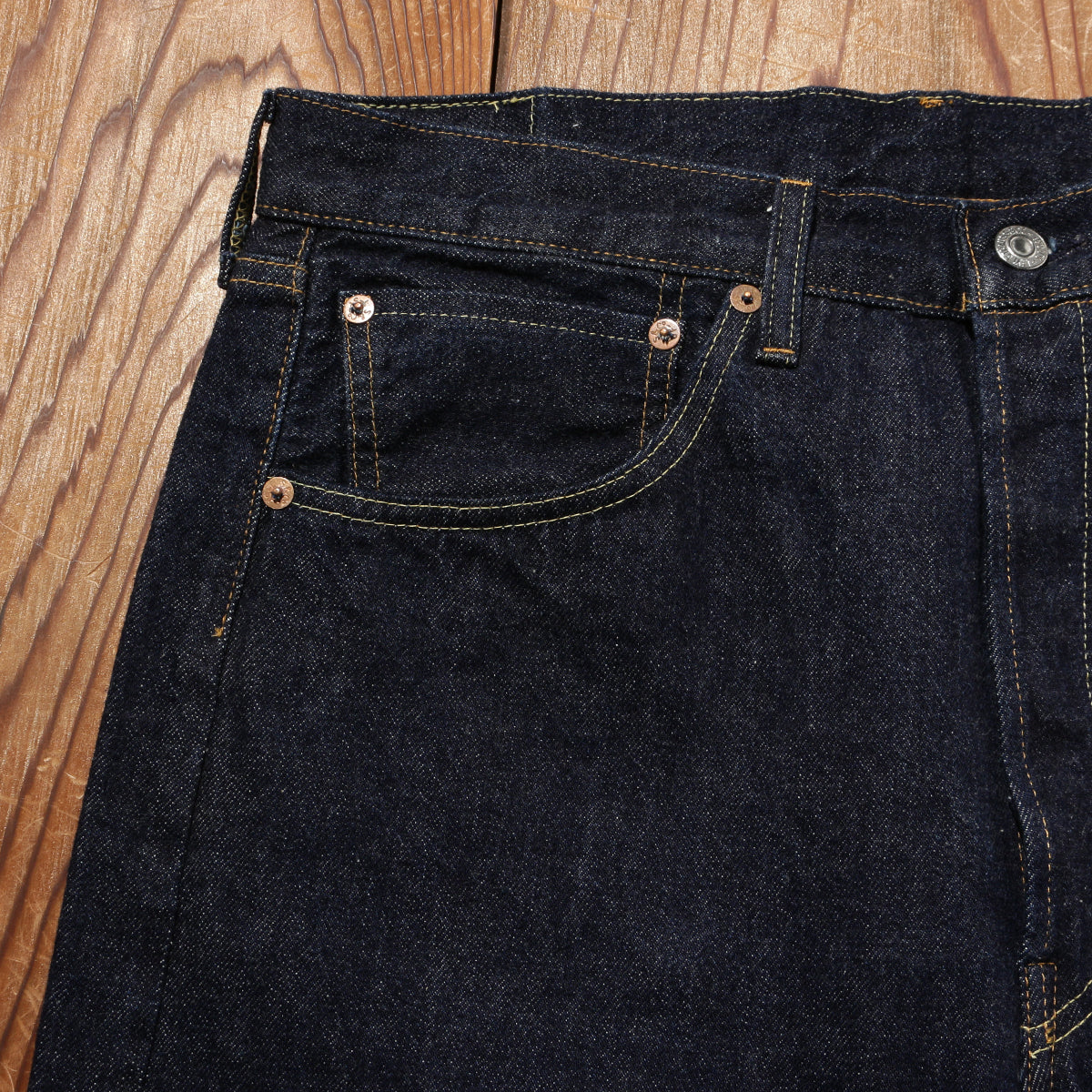 生地はデニムの原点ともいえる、整理加工をしていない織り上げたそのままの生地(キバタ)を使用。濃紺のピュアインディゴで染色しています。