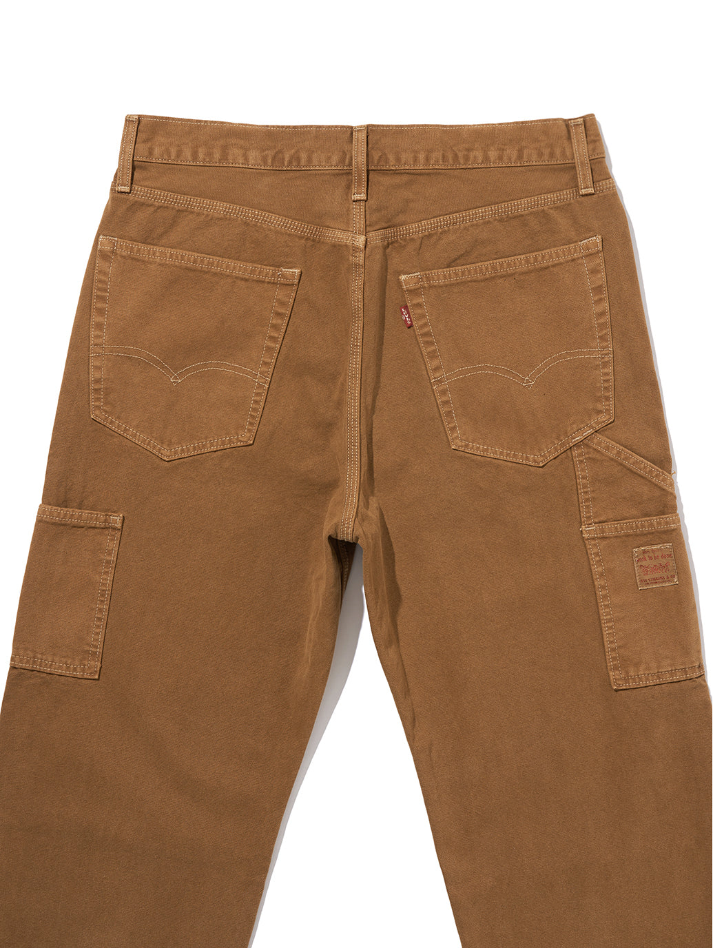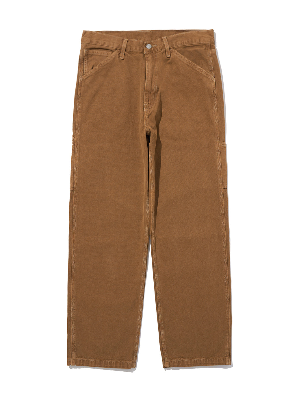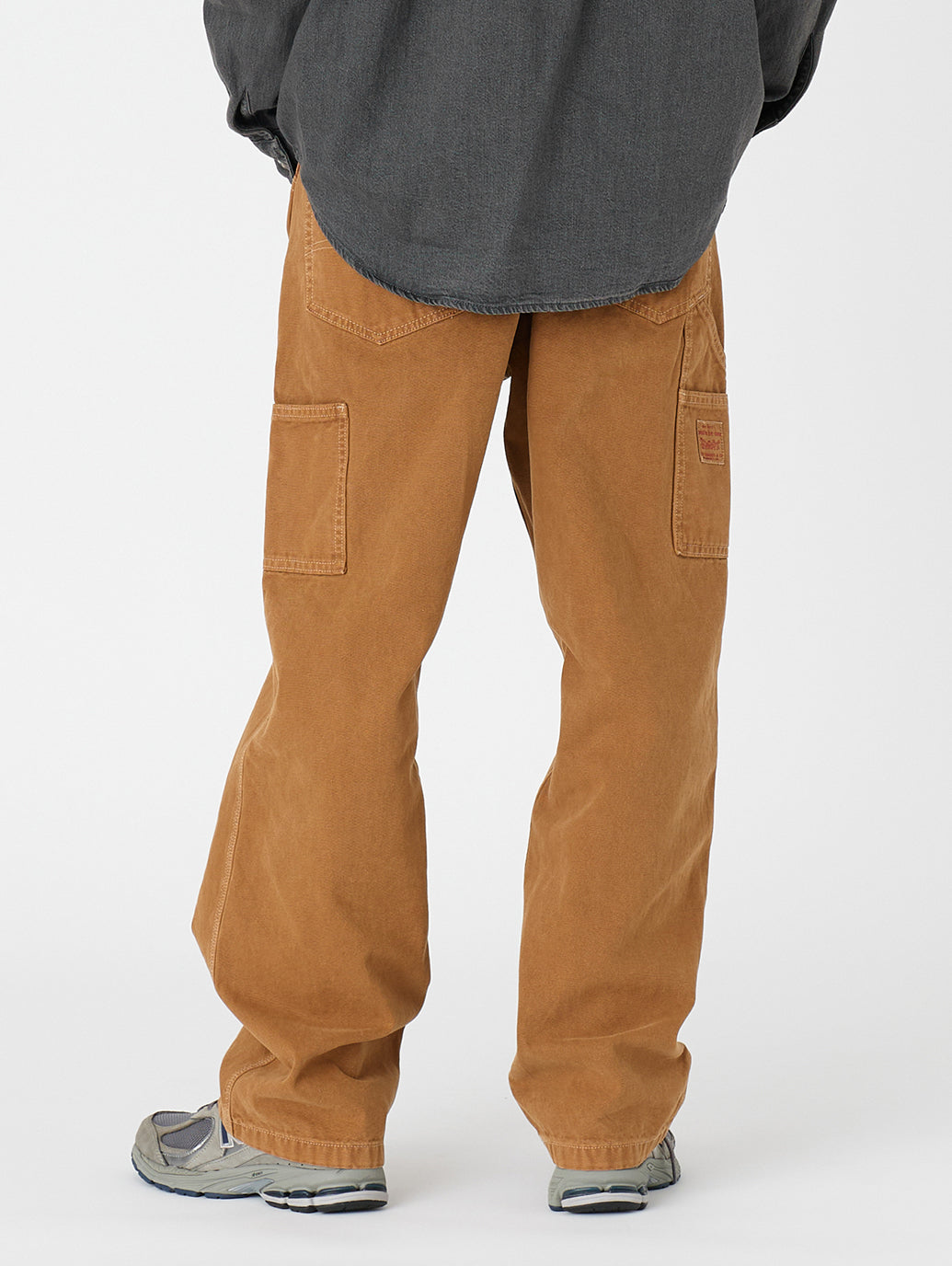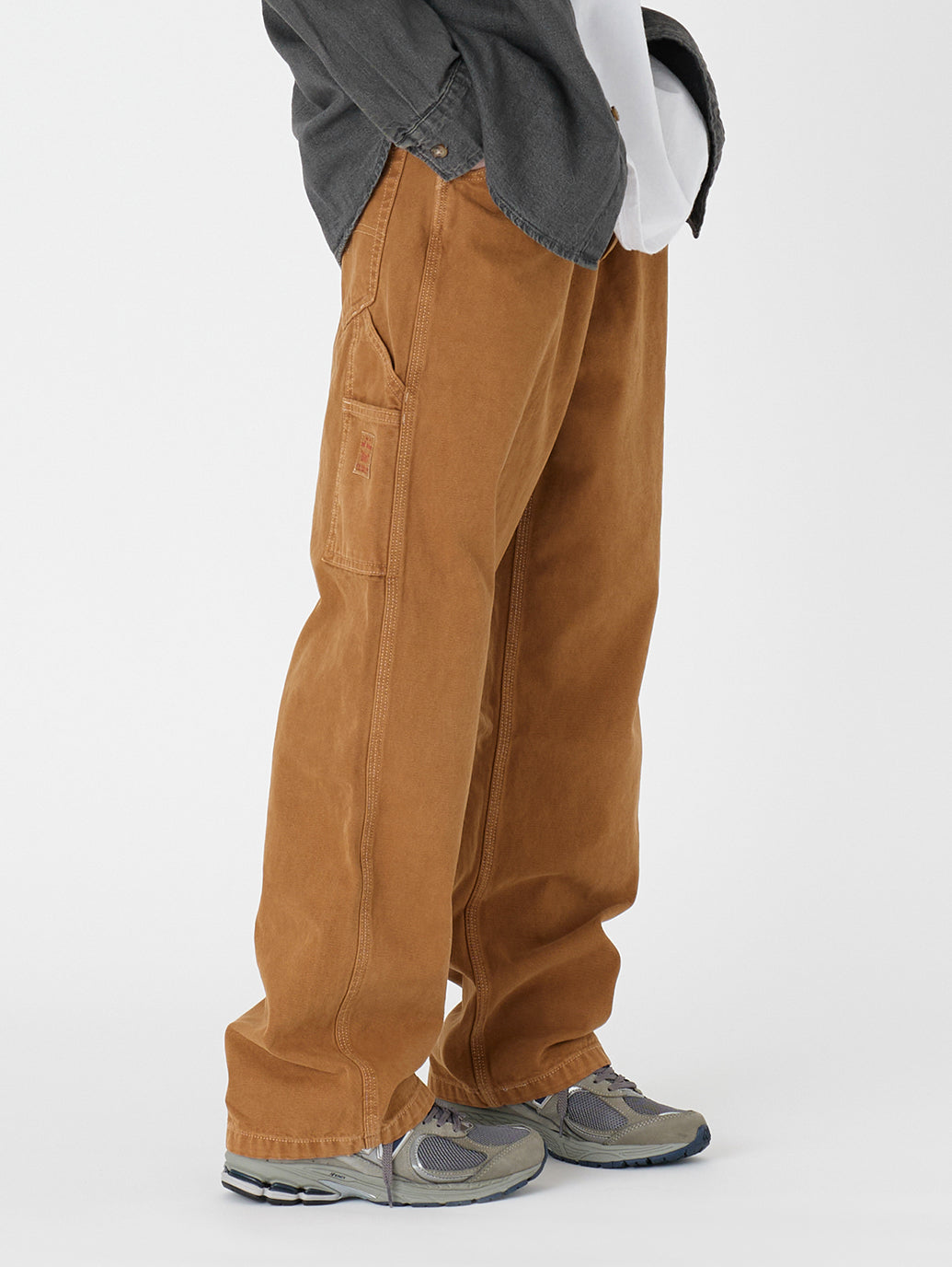 両サイドには工具入れ用としてのポケットも配し、丈夫な綿100%の生地でカーペンターパンツの特徴をしっかりと落とし込んでいます。そして、モダンで全体的にルーズなフィットとガーメントダイで染めた味わいのあるブラウンカラー。お気に入りのグラフィックTシャツまたはダウンと合わせて。あらゆる着こなしを楽しめます。