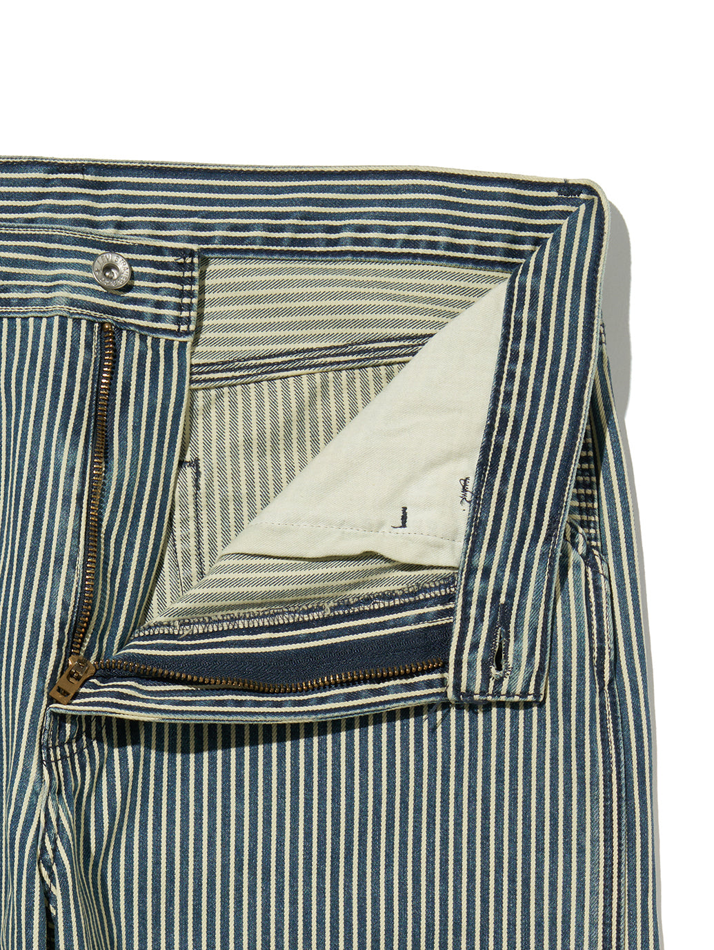 両サイドには工具入れ用としてのツールポケットも配し、丈夫な綿100%の生地でカーペンターパンツの特徴をしっかりと落とし込んでいます。モダンで全体的にルーズなフィットとヒッコリーストライプ柄も特徴で、意外と幅広い着こなしに馴染んでくれる一本です。