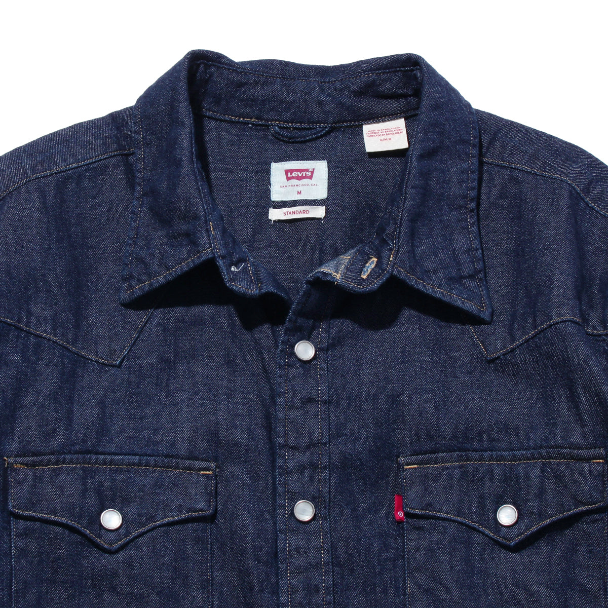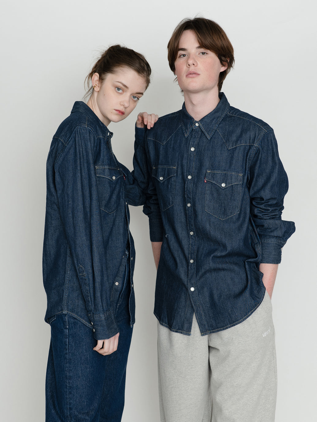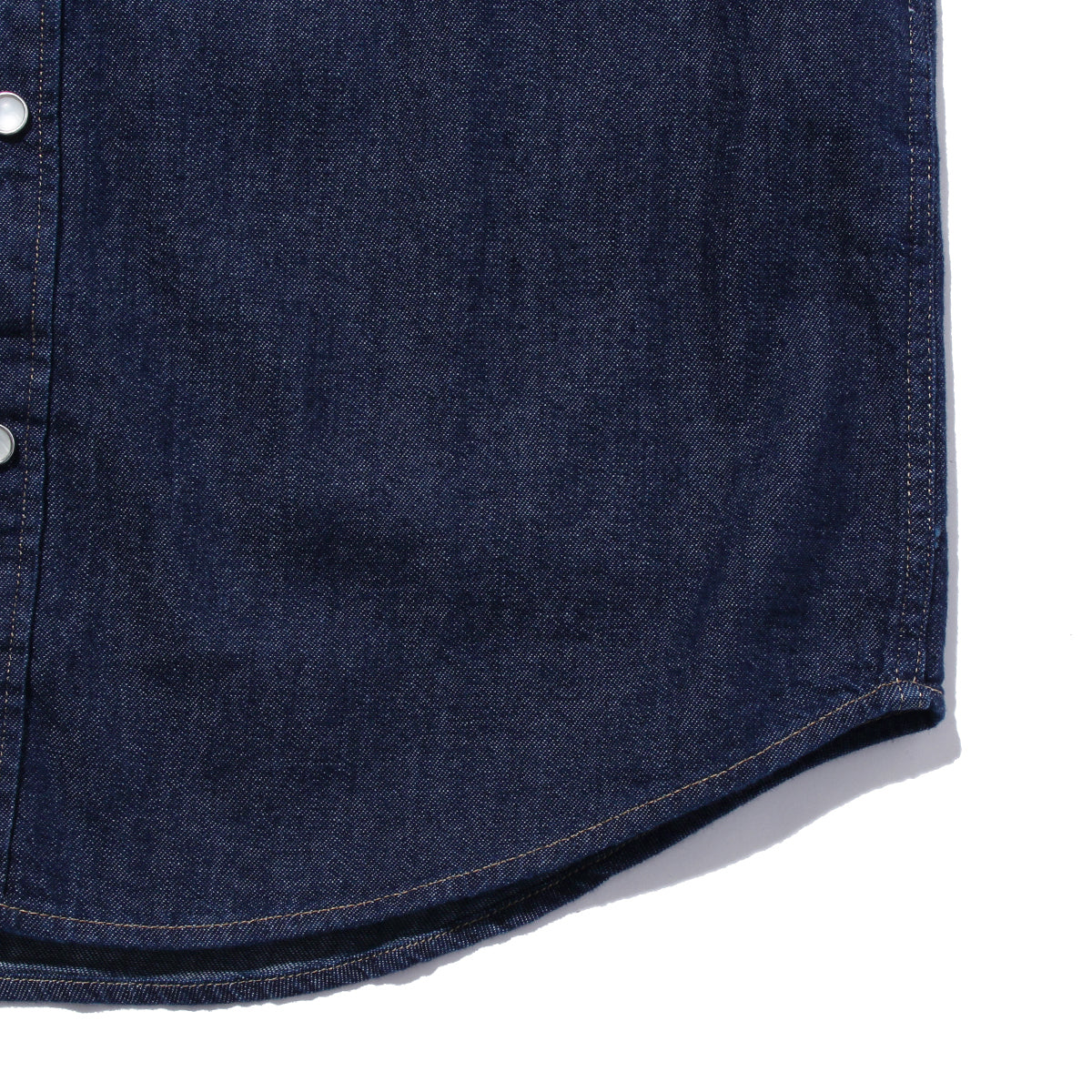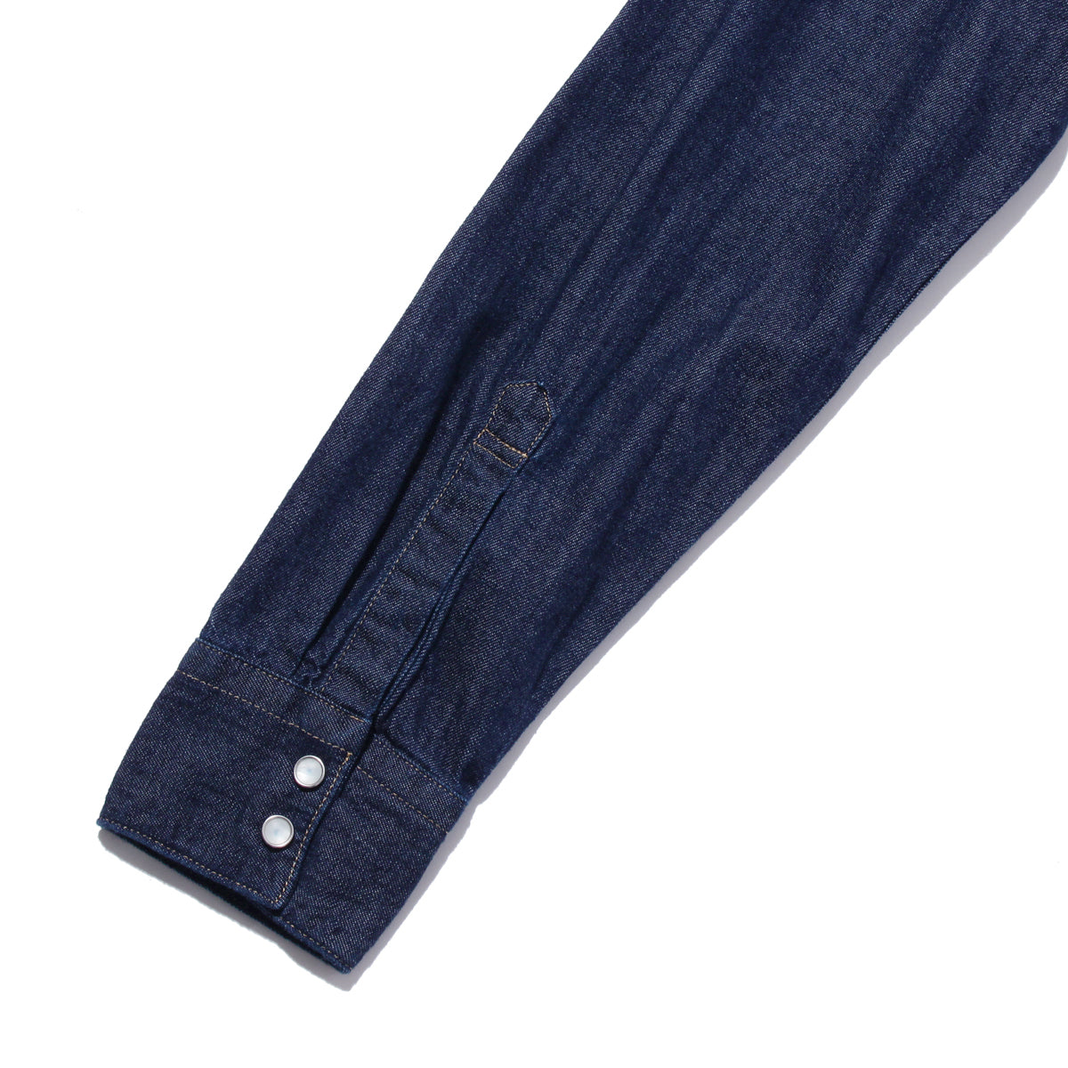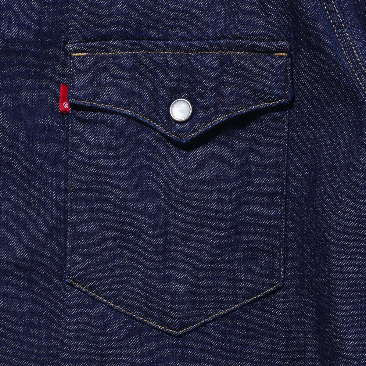 コットン100パーセント、長袖デニムのウエスタンシャツ。オリジナルのウエスタンディテール。オリジナルのウエスタンのディテール。カーブを入れたシャツテールヘム。胸元にはスナップポケットが2つ。アイコニックなレッドタブ付き。