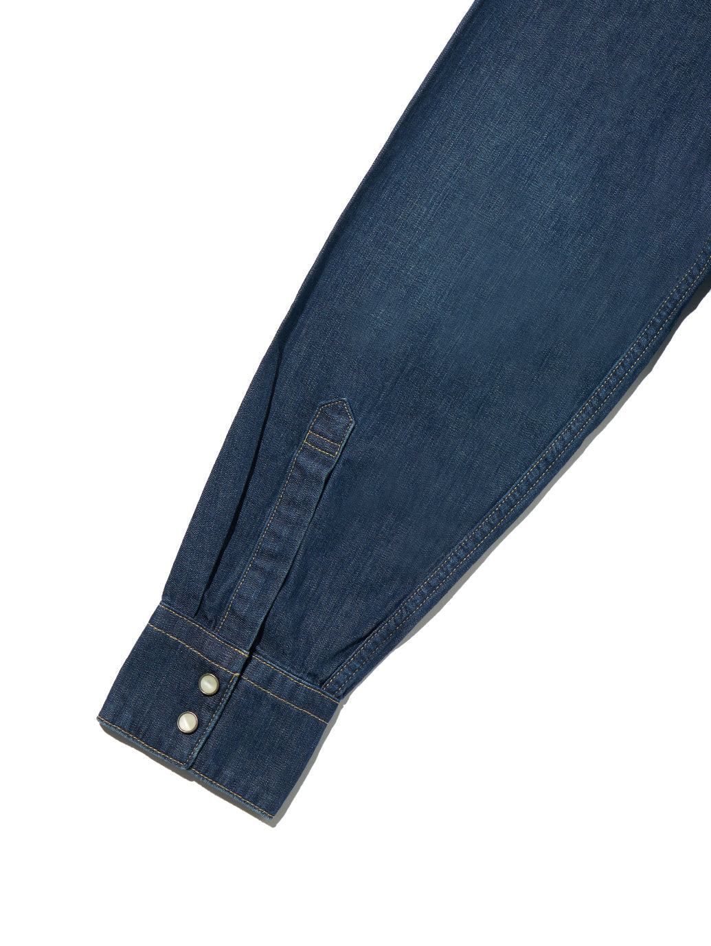 アメリカ西部に深くルーツを持つブランドとしての定番アイテムの一つのウエスタン シャツ。クラシックに忠実な綿100%のデニム地、バーストウスタンダードフィット、特徴的なスナップ前立て、尖ったヨーク、カーブした裾が特徴です。デニムのセットアップは勿論、チノやワークパンツにも合わせやすく着回しの効く一着です。