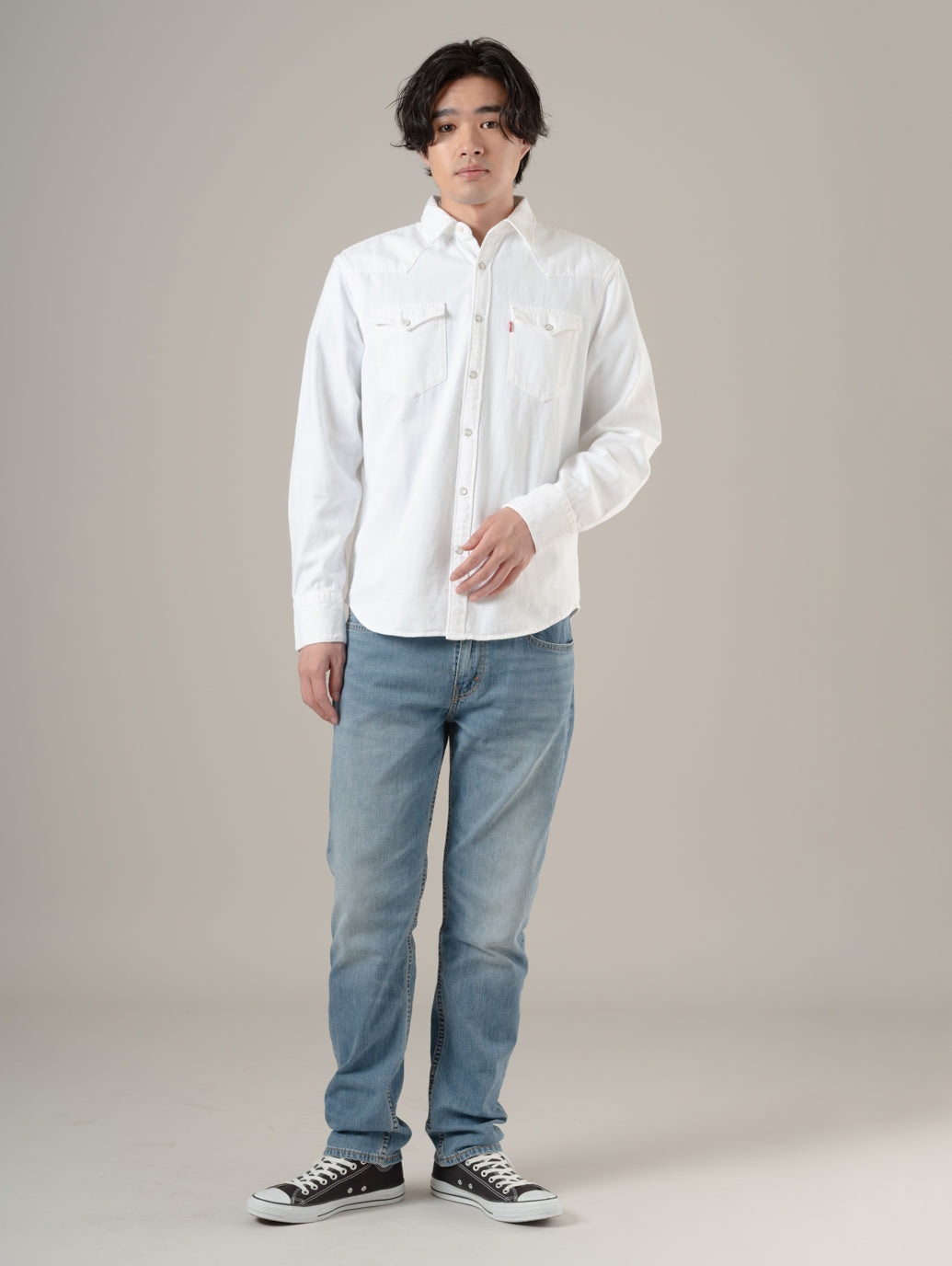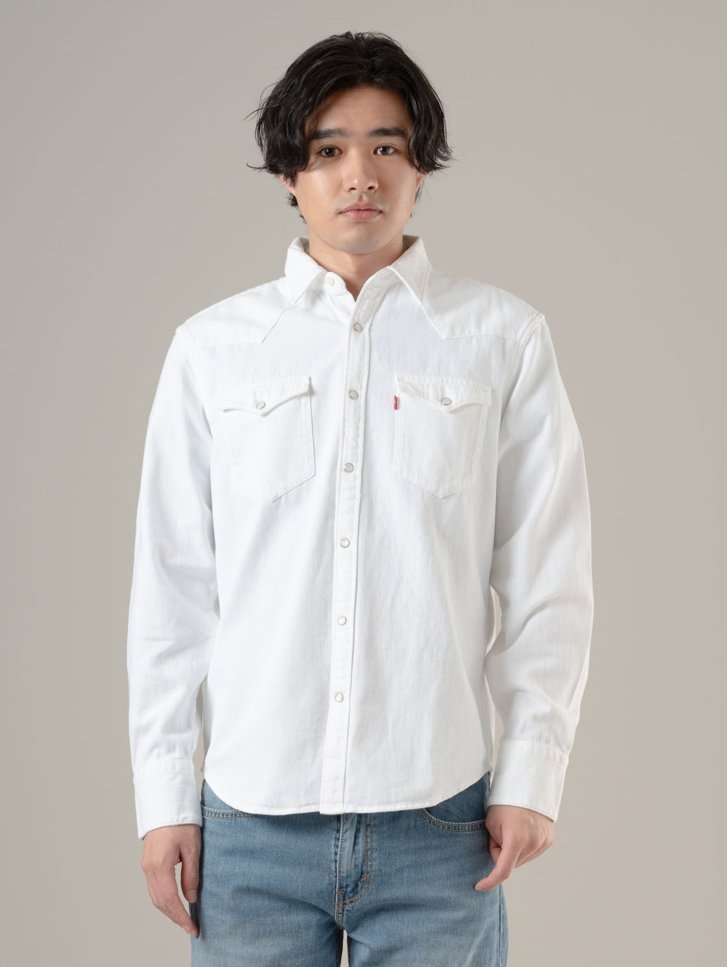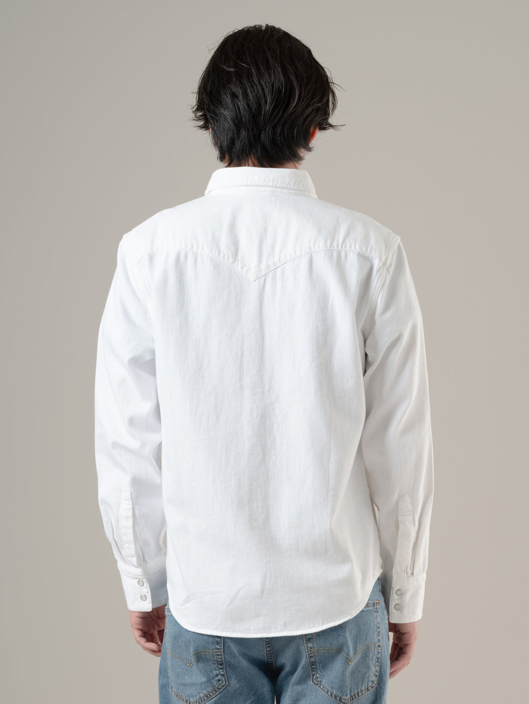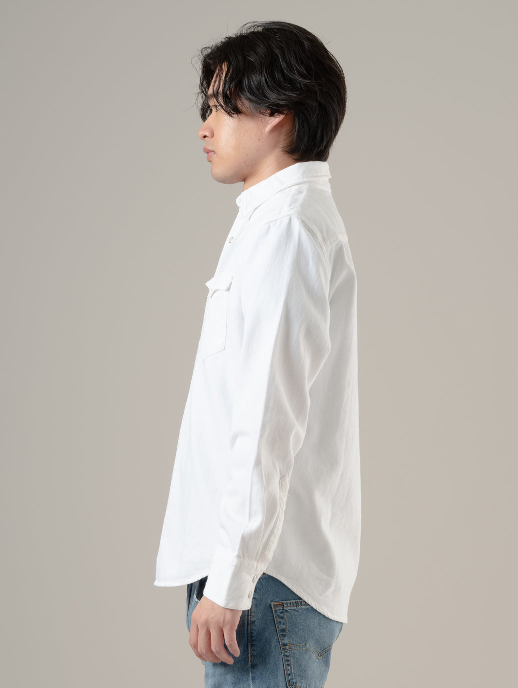 デニムの長袖ウエスタンシャツ。オリジナルのウエスタンのディテール。カーブを入れたシャツテールヘム。