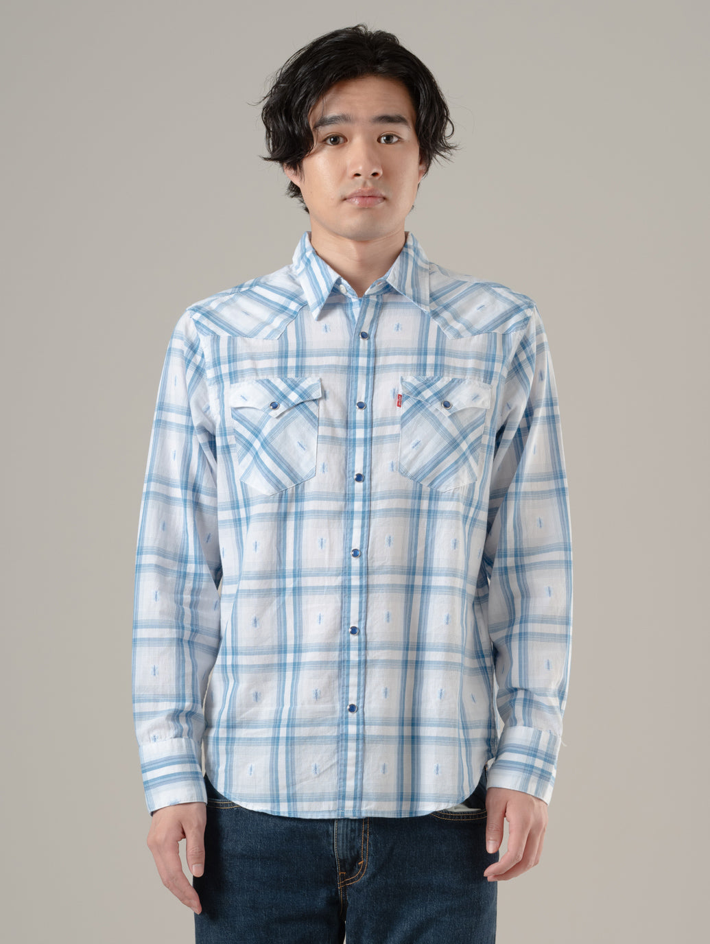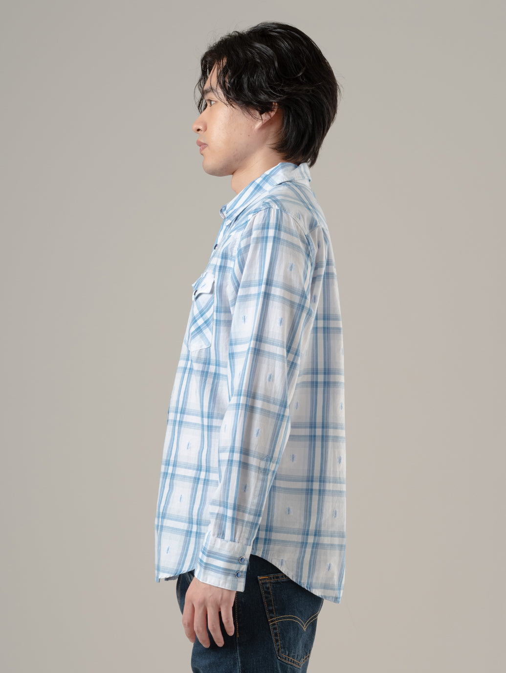 デニムの長袖ウエスタンシャツ。オリジナルのウエスタンのディテール。カーブを入れたシャツテールヘム。