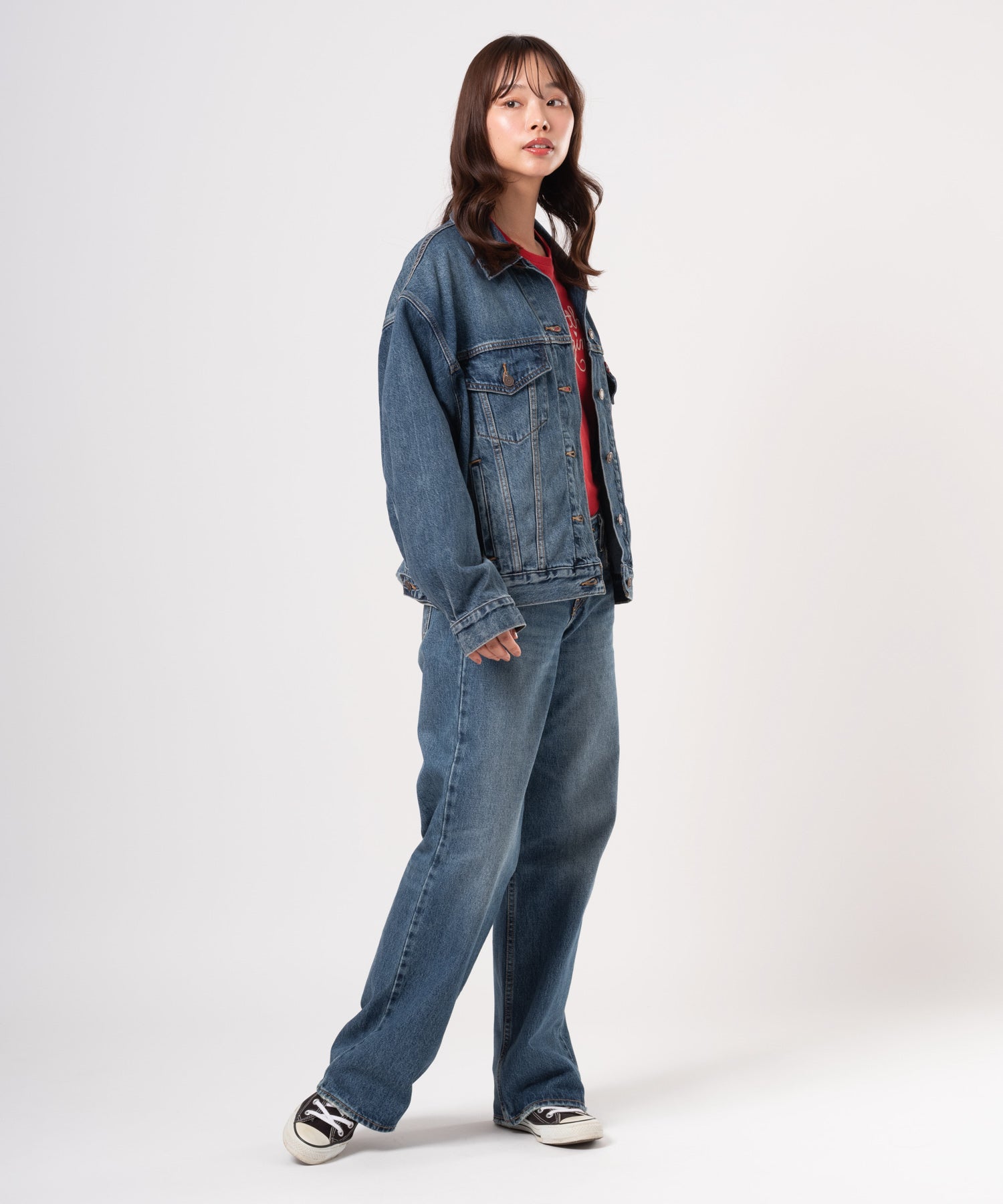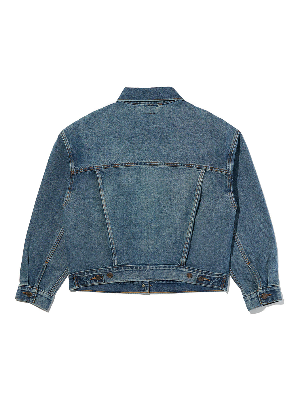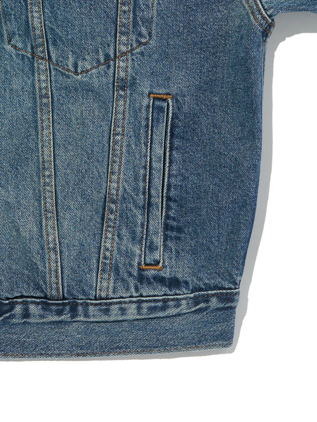 シンプルなシェイプで、着やすいウェイトまわりのデザインのデニムジャケット。ボディラインに沿ったレトロなカットのシルエットが90年代風の雰囲気を演出します。同じカラーのボトムスと合わせてセットアップが完成します。