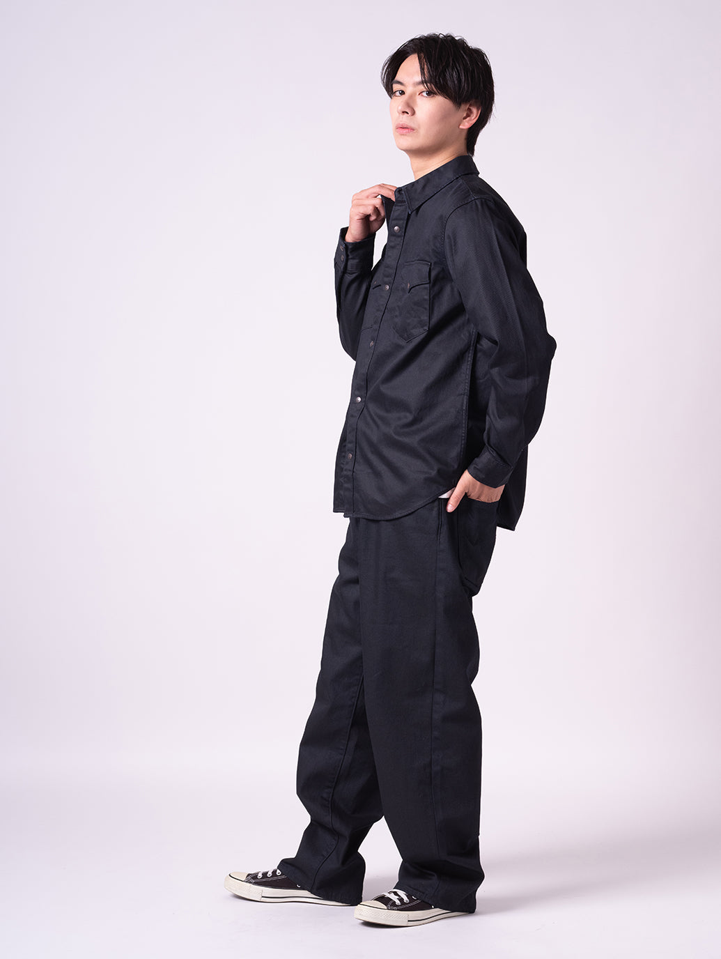 綿100%のブラックカラーデニムのゆとりのあるリラックスシルエットを採用して。チノやワークパンツにも合わせやすく着回しの効く一着です。